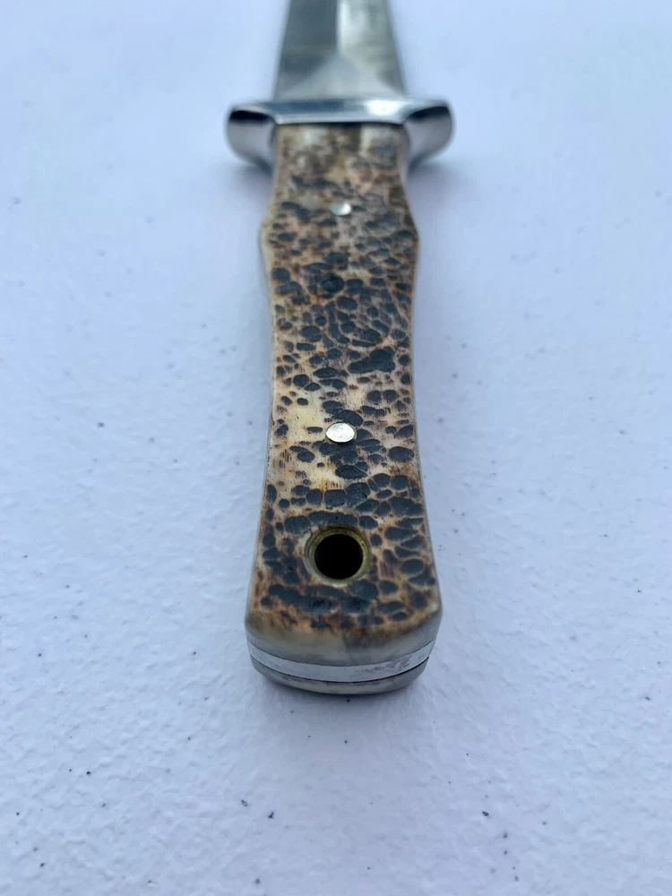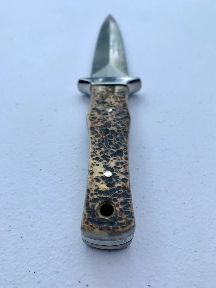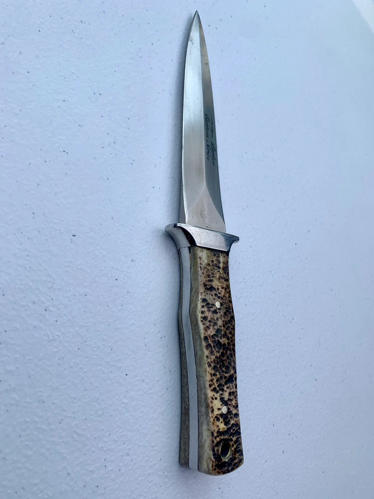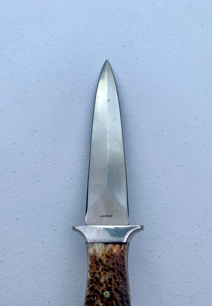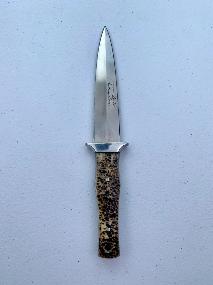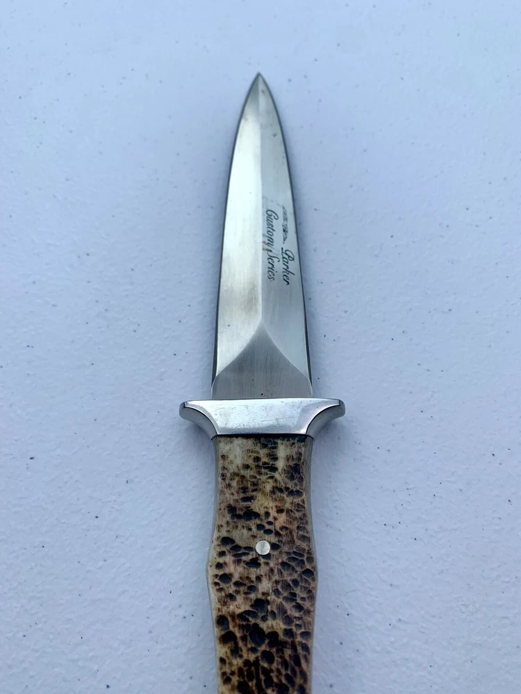 Parker Cutlery Company Custom Series fixed blade dagger knife. This is a knife sale only. There is no box/sheath. Knife measures 9”in overall length, blade length is 3-7/8”. Blade etched with Parker, eagle logo and Custom Series. Opposite side of tang stamped with Japan. Nickel bolster and pins and bone handles. This knife is in excellent condition and has never been carried or used. Knife has been securely kept in private collection for many years. B1-0645