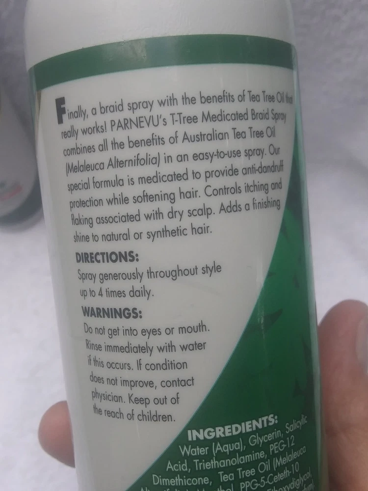 Parnevu T-TREE Braid Spray~Lot of 2~Natural & Synthetic Hair~Controls Itch~12 oz Medicated to control itching & flaking Anti-dandruff conditioner Cool feel No one here smokes but a couple of the cats are pretty heavy drinkers. Payment is due within 3 days. If you need longer, please message me. I package well and ship quickly. I happily combine shipping on multiple purchases within the same week. If you need to return an item, please use Ebay Returns. If you have a problem with an item, please get in touch with me before going through Ebay or leaving feedback. I'm sure we can find a solution. Please remember I'm human and sometimes make a mistake.
