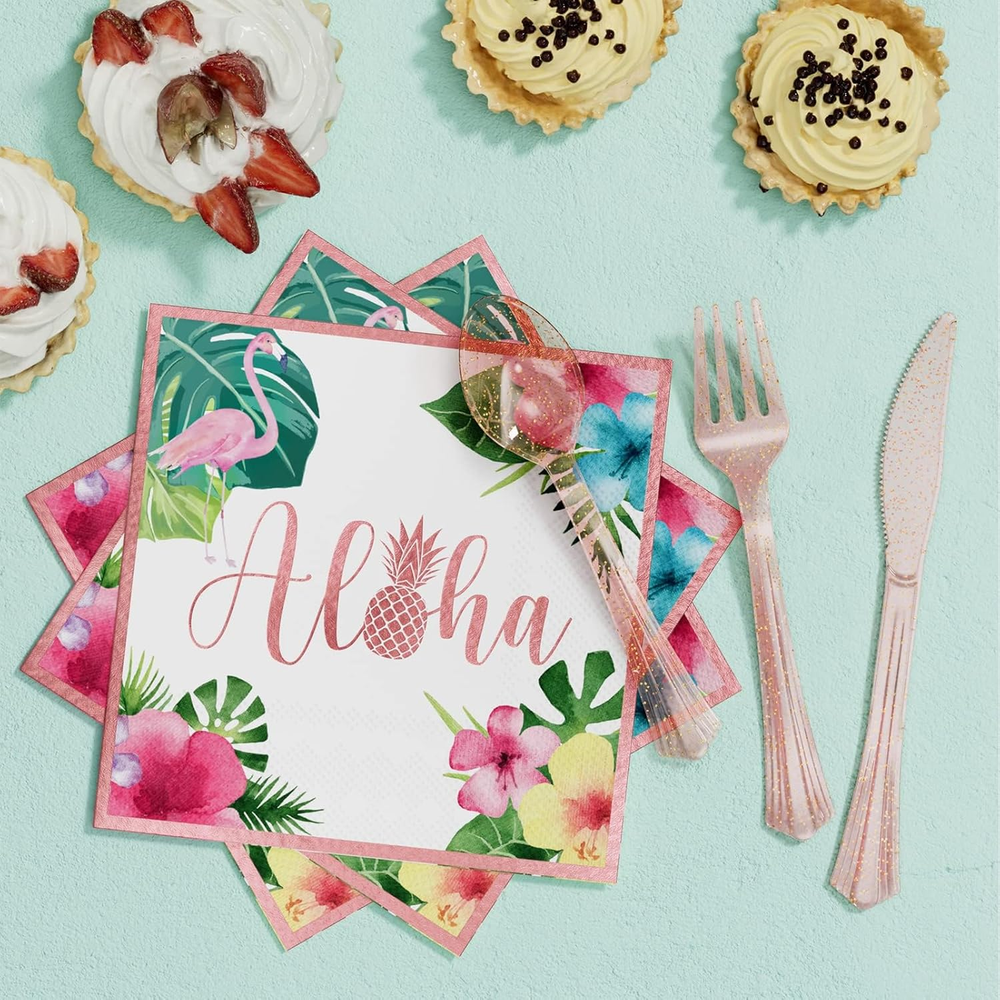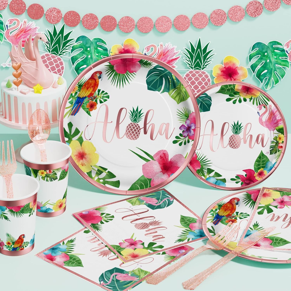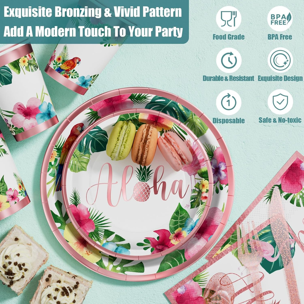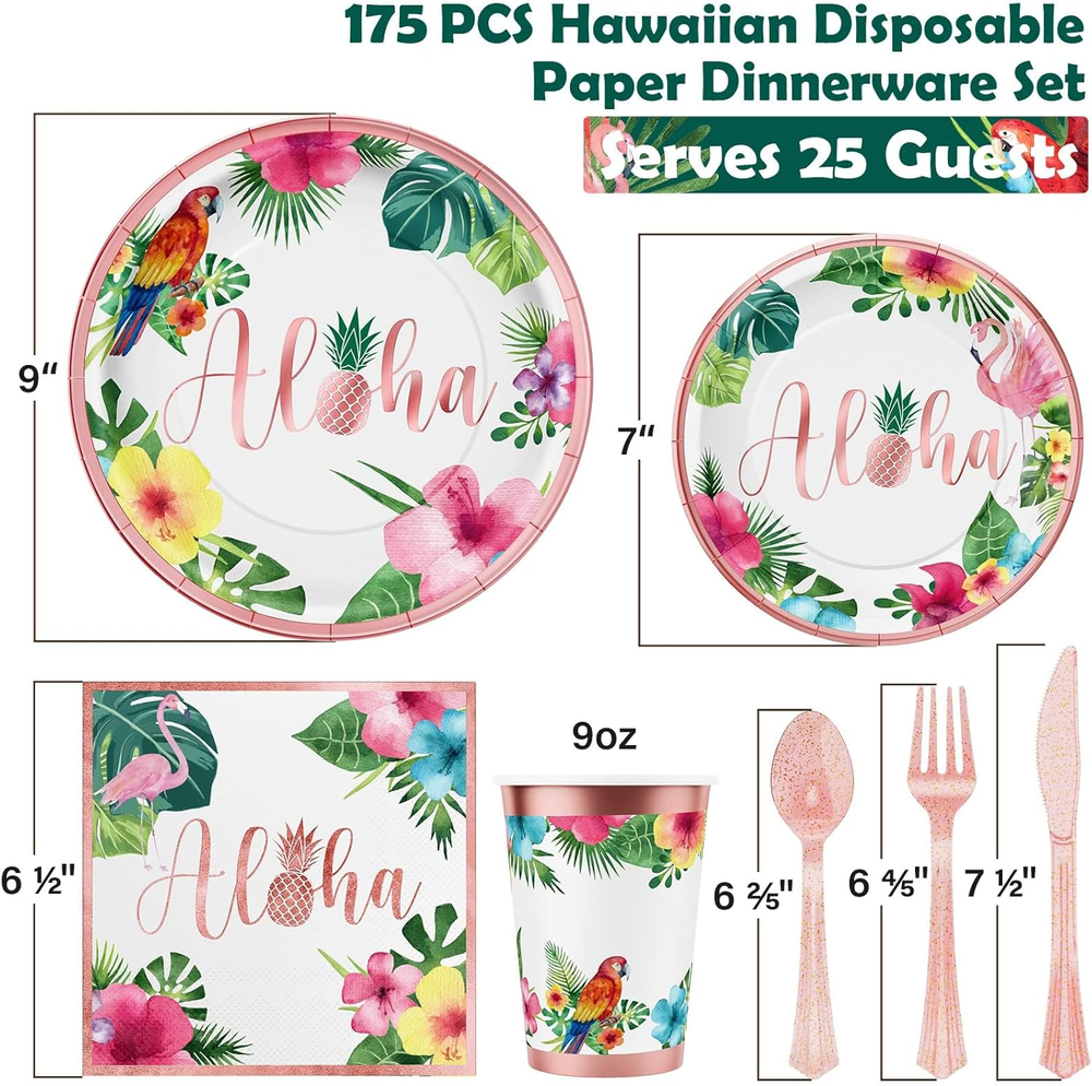 175 PCS ROSE GOLD HAWAIIAN PARTY SUPPLIES DINNERWARE SET: The package includes 25 x 9inch luau disposable dinner plates, 25 x 7inch dessert plates, 25 x 9oz paper cups, 25 x 6.5inch aloha paper napkins, 25 rose pink plastic forks, 25 knives and 25 spoons. These rose gold hawaiian luau party decorations are an excellent way to entertain guests, but also making them feel special with a treat to go home with. Durable Aloha party supplies sets allow you to SERVES 25 GUEST at one time PREMIUM QUALITY: Our rose gold hawaiian themed birthday party decorations supplies set all luau paper plates, cups and napkins are made of heavy duty paper, 100% non-toxic, which sturdy and won't fold or teared easily, perfect for cake, sandwiches, salad, fruit, etc. Disposable paper cups can withstand cold and hot drinks without worrying about leakage. Throw a memorable party with our luau decorations, “wow” your guests. NOTE: Not Microwave Safe ELEGANT & MODERN DESIGN: The tropical element and rose gold collocation design of the hawaiian party plates is very elegant & exquisite. The luau party decorations all paper plates, cups and napkins are printed with rose gold “Aloha” bronzing process while adding an vivid flamingo palm leaves patterns, which festive atmosphere t o the celebration. Along with rose pink plastic forks knives and spoons, the whole luau party supplies presents a lovely texture that adds a modern feel to your party EFFORTLEE & ENJOY YOUR PARTY: No one likes to clean up after a party, which is why we designed this rose gold plates and napkins hawaiian party supplies! Featured with disposable paper & plastic, all party plate, cups, napkin and flatware no need to clean up, you can throw them away when you clean up after an event or party. SAVE TIME AND EFFORTLEE. These aloha birthday party decorations is perfect choice for summer holiday parties. Your only job will be focused all the amazing moments in party PERFECT FOR EVERY OCCACION: Our hawaiian aloha party plates and napkins party supplies sets is perfect for almost occasion: summer beach birthday party, tropical theme party, tropical baby shower, moana birthday party, aloha birthday party, aloha baby shower, hawaiian theme birthday party, hawaiian baby shower, rose gold birthday party, summer pool party or any garden yard party even. If you are not 100% satisfied with your, feel free to send us your issues Are you tired of cleaning up the dishes after the party? The rose gold tropical boho party decorations supplies is a great choice to decorate your parties. Why you choose Tiblue Dinnerware decorations set? - Disposable dinnerware set all tropical luau paper plates, cups and napkins are composed of 100% non-toxic paper, which is safe for your family and guests. - No clean up design, all disposable paper, all plate, cups can throw them away when you clean up after an event or party. SAVE TIME AND EFFORTLEE. - Hawaiian luau party plates designed with fantastic rose gold “Aloha” bronzing process and vivid tropical patterns, perfect aloha decorations for any summer party tableware, full elegant & modern atmosphere to the celebration. VALUE PARTY SUPPLIES SET - Mix and match to create the perfect party decorations. Rose gold Aloha party decorations elevating your party setting with hawaiian dinnerware set that will complement any party theme. - Perfect for summer beach birthday party, tropical theme party, moana birthday party, aloha birthday party, rose gold hawaiian theme birthday party or any garden yard party even. PACKEGE INCLUDE: 25 X Plastic Forks 25 X Plastic Knives 25 X Plastic Spoons 25 X 9oz Paper Cups 25 x 9inch Dinner Plates 25 X 7inch Dessert Plates 25 X 6.5inch Paper Napkins NOTE: Do not microwave plates and cups please.