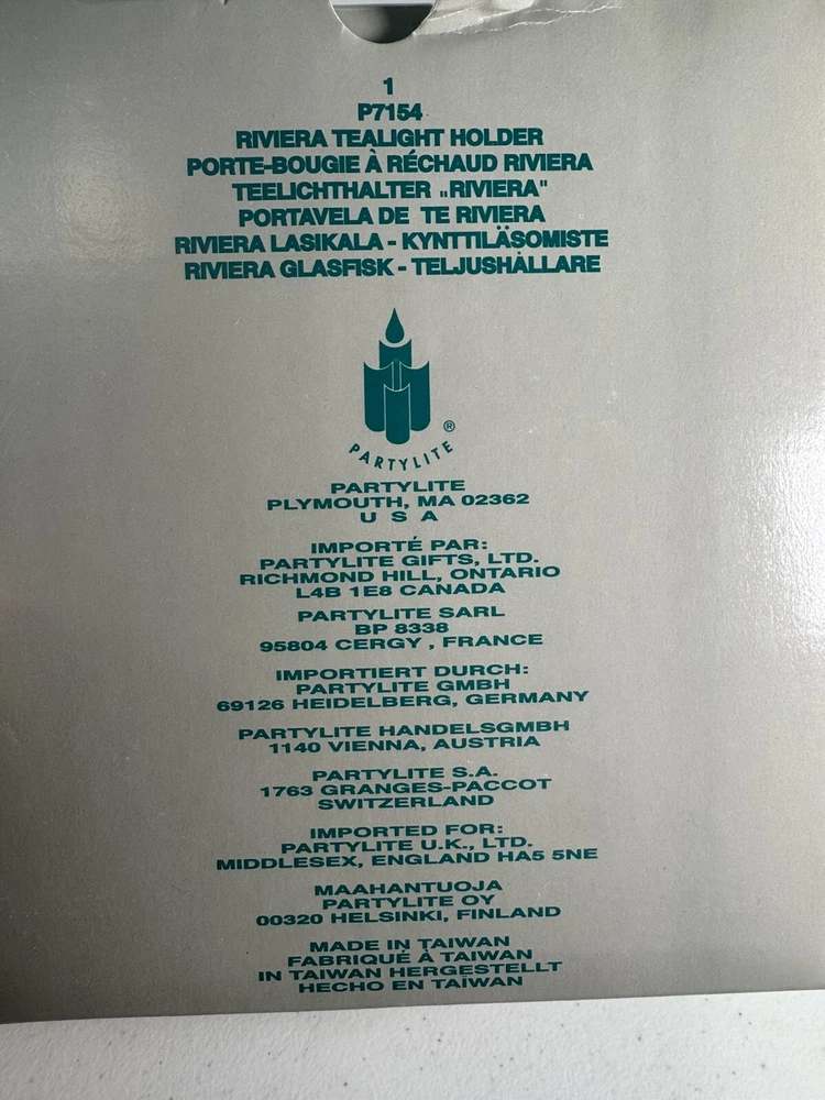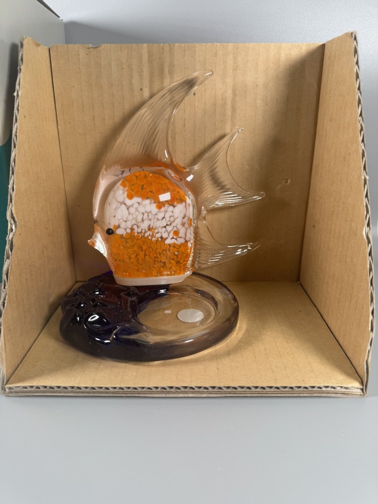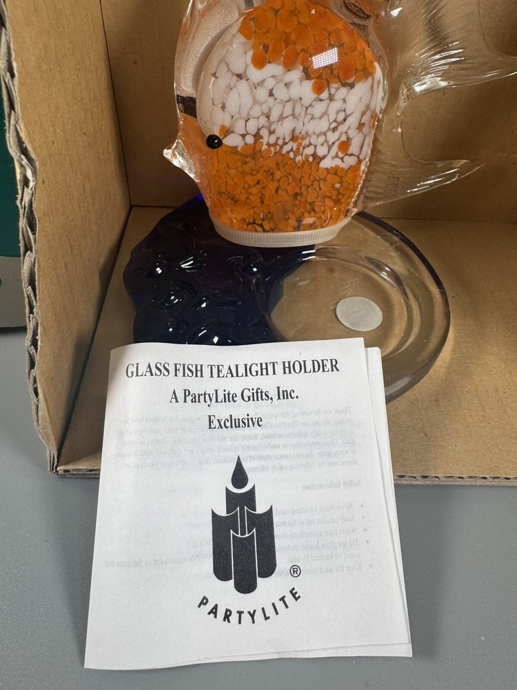Partylite Glass Fish Tealight Holder Riviera P7154 – New in Box Description: Add a splash of aquatic charm to your decor with this beautiful Partylite Riviera Glass Fish Tealight Holder. This exclusive piece, model P7154, features a vibrant orange and white glass fish on a clear and cobalt base designed to hold a single tealight candle. • Brand: Partylite • Model: P7154 • Product: Glass Fish Tealight Holder • Height: Approx. 6.5 inches (16.5 cm) • Condition: New, never used • Comes with original instruction sheet and original packaging • Made in Taiwan Perfect as a coastal decor piece, a collectible, or a unique gift! Shipping: Will be securely packed and shipped with care. Fast handling.