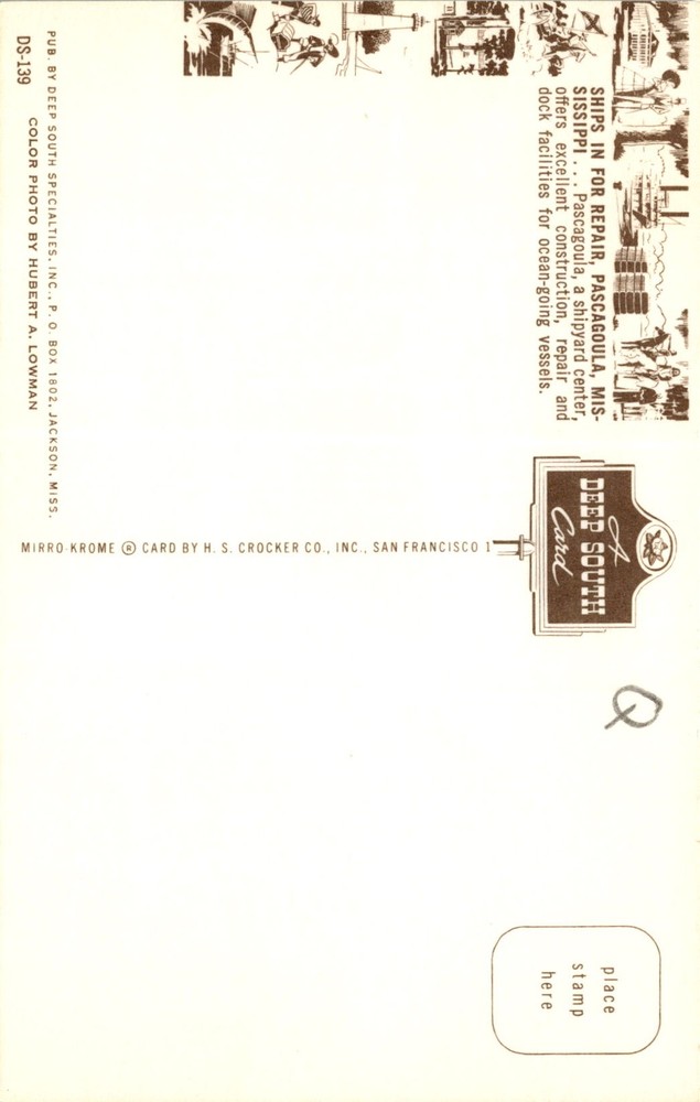 MAKE AN OFFER. THE MORE YOU BUY THE BETTER DEAL I WILL ACCEPT The postcard mentions ships coming in for repair in Pascagoula, Mississippi. Pascagoula is known as a shipyard center with top-notch construction, repair, and dock facilities for ocean-going vessels. The postcard is from Deep South Specialties, Inc., based in Jackson, Mississippi.