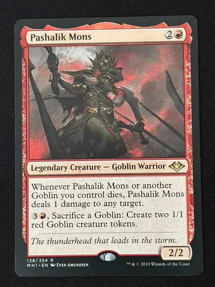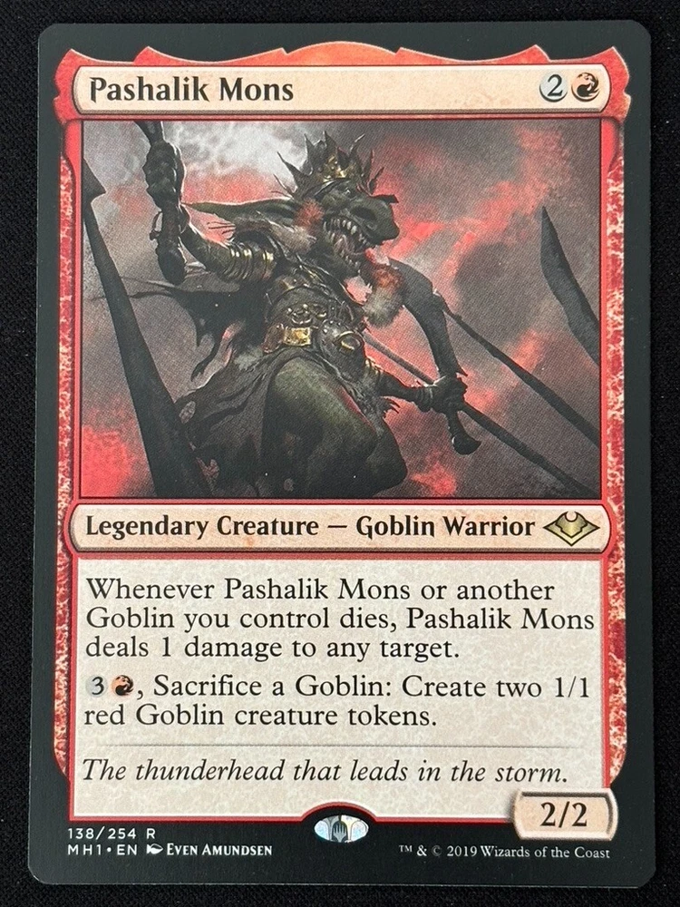 Finish:Regularbrand:Wizards of the CoastCost:2rLanguage:EnglishAttribute/MTG:Color:RedCard Sub-type:LegendaryCard Type:CreatureManufacturer:Wizards of the CoastSet:Modern HorizonsCard Text:Whenever Pashalik Mons or another Goblin you control dies, Pashalik Mons deals 1 damage to any target.