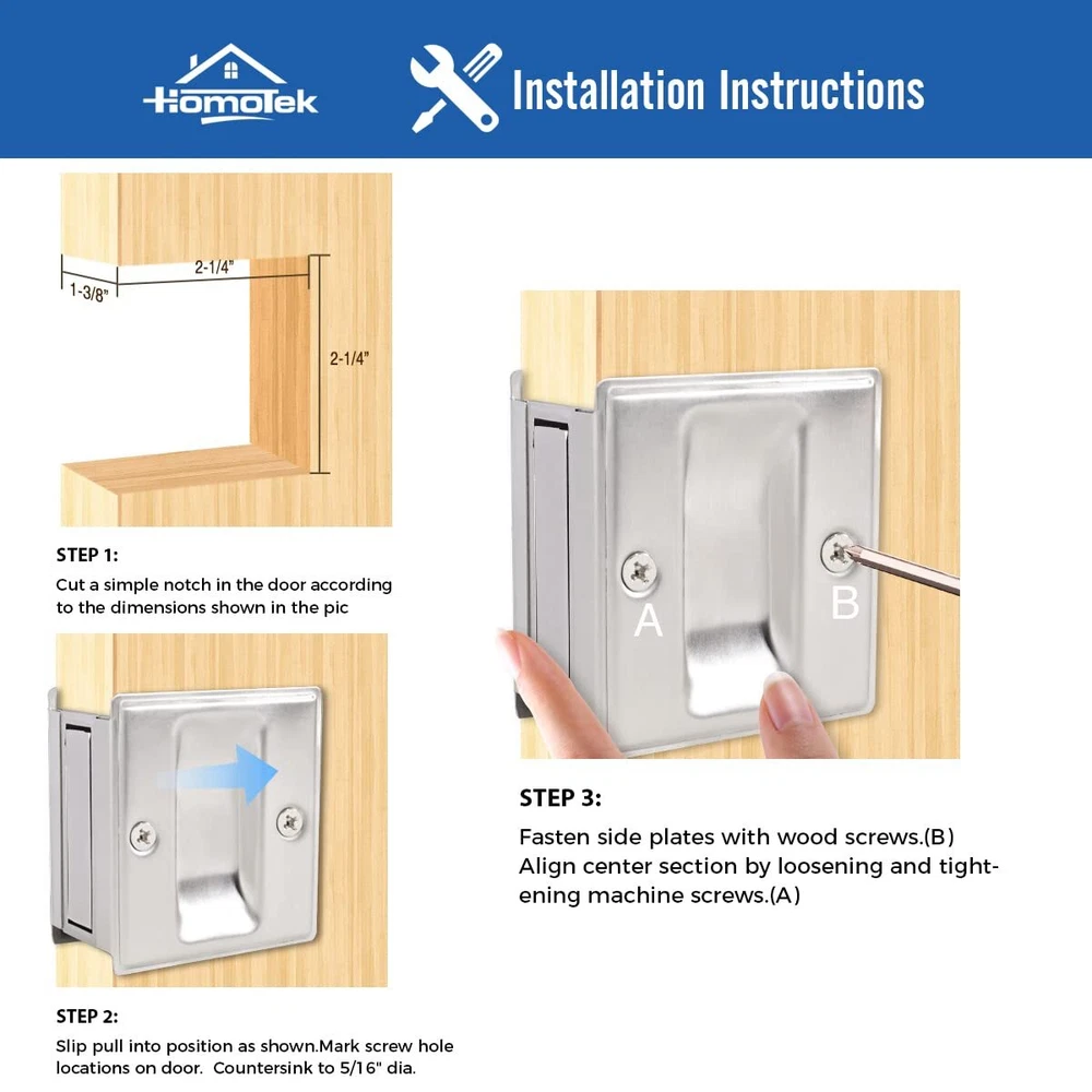 Effortless Access- Our sliding pocket door handle features a broad, easy-to-grip design suitable for both left and right-handed users. Its ergonomic structure ensures a smooth and natural motion when opening doors, making it an ideal choice for homes, offices, and commercial spaces. Stylish Finish Options- Choose from a variety of finishes including Brushed Satin Nickel, Black, Brushed Brass, and Antique Brass to match any decor style. Made from high-quality stainless steel and zinc alloy, every detail reflects personal style while maintaining durability. Easy Installation- Forget complex hardware setups. Our sliding door handle comes with all necessary hardware and clear instructions for a quick and straightforward installation. Whether you're a DIY enthusiast or a professional, you'll find the setup process hassle-free. Versatile and Functional- Designed for versatility, our door handle accommodates both left and right-handed doors. Its reversible plates make it suitable for various pocket door designs and it can adjust to fit door thicknesses of both 1-3/8” and 1-3/4”, catering to diverse architectural needs. Robust Material Quality- Constructed from premium stainless steel and zinc alloy, our door handle is built to withstand frequent use in high-traffic areas, maintaining both its functionality and appearance over time. It's the perfect choice for those seeking lasting quality.