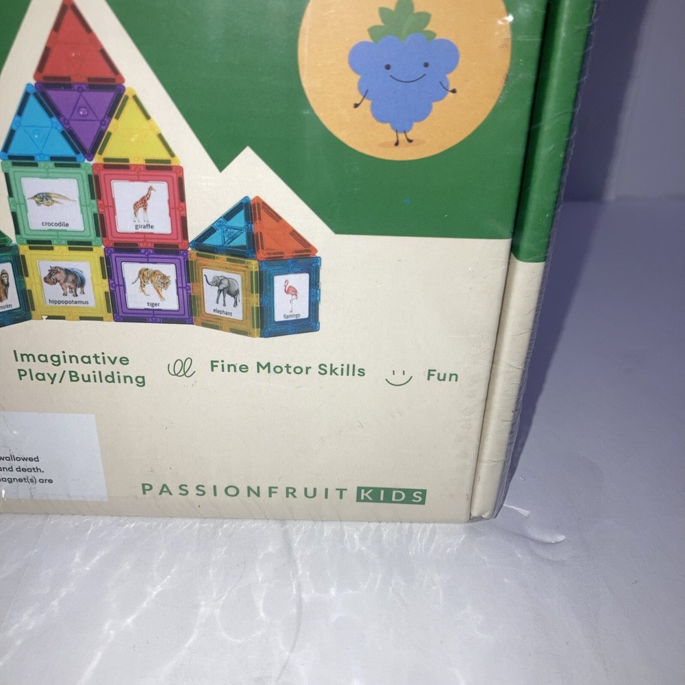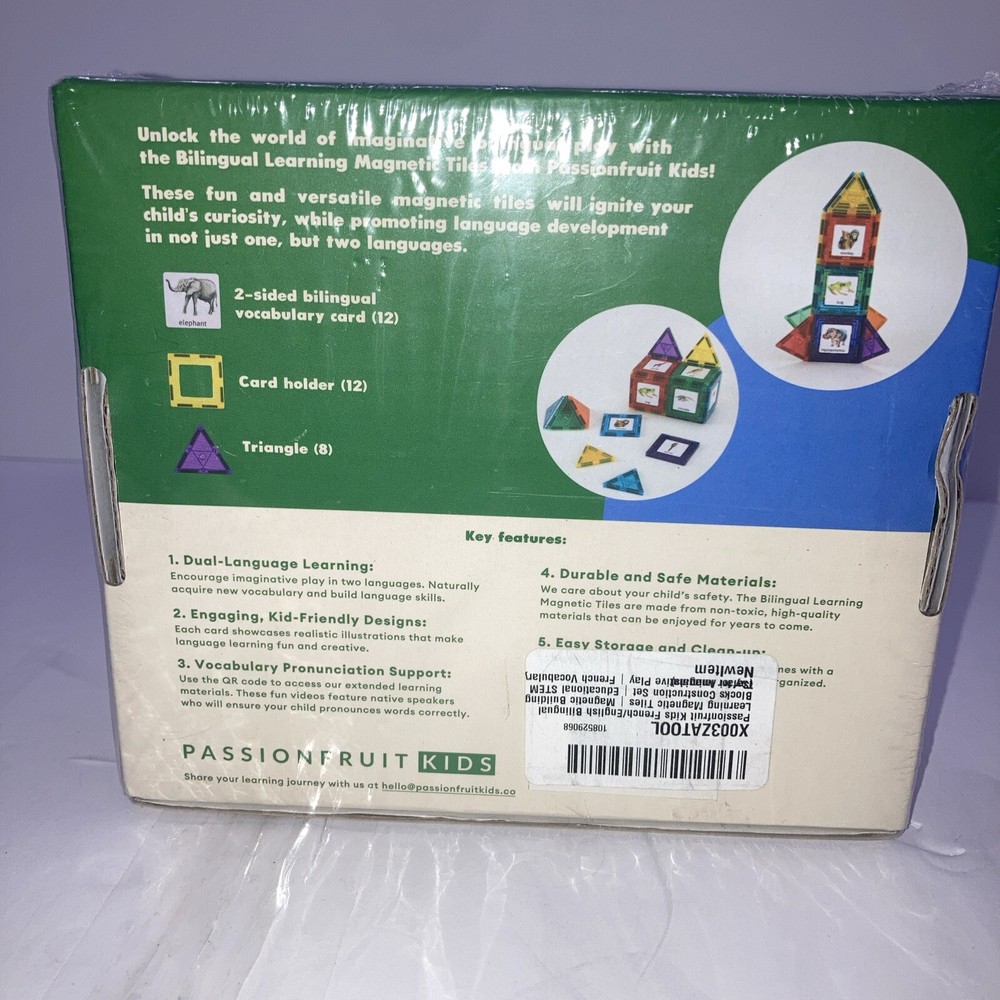 The product is a set of magnetic tiles for kids, designed to help them learn French and English. The tiles are from the Passionfruit Kids brand and come in a Safari color pattern. The package dimensions are 6.89x5.87x2.13 inches and the weight is 1.48 pounds. These tiles are part of a complete set and are suitable for building toys and blocks.
