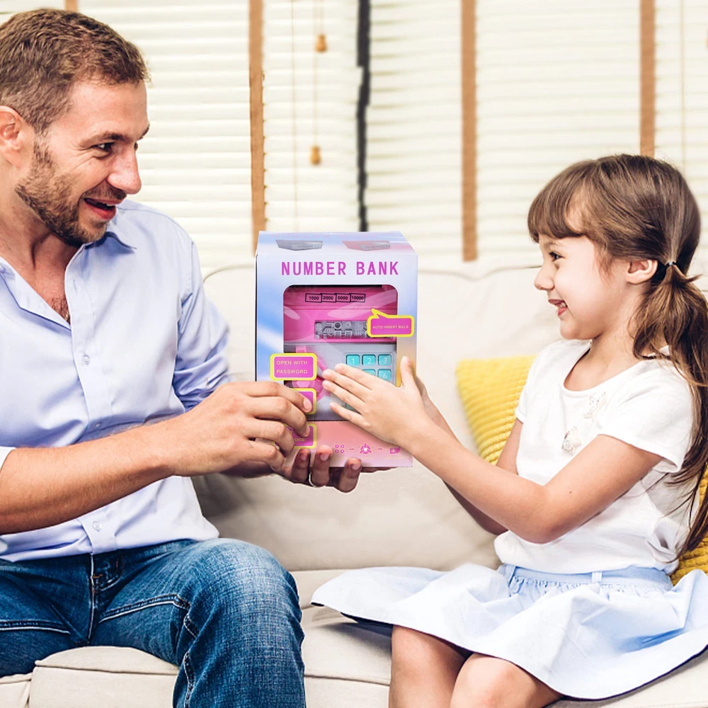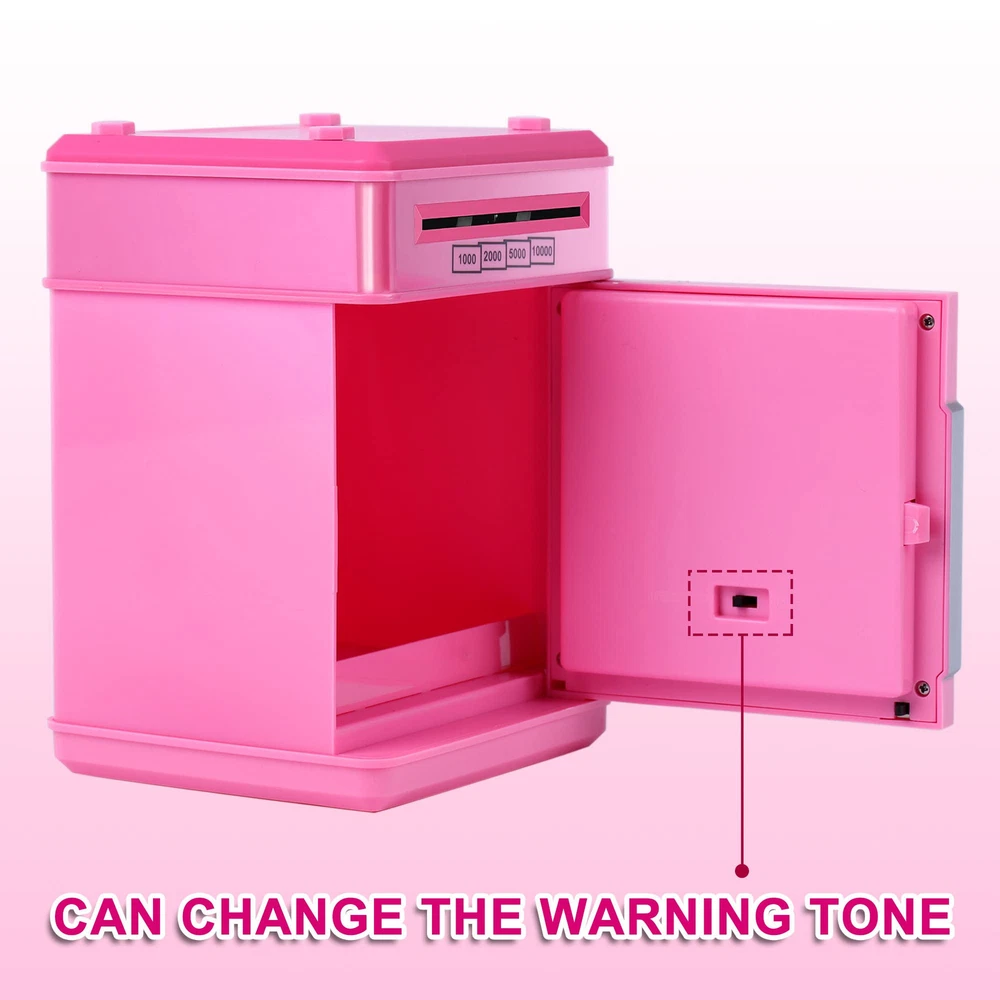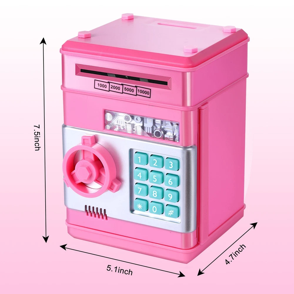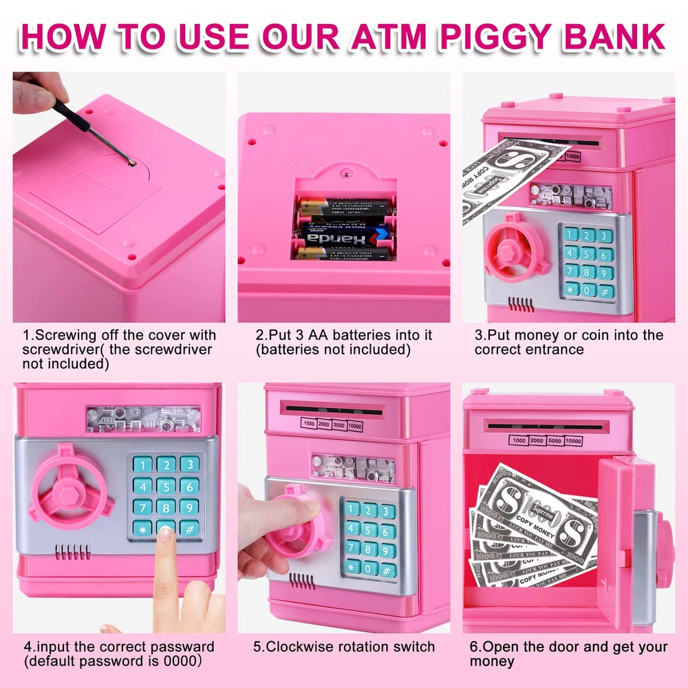 High Quality Materials: Our "money safe"box made of ABS plastic,safe design, sturdy and not break easily, passed multiple safety test.Powered by 3 * AA batteries (not included). If you have questions about the product, please contact us High Capacity Cash Box:Our this electric atm savings bank can store 600 pieces of coins or 100 pieces of paper money.Piggy bank can encouraged kids to start saving money and help them develop a good habit of using money more organized.Note:The money in the picture are prop money, not real money. Money Storage Method: ① Put the banknotes on the reel opening of the piggy bank, it will be automatically rolled in; ② There is a coin slot on the top to put coins to save money.(But it doesn't work if the paper is too old or too soft) Password Piggy Bank: This coin bank require 4-digit password protection to open the piggy bank (Default password is 0000),kids can set a new password as they like.If forgot, just remove the batteries for more then 15 mintures, it will back to Default Perfect Kids Toy: This money bank makes a great birthday and Christmas gift for young children, new moms, or expecting moms. Add this saving bank to your kids gift registry today!