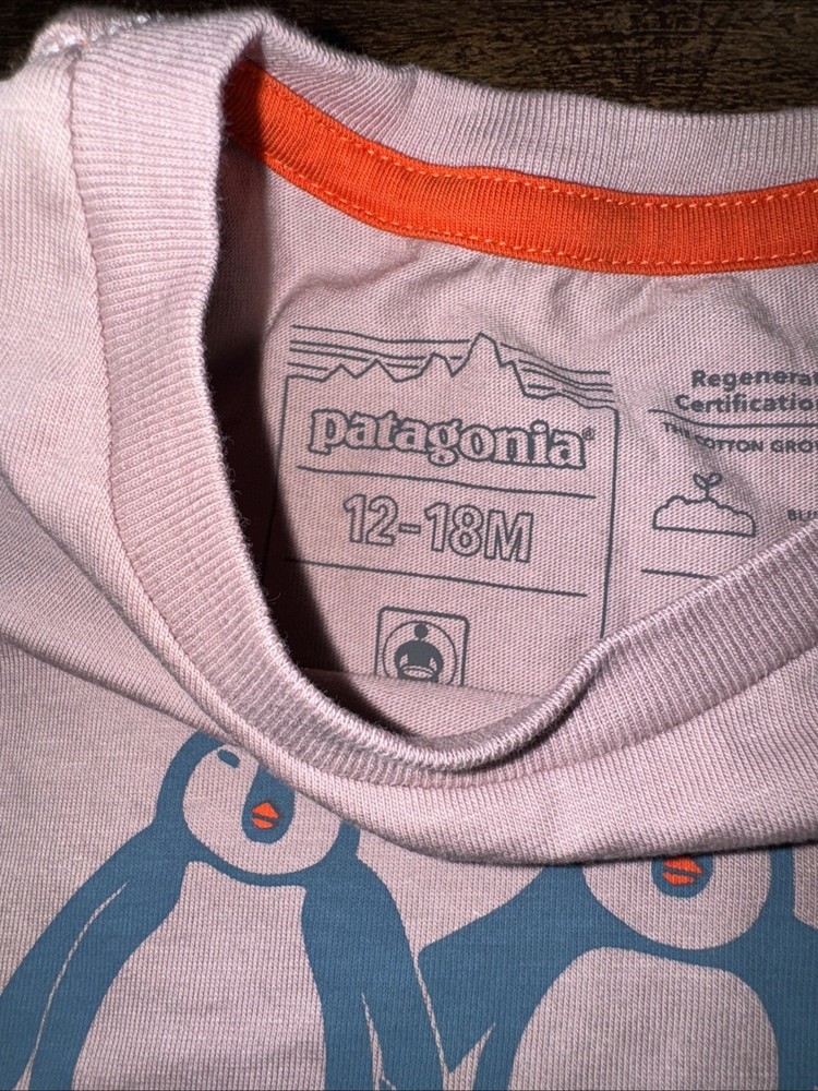 The product is a lot of two Patagonia toddler t-shirts in size 12-18 months, perfect for summer outdoor activities in nature. These short sleeve shirts feature a crew neck and come in a multicolor design with wildlife and outdoor themes, ideal for living a simple and nature-filled childhood. Made by the reputable brand Patagonia, these shirts are not only stylish but also comfortable and durable for active toddlers. New without tags. There are markings on the pull tag. See photos