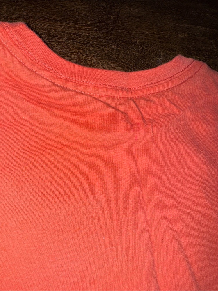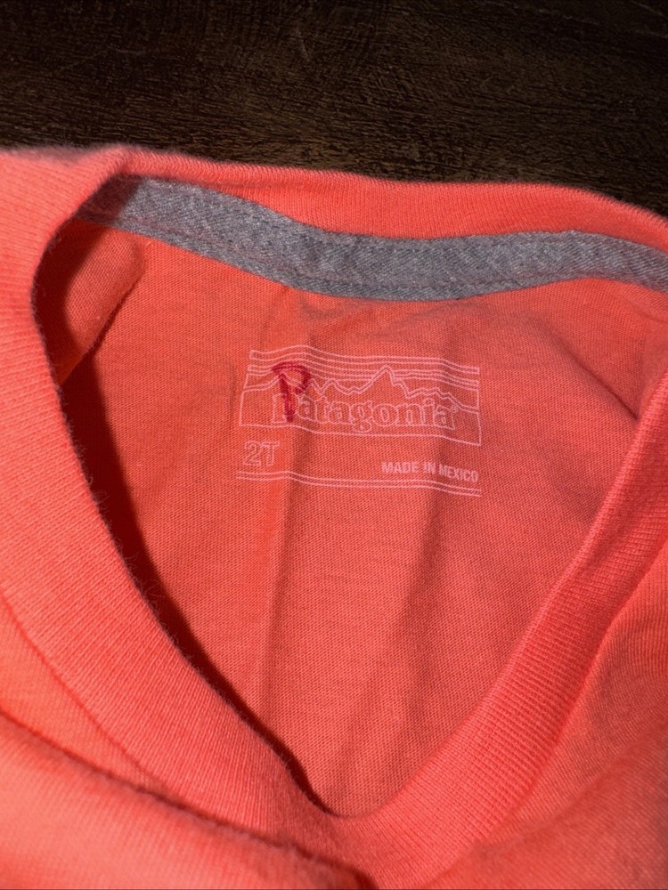 The product is a 2T toddler t-shirt by Patagonia, perfect for summer outdoor adventures. The shirt features a crew neck and short sleeves, making it comfortable for active toddlers. With a nature theme and wildlife character, this multicolor shirt is ideal for little ones to wear while exploring the outdoors. Made with high-quality materials, this t-shirt is not only stylish but also durable for everyday wear.. these shirts have red marker on the inside collar. It is visible on the outside of some of them. Selling at a discount