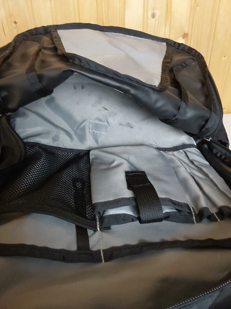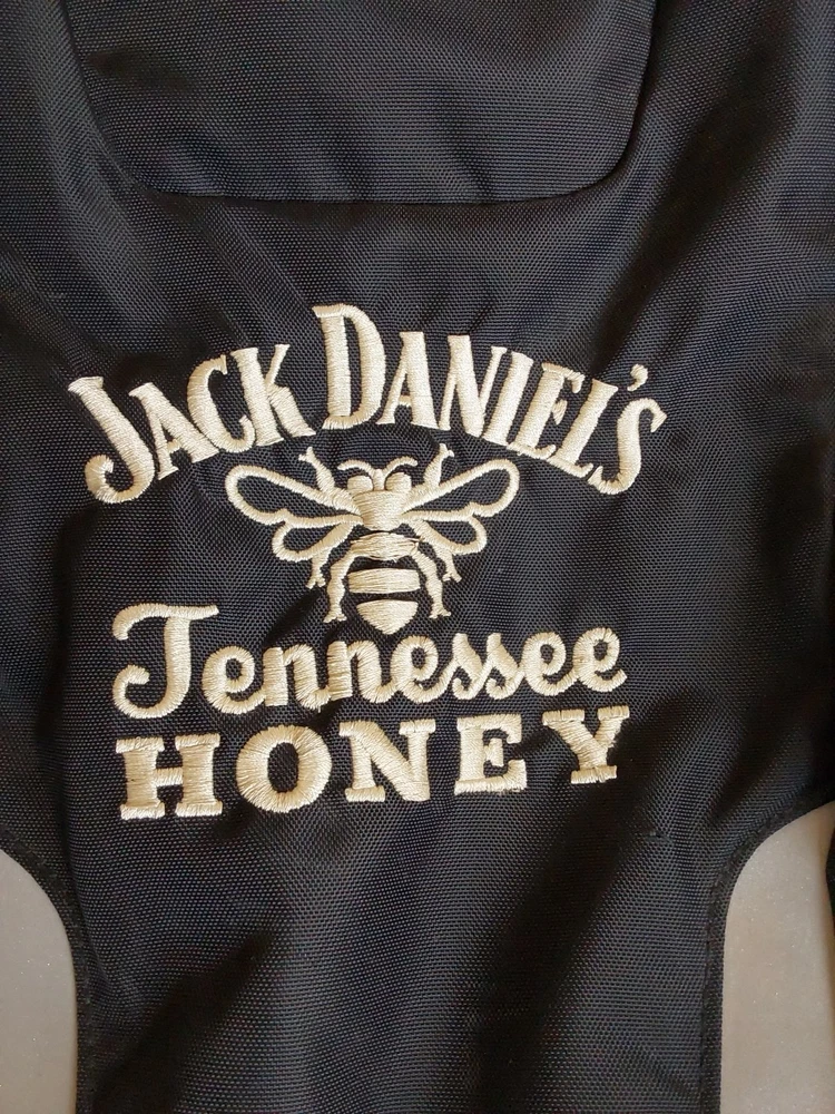 No rips or tears. It does have some spots on the inside of the one compartment. See photos. In very good overall condition. It has Jack Daniel's Tennessee Honey embroidered logo on the front of it. The logo is not bright white.