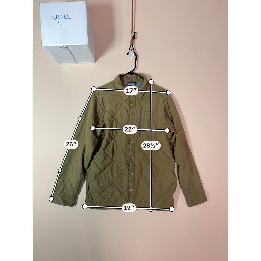The Patagonia Fitz Roy Diamond Quilted Puffer Snap Shirt Jacket in green is a stylish and practical addition to any man's wardrobe. Made of durable nylon with a cozy polyester lining, this jacket features a solid pattern and a stand-up collar for added warmth and style. The regular fit and size small make it a comfortable and versatile piece for everyday wear. Easy to care for with machine washable instructions, this jacket is perfect for outdoor adventures or casual outings. Made by the trusted brand Patagonia, you can trust in the quality and craftsmanship of this jacket. Marks on front and possibly elsewhere. Priced accordingly.
