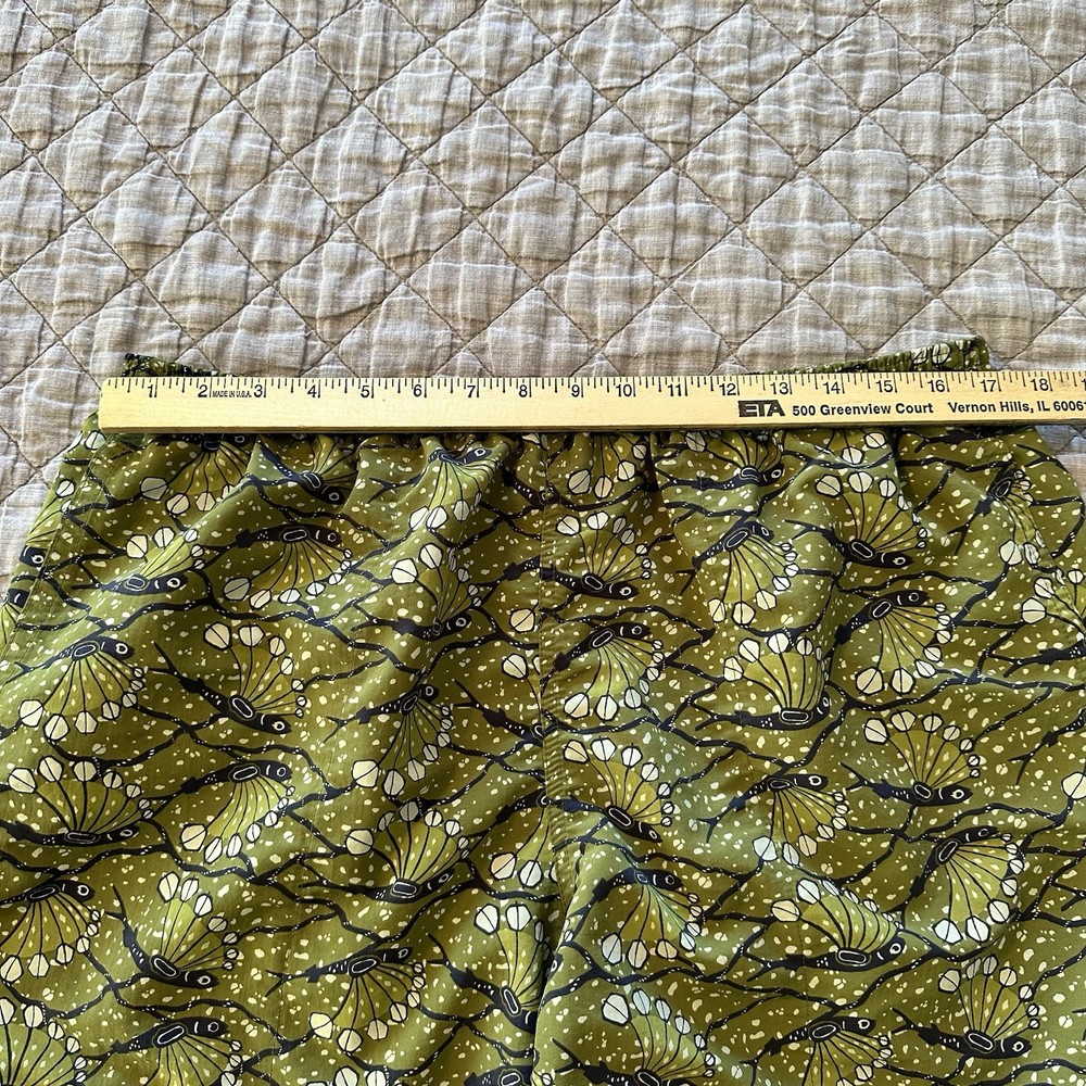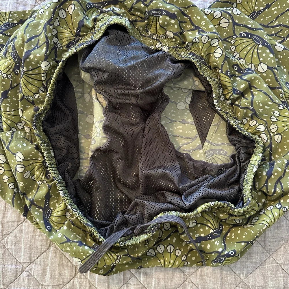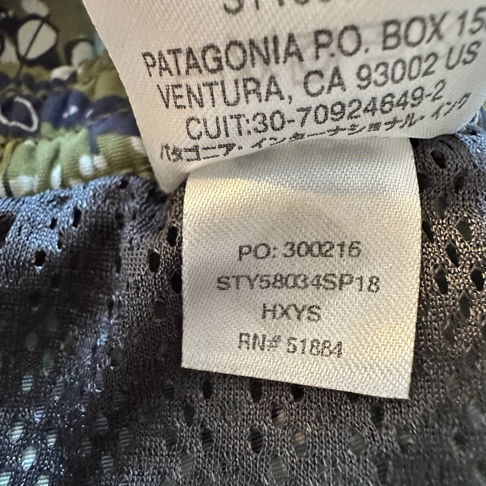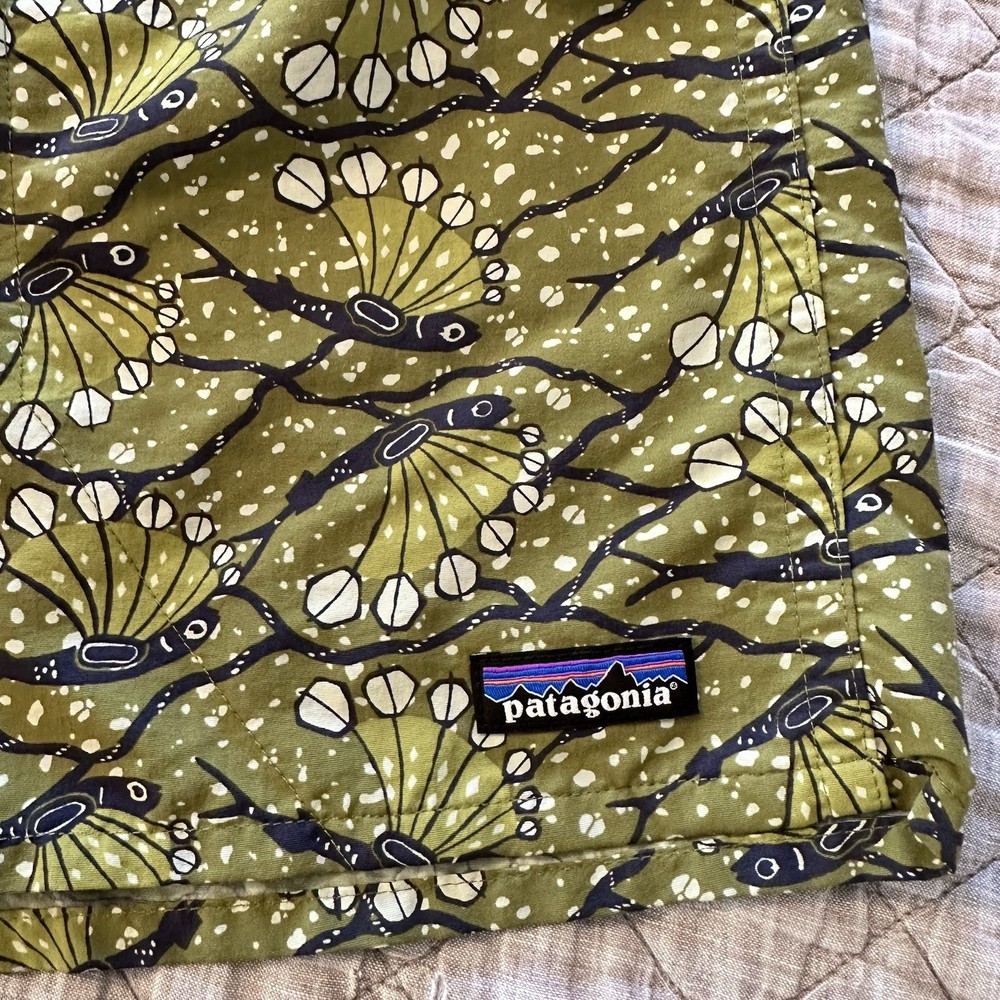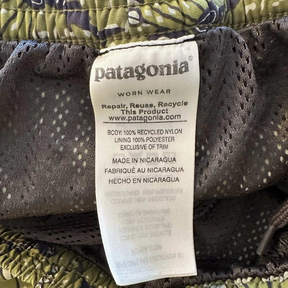 Patagonia men’s Baggies-style shorts featuring a green allover bird print with elastic waistband and mesh liner. Lightweight, quick-dry design suitable for swim, beach, hiking, travel, or casual wear. Classic Patagonia quality with logo patch at hem and snap back pocket. Condition: Very good pre-owned condition. No holes or stains noted. Elastic remains strong and liner intact. Size: Men’s XL (Flat measurements shown in photos for best fit comparison) Features: • Elastic waistband with drawstring • Mesh liner • Lightweight quick-dry fabric • Back snap pocket • Patagonia logo patch • Made in Nicaragua