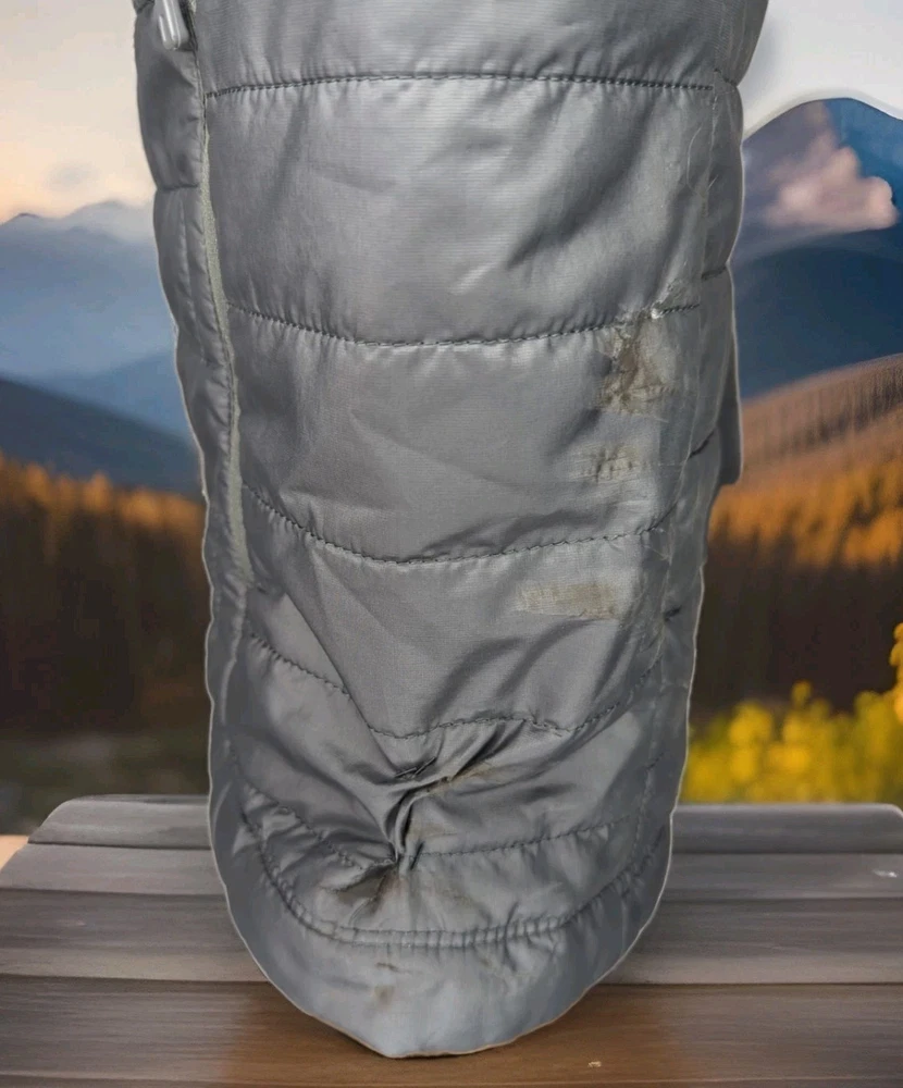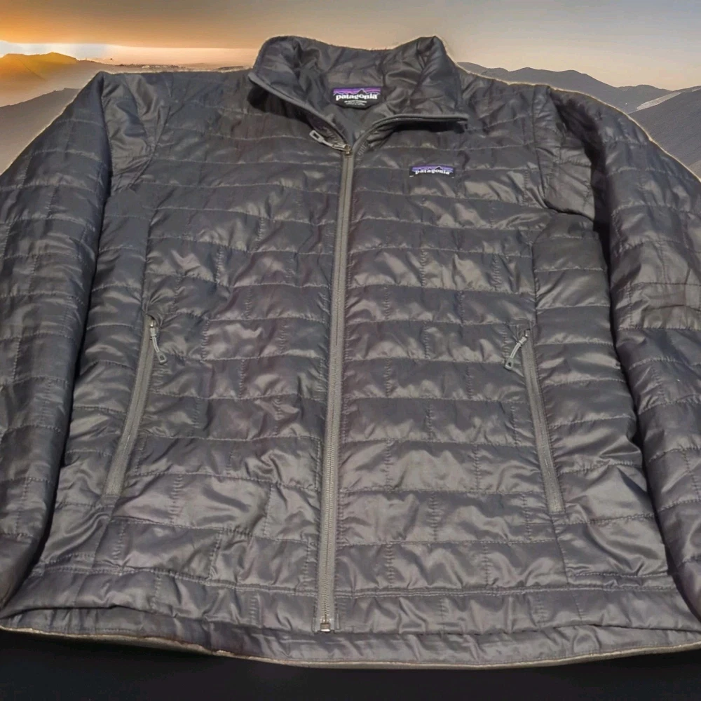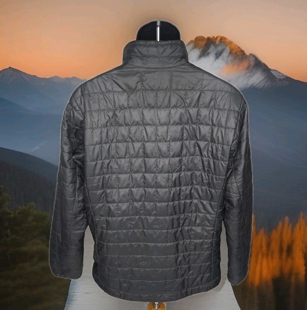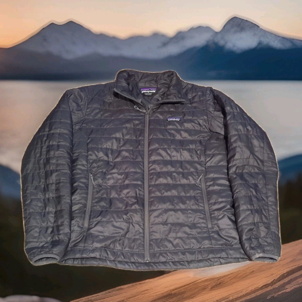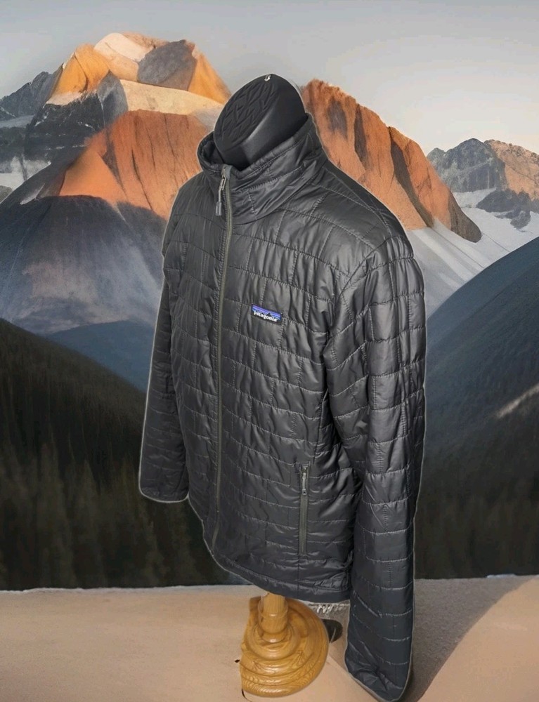 PATAGONIA NANO PUFF PRIMALOFT INSULATED WINTER JACKET MENS SIZE MEDIUM - 22" ACROSS EXTERIOR CHEST LAID FLAT FORGE GREY IN COLOR Lightweight, 100% recycled polyester ripstop shell and lining fabric has a DWR (durable water repellent) finish The most thermally efficient synthetic insulation available now with 55% post-consumer recycled content, 60-g PrimaLoft® Gold Insulation Eco is water-repellent, highly compressible and maintains 98% of warmth, even when wet Brick quilting pattern with horizontal quilt lines on side panels stabilizes insulation and uses durable thread for abrasion resistance Center-front zipper has wicking interior storm flap and zipper garage at chin for next-to-skin comfort Two zippered handwarmer pockets have cleanly finished zipper garages; zippered internal chest pocket doubles as a stuffsack with a reinforced carabiner clip-in loop Drawcord-adjustable drop-tail hem seals in warmth Fair Trade Certified™ sewn PRE OWNED CONDITION - UNFORTUNATELY THERE ARE A FEW IMPERFECTIONS UNDERNEATH THE LEFT SIDE AREA WHERE THE SLEEVE SITS (WEAR MARKS AND A PATCHED HOLE - YOU CAN'T REALLY TELL THEY ARE THERE WITH THE SLEEVE DOWN UNLESS YOU'RE REALLY LOOKING FOR THEM BUT PRICE REFLECTS THESE FLAWS) - SO PLEASE SEE PICS (FIRST PHOTO IS STOCK FOR REFERENCE OF SAME MODEL - LAST 3 PHOTOS SHOW THE FLAWS/REPAIRS)