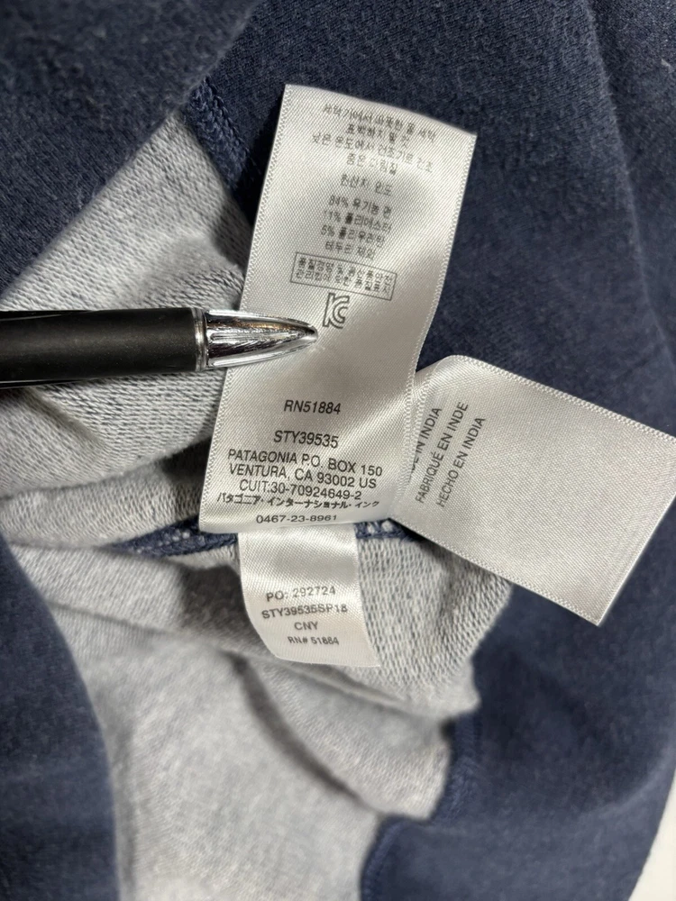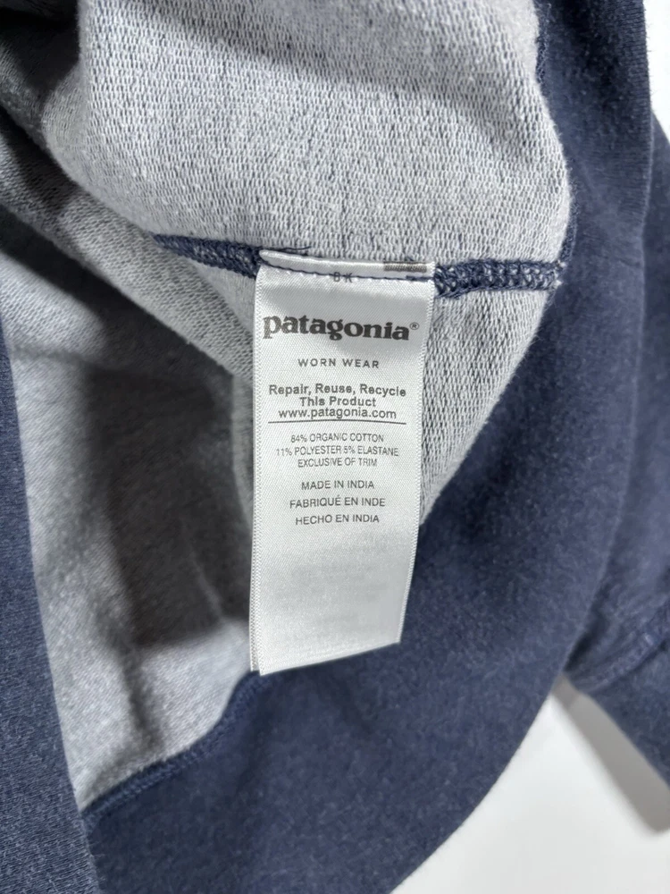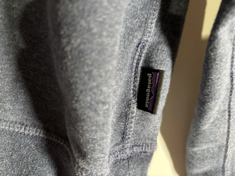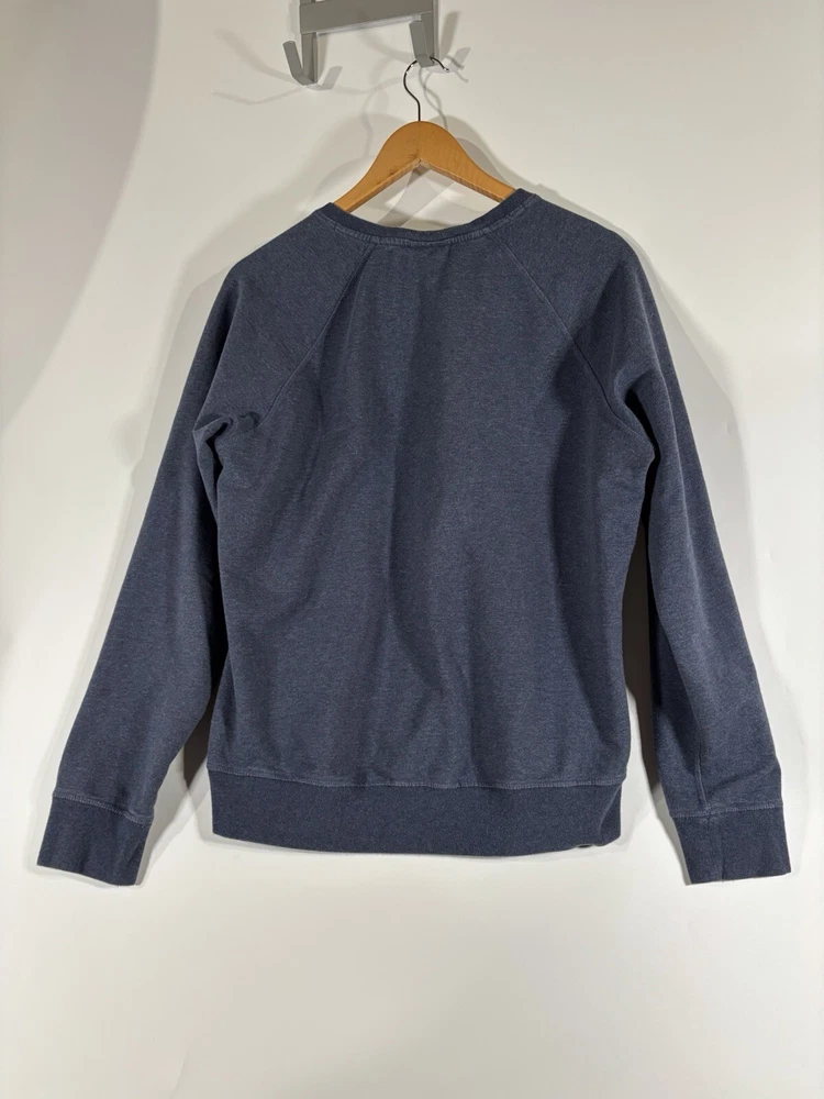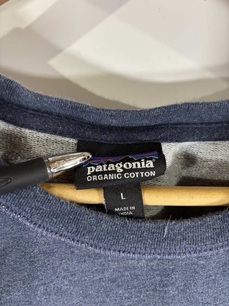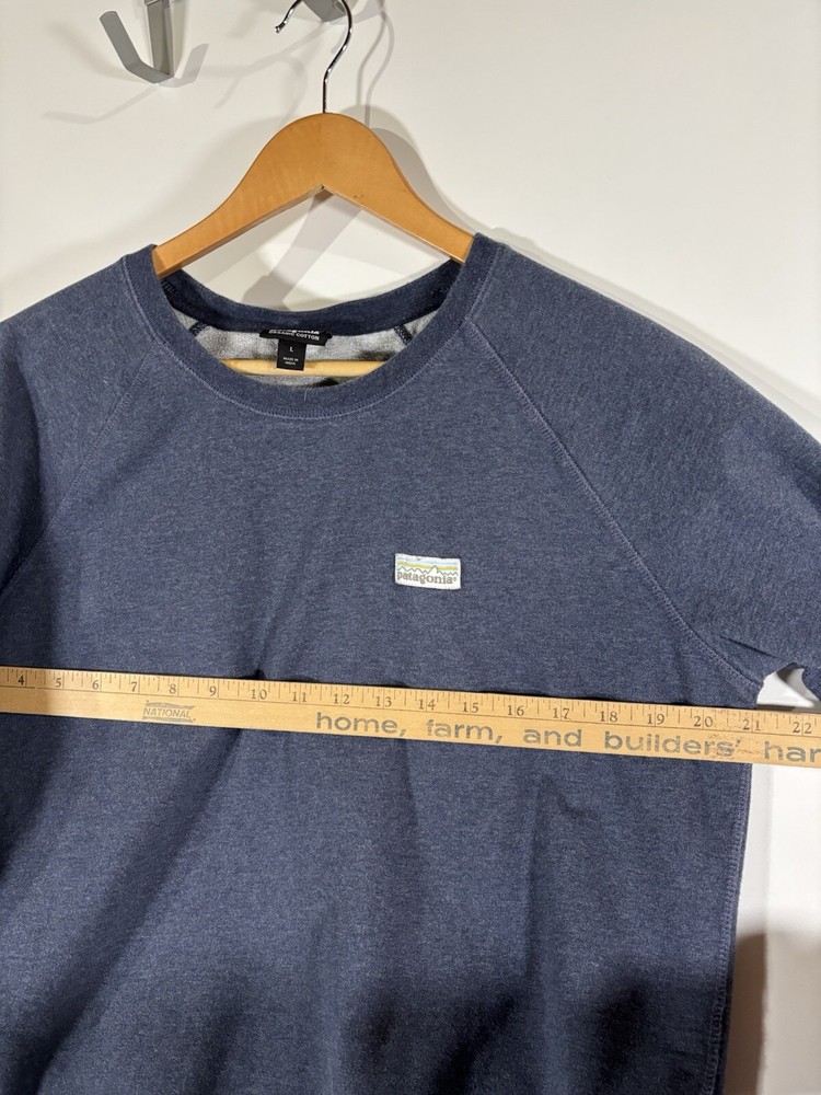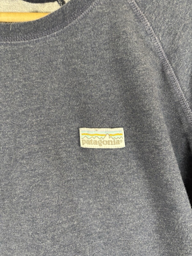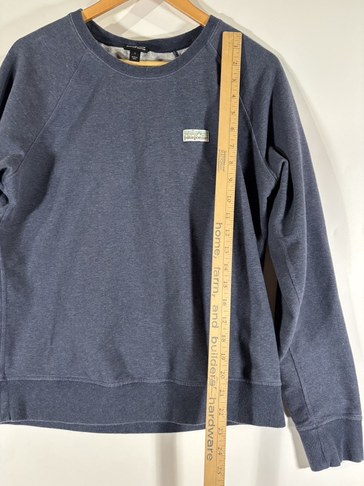 This Patagonia sweatshirt is made for women in size L, featuring a solid blue color with a crew neck and long sleeves. It is crafted from organic cotton blend knit fabric, making it lightweight and breathable for all seasons. The pullover style showcases the brand's logo accent and is easy to care for with machine washing. Ideal for outdoor adventures like hiking, camping, and backpacking, it embodies a nature-inspired theme. SKU3