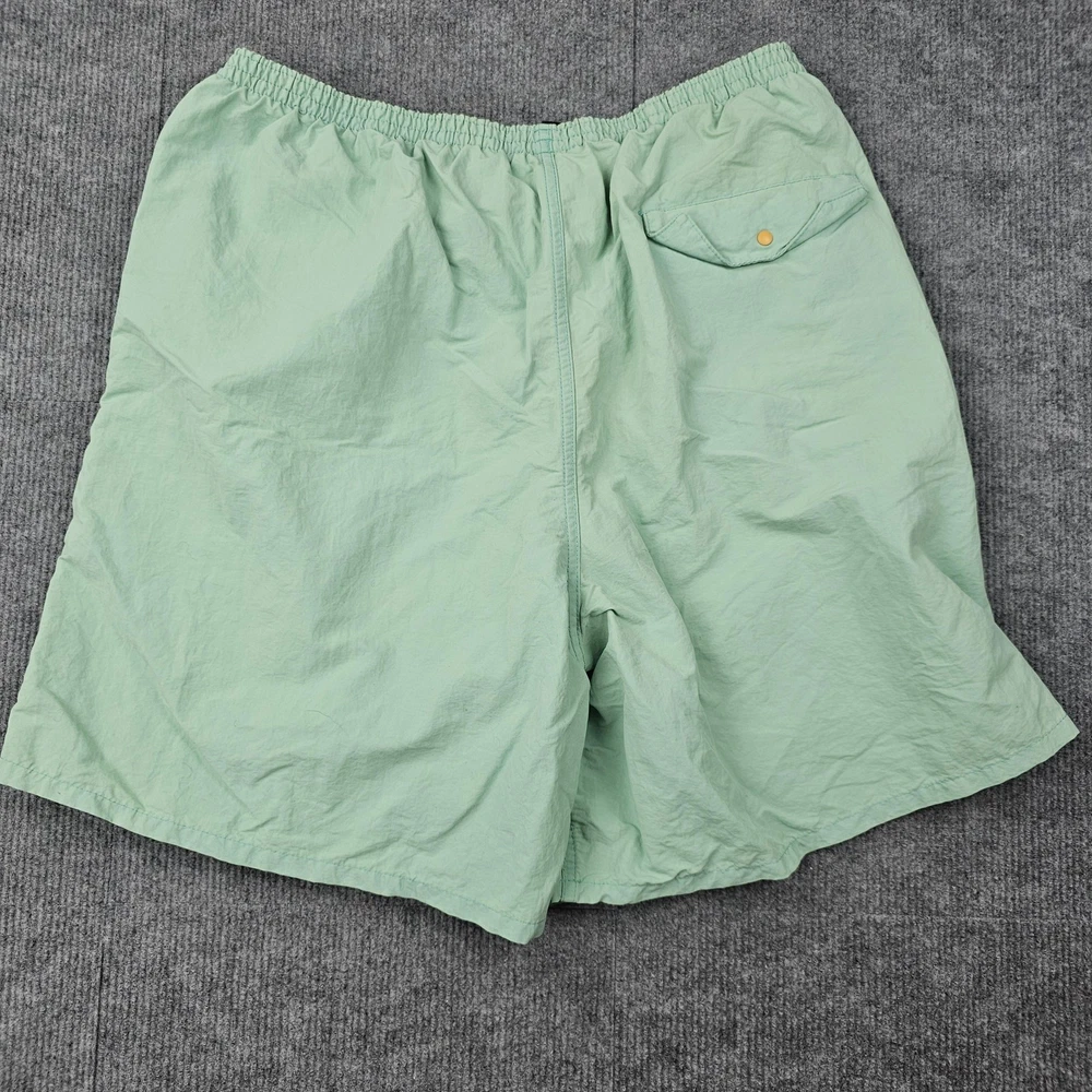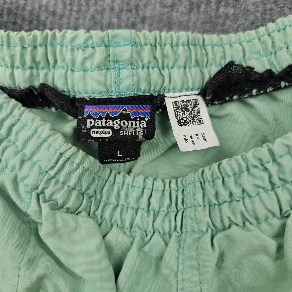 Brand: Patagonia Item: Mens lined swim shorts Tag size: Large (L) Color: Light/Mint Green Material: NetPlus recycled nylon shell Features: Elastic waistband, side hand pockets, rear flap pocket with button closure Features: Quick-dry fabric Branding: Patagonia mountain logo patch at left hem Notes: Classic Patagonia swim/training style with NetPlus shell; compare to a similar pair for best fit.
