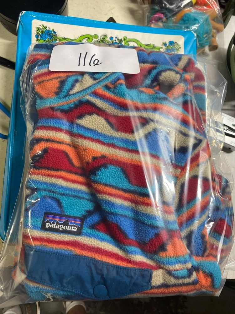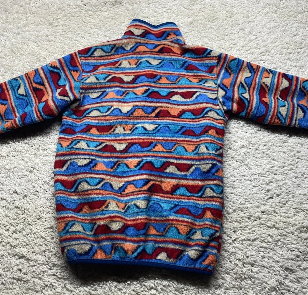 The Patagonia Synchilla Snap-T Fleece Pullover Jacket in Youth XL is a stylish and versatile outerwear option for kids. Made from 100% polyester, this jacket features a snap closure and a colorful Aztec-inspired design. Perfect for outdoor activities or casual wear, this basic jacket with a multicolor theme offers both comfort and style for young adventurers.