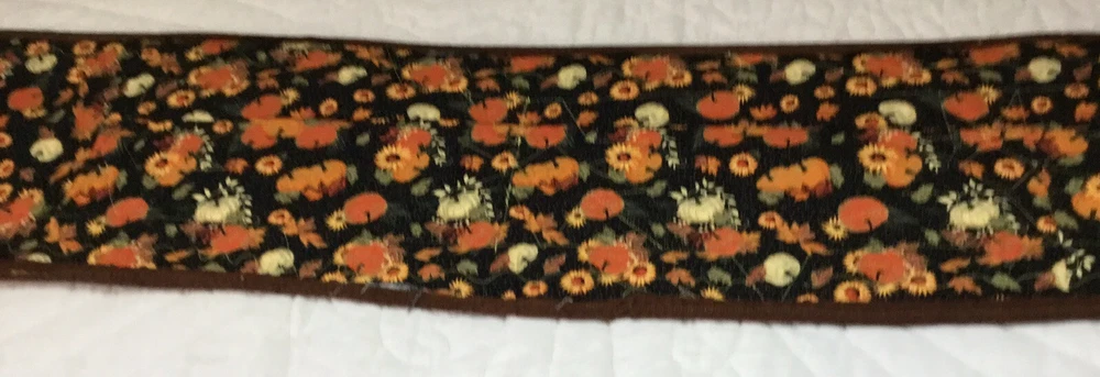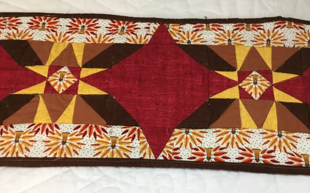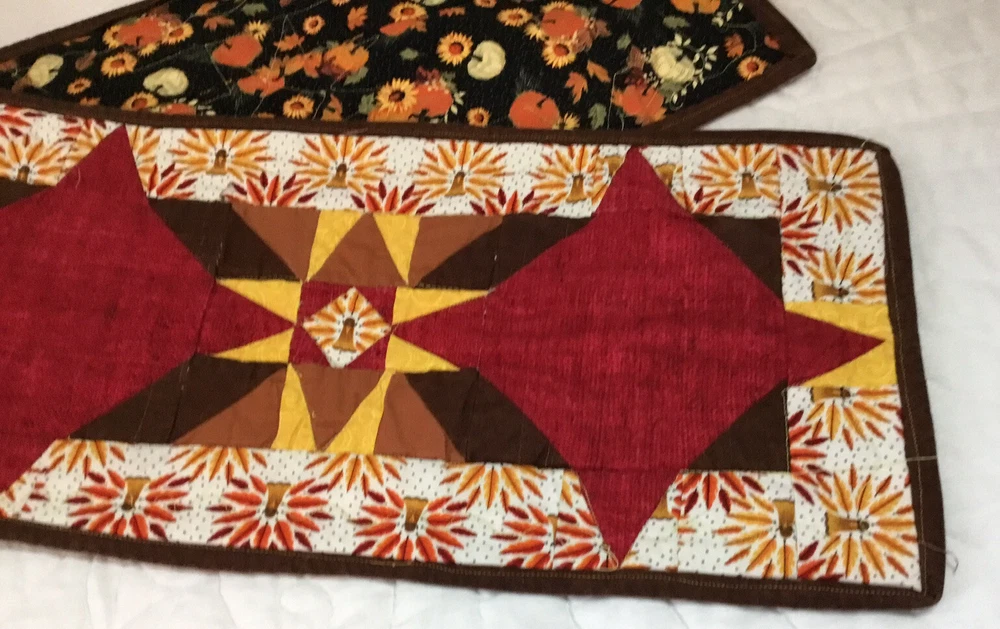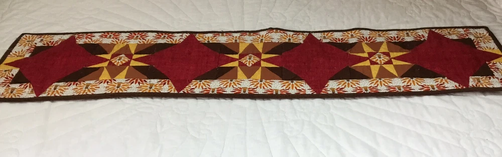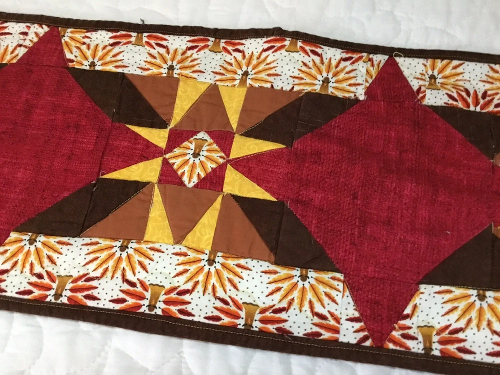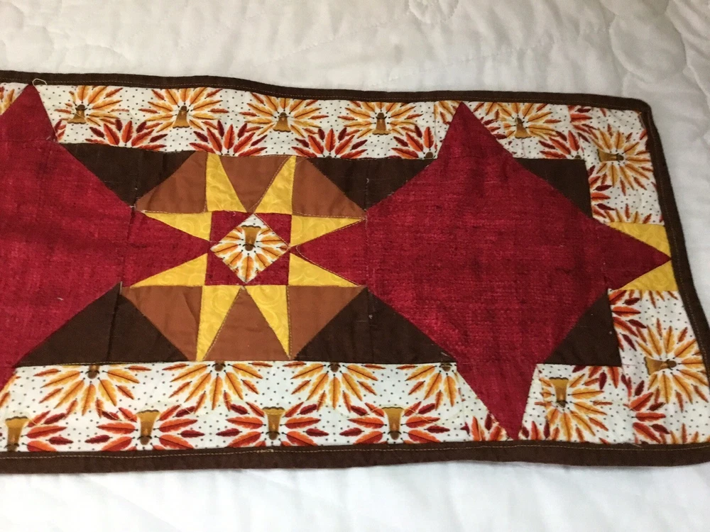 Up for sale is a patchwork quilt table runner. The design is star. The fabrics are solids, print, leaf prints. The colors are brown, off white, gold, yellow, red, cranberry. The border is brown solid, machine sewn. The back is pumpkin, leaf print. Machine quilted. Medium thickness. Very, very good condition. Measures 10 1/4” by 45”. Hand made. Made in the USA. Thanks and happy bidding. I will combine shipping charges. Smoke free home. Please make payment in three days ~~~~Please visit my ebay store: 🇺🇸webbsamericancountry1🇺🇸 for over 2000 vintage and collectible items.~~~~🌺🌼🌹