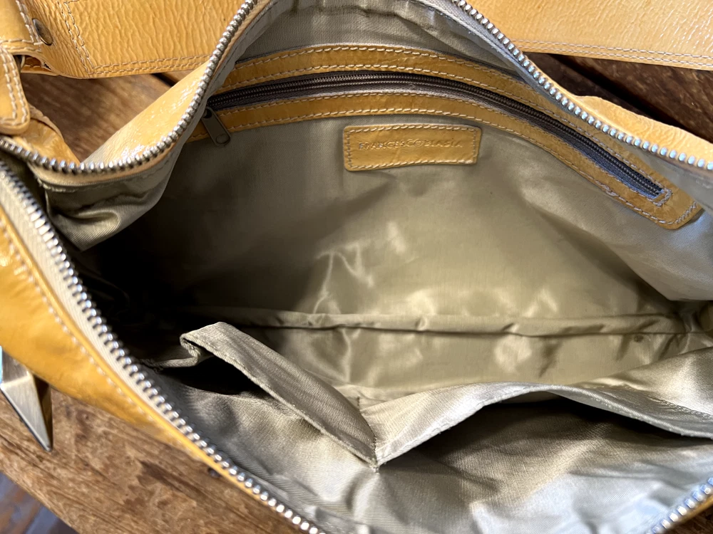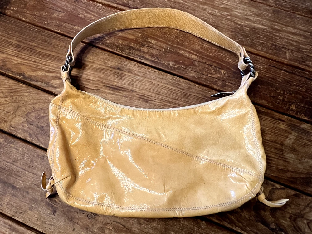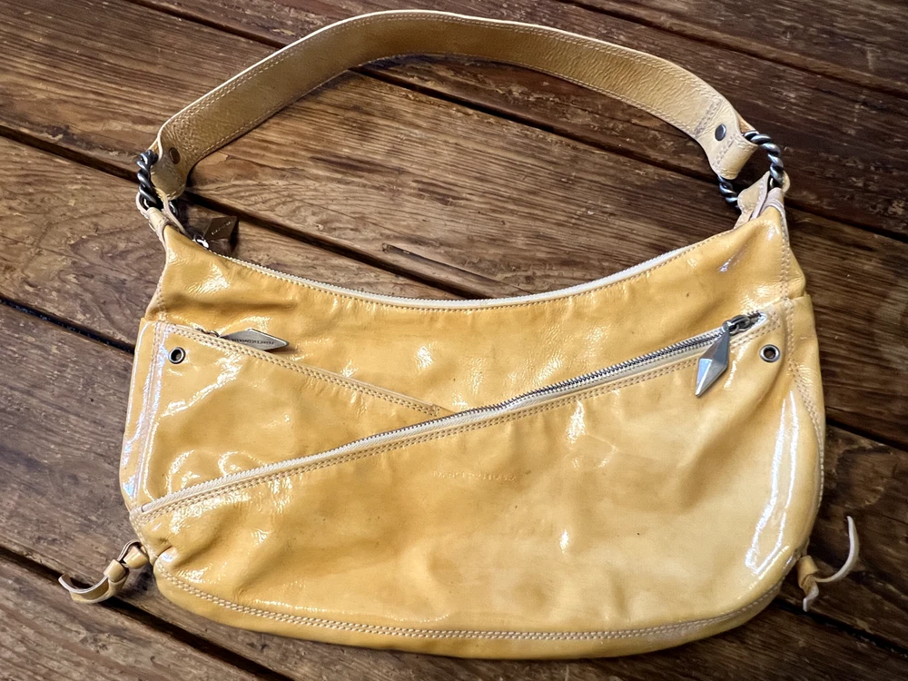 Patent leather, butterscotch colored handbag, fully lined in satin fabric with 3 interior pockets (one with a zippered closure) and 2 outside zippered pockets. 14" wide x 8" tall and 1.75" wide x 17" long strap.