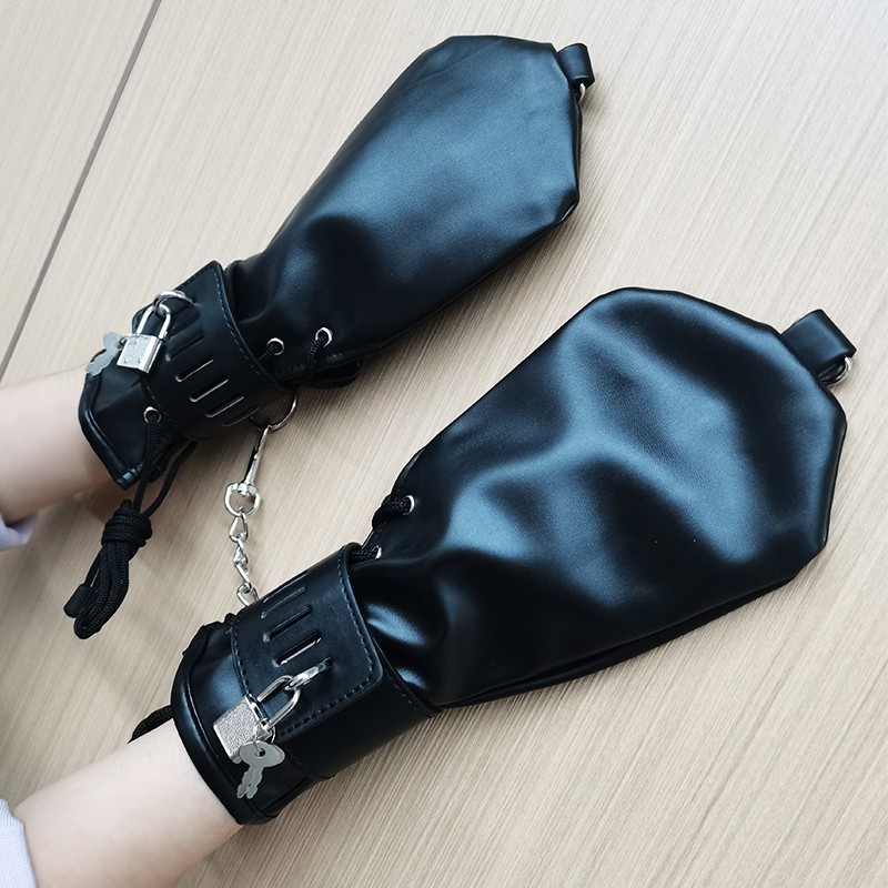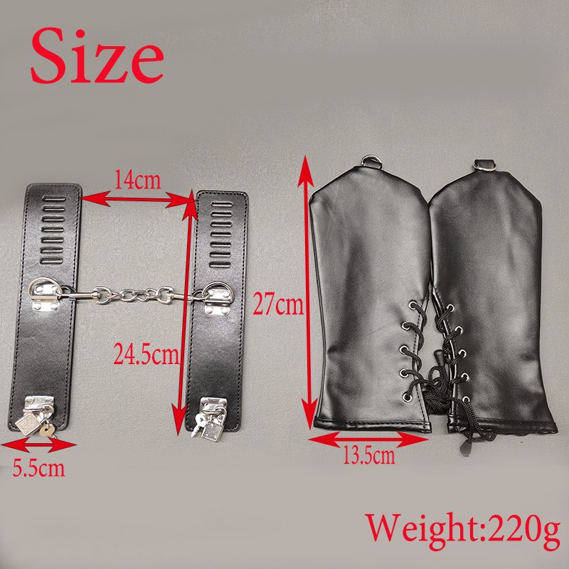 Feature: Condition:100% Brand New One Size for all Handcuff size: 24.5cm (L)* 5.5cm(W) Mitten Size: 27cm (L)* 13.5cm(W) Color: Black Material: Faux Leather Net Weight: 225g Package Included: one pair of cuffs as the picture with locks Description: This hand restraint features a pair of full hand glove and two wrist cuffs. The mittens are very soft and fully lined, with side lacing for a better fit. The wrist cuffs have one padlock with 2 keys for each lockable strap. Each mitten and wrist cuffs has D rings for rope or chains attachments. Free size, fits all hand sizes and max wrist size about 22cm.