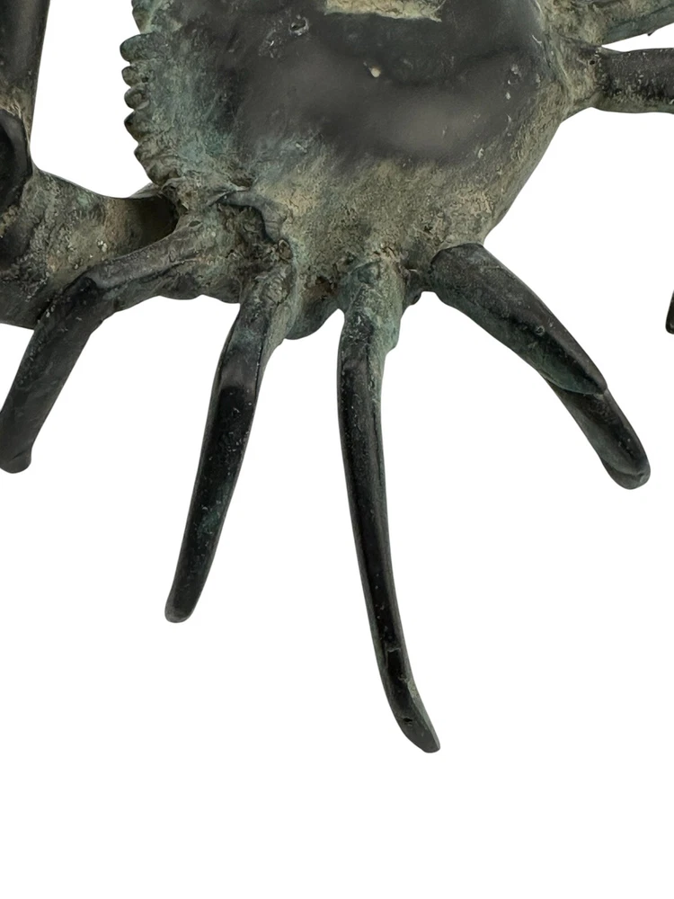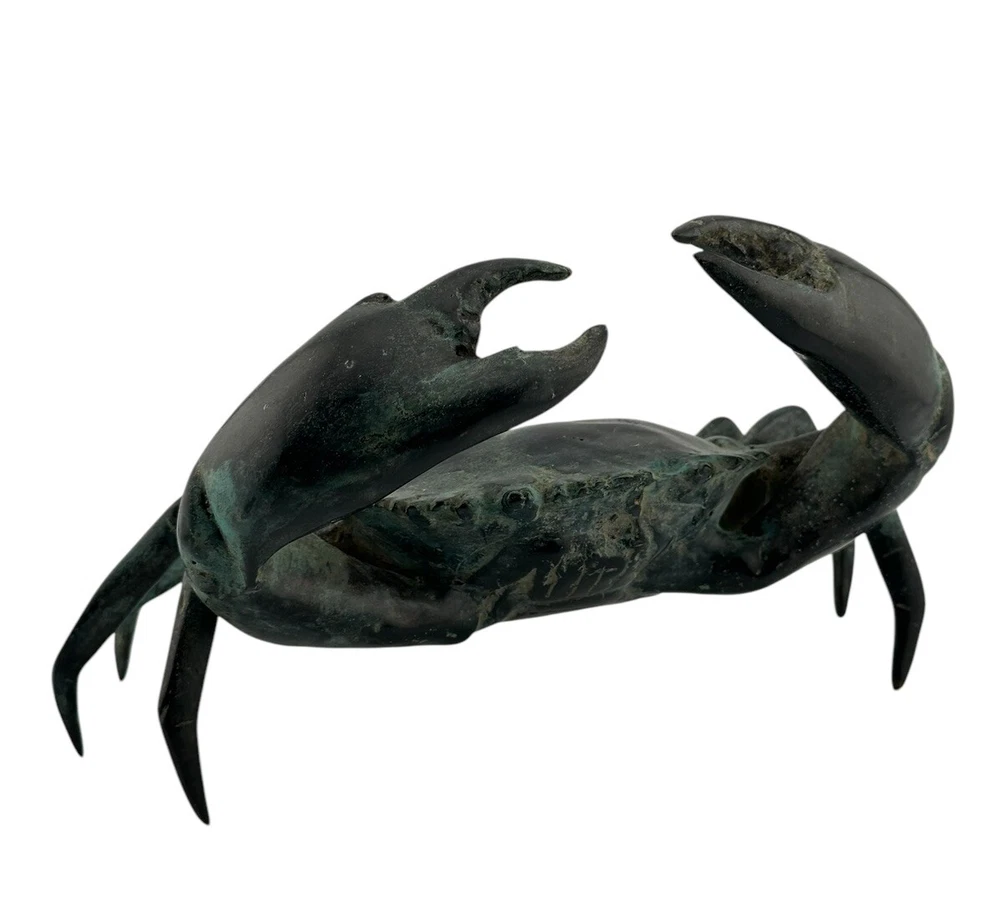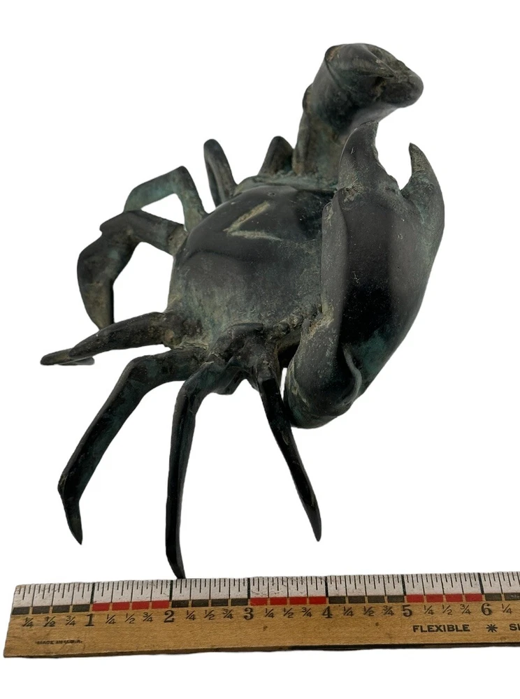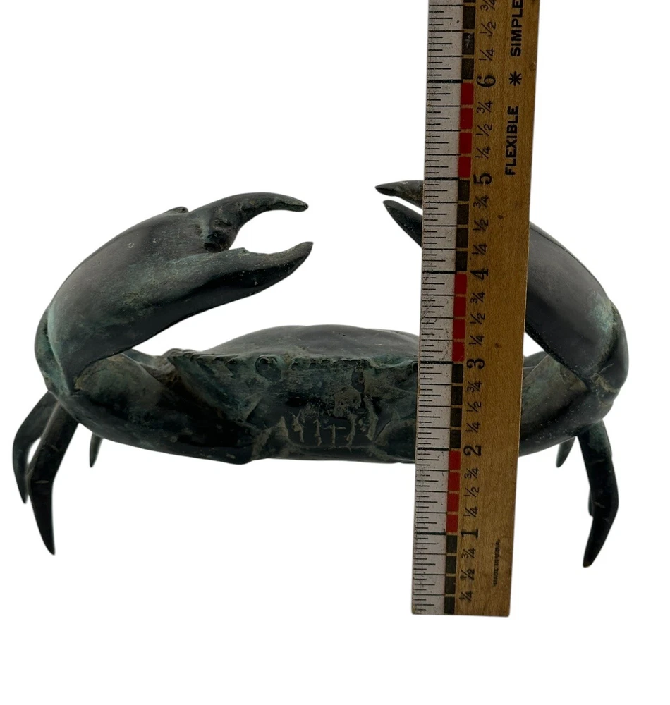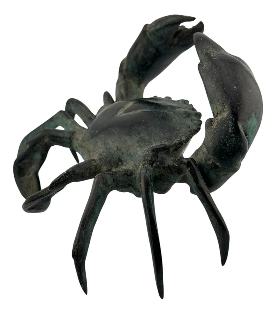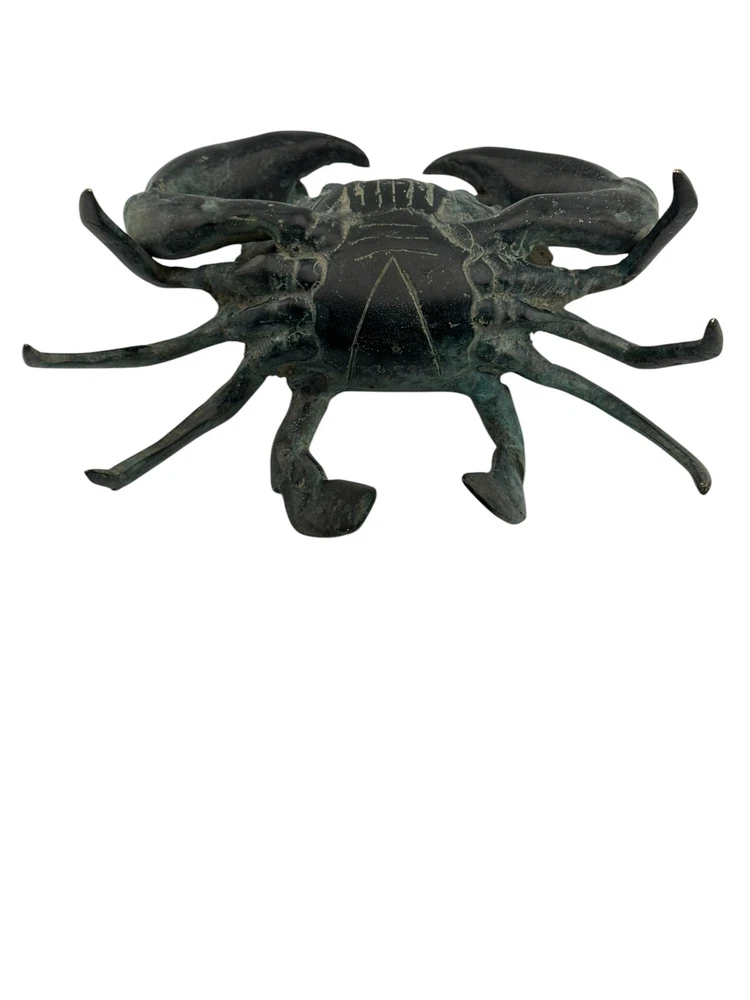 Patina Metal Crab Sculpture Figurine Sea Life Animal Creature Ocean Beach Water Approximate Dimensions: 5” tall 8” wide 5 3/4” deep