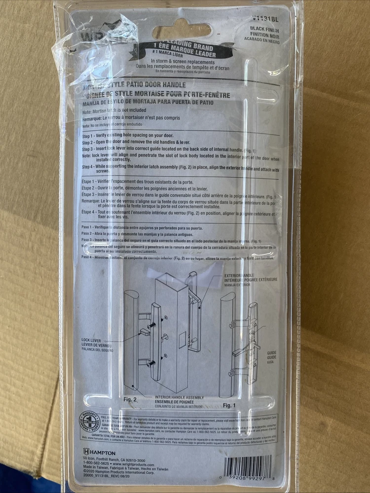 This is an open box Patio Door Handle by wright Products. It is designed for a patio door, with a size of 7-3/8 in. and a black color. The handle is suitable for both Type1 and Type2 doors, making it versatile for different types of patio doors. Its sturdy construction and brand reputation ensure high quality and reliability for your door hardware needs.
