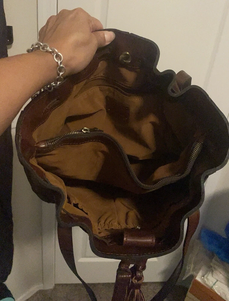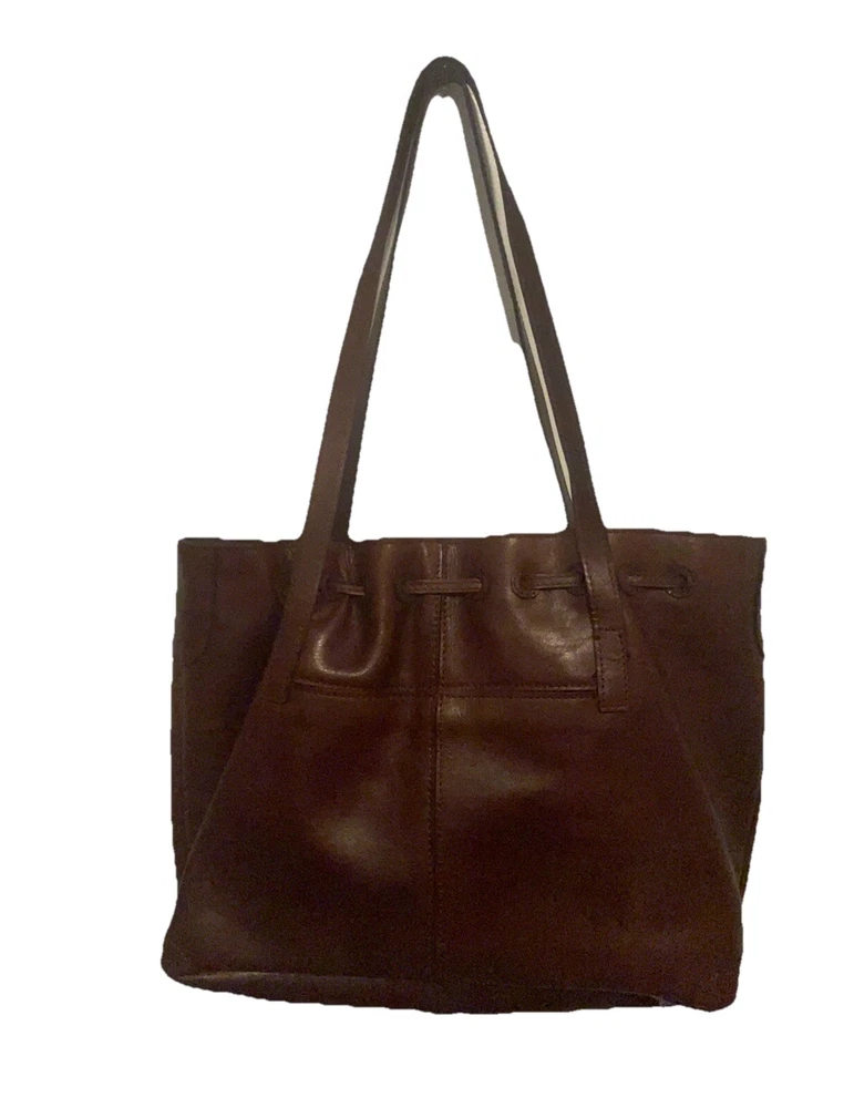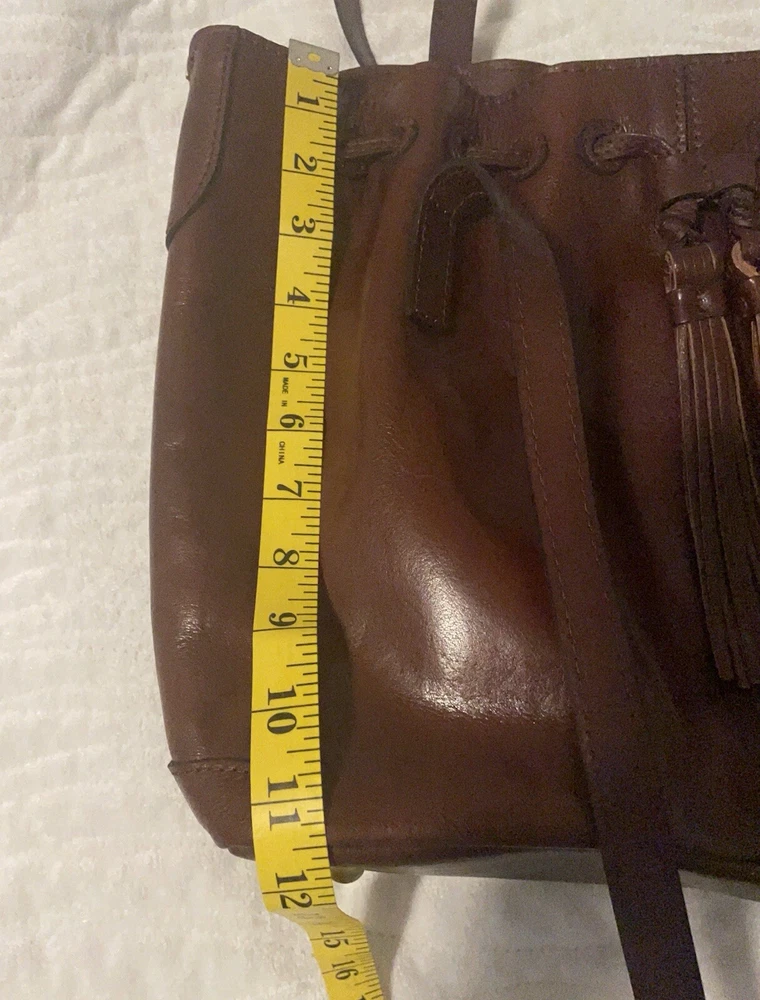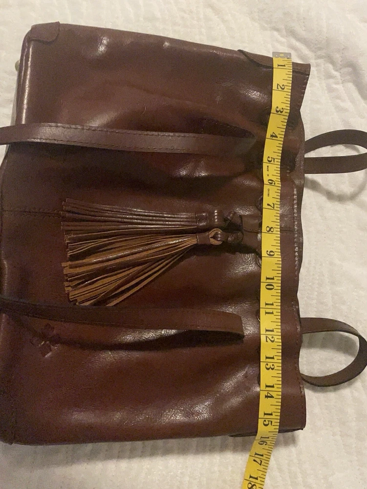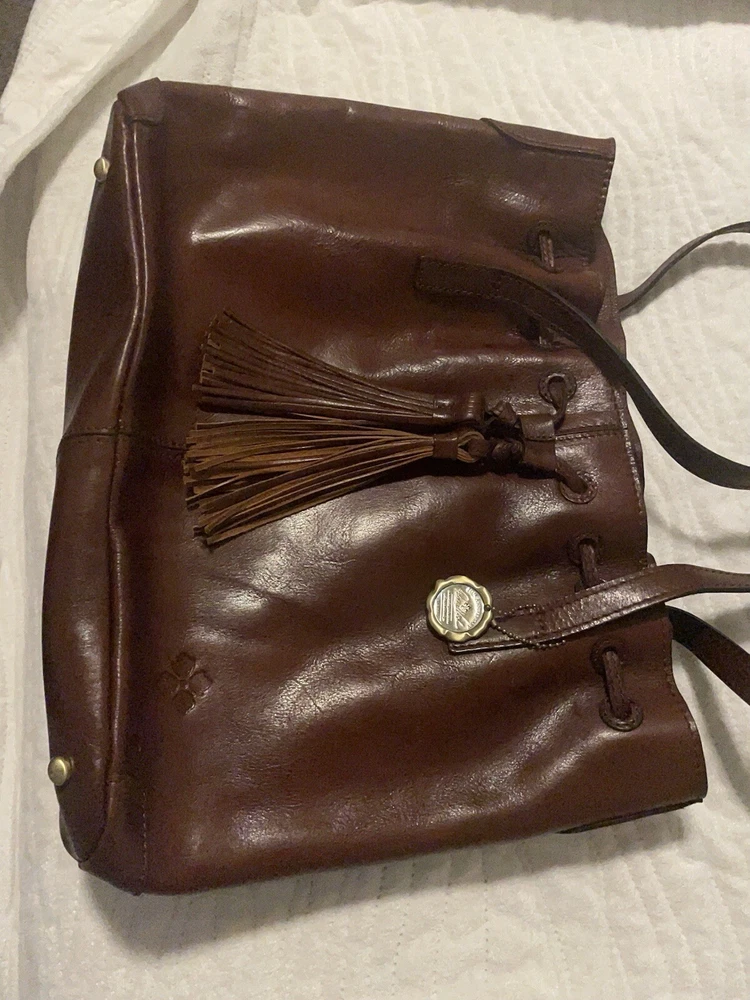 This beautiful Patricia Nash tote bag is perfect for any occasion. The drawstring closure and double handles make it easy to carry, while the tassel accents and gold hardware add a touch of elegance. The bag is made of high-quality brown leather and lined with soft suede, providing ample protection for your belongings. With a spacious interior measuring 16 inches in width, 11 inches in height, and 5 inches in depth, this large tote bag is ideal for travel, parties, workwear, and more. The bag also comes with a charming bag charm accessory and a durable leather handle/strap material. Get your hands on this classic and timeless piece from Patricia Nash's 10th anniversary collection today.