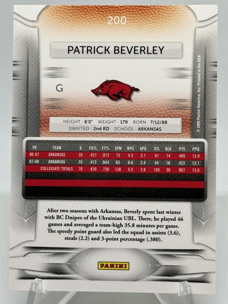 Sport: Basketball Card Number: 200 Features: Rookie, Base Set Type: Sports Trading Card Set: 2009-10 Panini Prestige Season: 2009 Card Name: 2009-10 Panini Prestige Patrick Beverley Rookie College Card #200 Player/Athlete: Patrick Beverley Vintage: No Year Manufactured: 2009 Original/Licensed Reprint: Original Team: Arkansas Razorbacks, Miami Heat, Houston Rockets Autographed: No Manufacturer: Panini League: National Collegiate Athletic Association (NCAA), National Basketball Association (NBA)