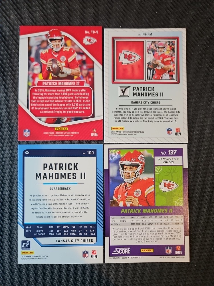 Set: 2022 rookies and stars, 2023 donruss optic, 2024 score, 2024 donruss Type: Sports Trading Card Sport: Football Season: 2022-23 Year Manufactured: 2023 Manufacturer: Panini League: National Football League (NFL) Player/Athlete: Patrick Mahomes II Number of Cards: 4