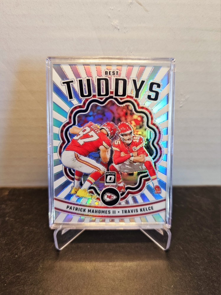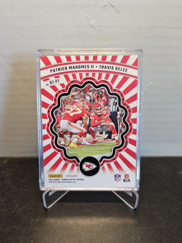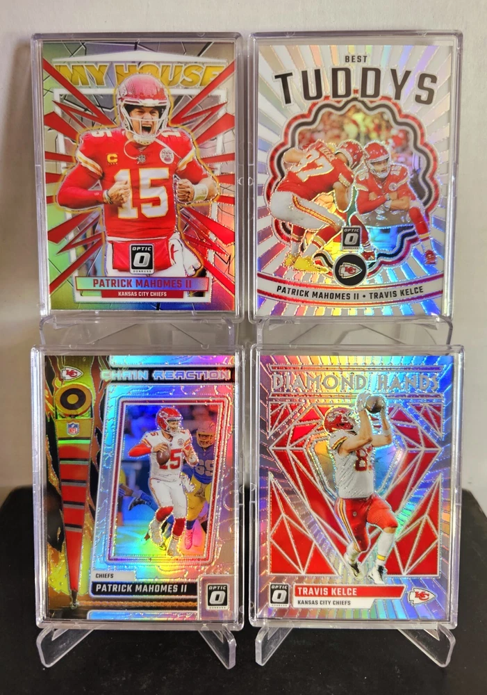 SNAP CASES INCLUDED IN THE PURCHASE OF THE CARDS. The product is a 2023 Panini Donruss Football trading card lot featuring Patrick Mahomes II and Travis Kelce from the Kansas City Chiefs. It includes multiple cards with Silver Prizm inserts, making them highly sought after. The cards are made of card stock and are part of the National Football League (NFL) series. These are original prints manufactured in the United States by Donruss, showcasing short print features for the 2023 season.