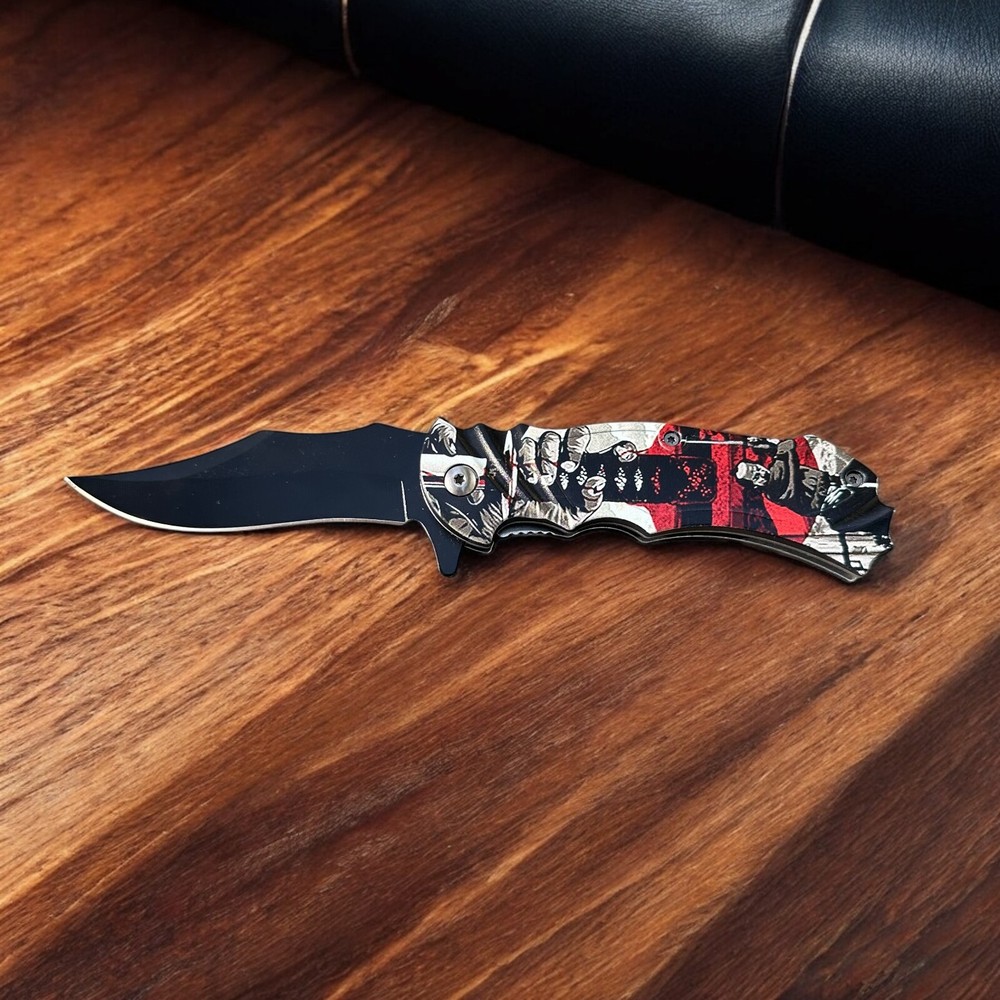This fierce folding knife is an absolute showstopper. Designed with a bold American skull print on a contoured grip handle, it blends street-style attitude with tactical practicality. Whether you’re adding to your collection or want something that stands out in your EDC, this knife makes a statement. 🔪 Features: 🛠️ Bold skull and patriotic warrior art on the handle 🗡️ Black hawkbill-style blade with wicked curves 💥 Glass breaker and belt cutter integrated in handle 🖐️ Finger-contoured grip for a secure hold 👖 Pocket clip for quick access ⚙️ Manual thumb stud opening Buyer must be 18+ and comply with all local, state, and federal laws.