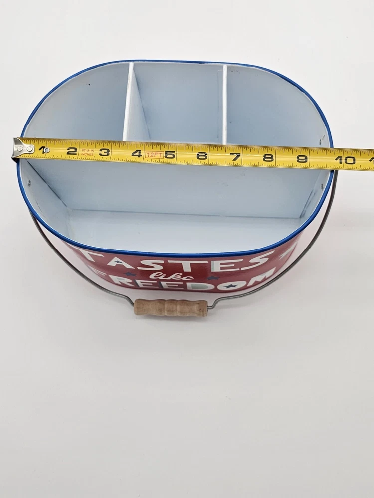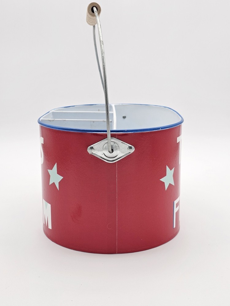 The handle leans a bit to one side. This is shown in the pictures. This 4th of July metal storage bin is perfect for those who want to add a touch of patriotism to their home decor. The bin features a metallic finish and is colored red, with stars adorning the design. Measuring 9.75 inches in length, 6.75 inches in width, and 5.5 inches in height, this storage bin is ideal for storing various items. Made from high-quality metal, this storage bin is durable and sturdy. The bin is perfect for those who want to keep their items safe and organized. Whether you're using it to store clothes, documents, or other items, this storage bin is sure to add a touch of elegance to your home. This is to be considered in acceptable condition with wear including scuffs, marks, nicks, tarnishing, discoloring, stains, dings, etc. These are used and are NOT mint. If any of this is unacceptable to you, please do NOT purchase this. Please review the photos/listing again before purchasing. This would make an amazing gift or addition to a collection and at an amazing price!!! Be sure to check out my eBay store! I have thousands of eclectic and cool collectibles, all at amazingly low prices!!! PLEASE READ: Please be aware that most of our items come from estate sales and other secondary owners. This means that the item(s) might have been exposed to smoke/pets/etc. Please take this in to consideration before bidding. We've done our best to include as many pics as possible to show the item's condition. Again, all items are sold as is. If an item states: "Sold for parts/Non Working/As-is", it means just that. SHIPPING: Please confirm that your address is correct. I will only ship to the address that is associated with your paypal/ebay account. Buyer pays all shipping costs unless "Free Shipping" is offered. After receiving cleared payment I will ship within three business days, holidays and weekends excluded. I pack all items as securely and safely as possible. I sometimes use recycled materials including cardboard boxes, bubble wrap and/or styrofoam packing peanuts. FEEDBACK: Your feedback is important to us. If your business with us is satisfactory, please leave a positive and we will do the same for you. Should there be any problems with this transaction please contact us and we will do our very best to correct them. RETURNS: Are accepted unless otherwise noted. Lastly, thank you for looking at my listing and have a great day!!!!!