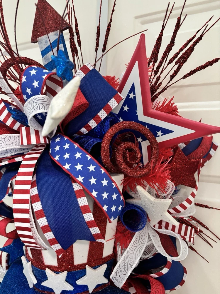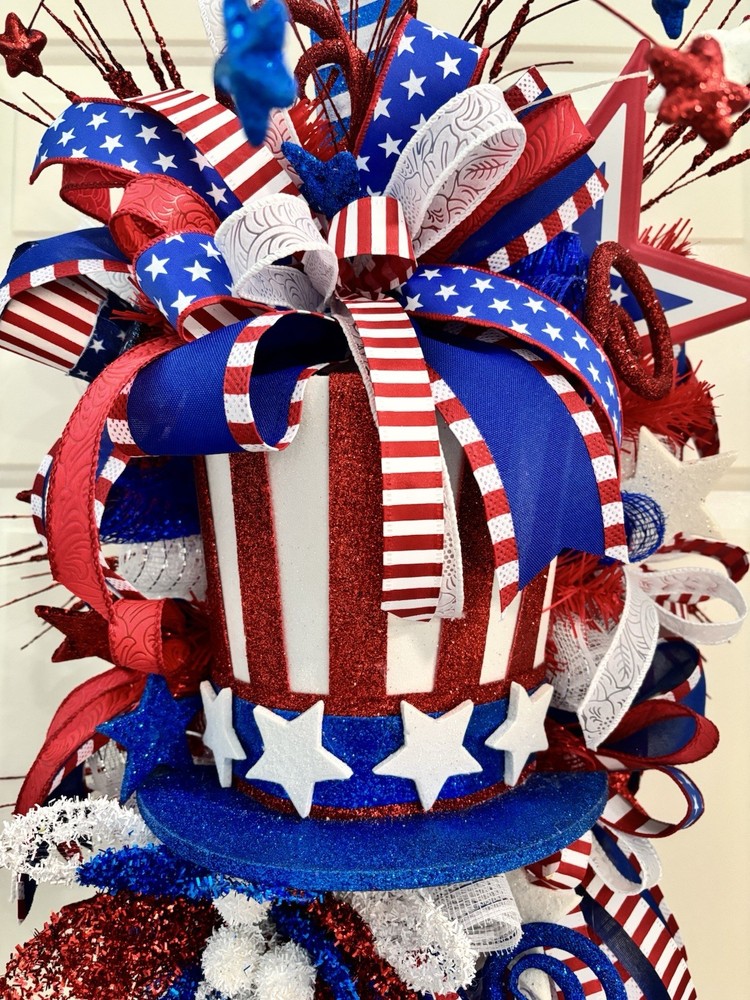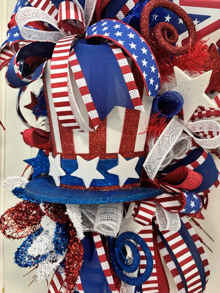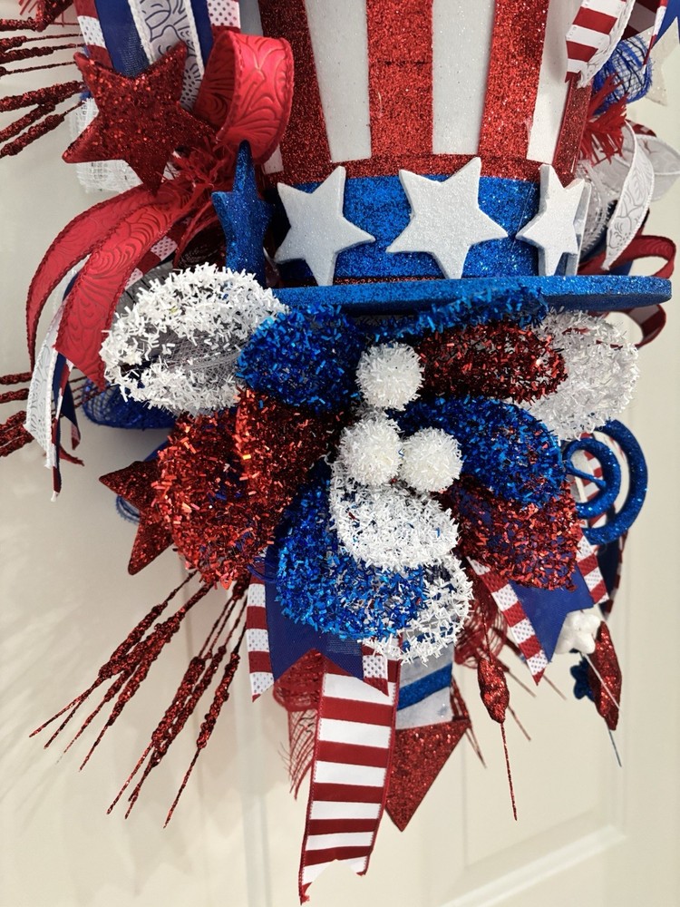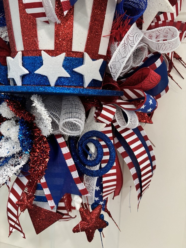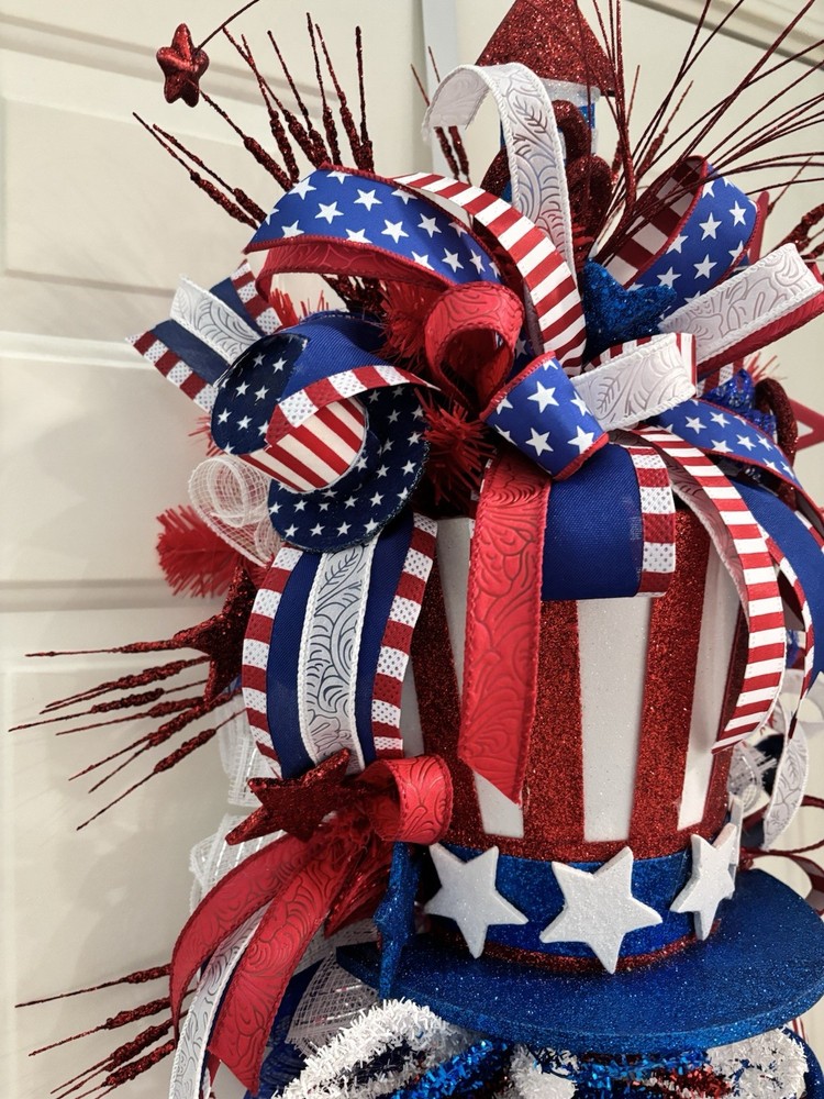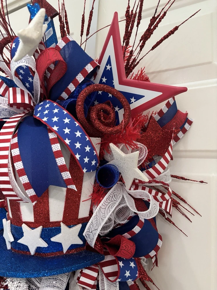 This Patriotic Americana 4th of July Wreath Door Swag Top Hat Stars Stripes is a handmade artificial wreath designed specifically for July 4th occasions. The wreath features stars and stripes, making it a perfect decoration for your front door or any room in your home to show off your patriotic spirit. Swag is packed full of fun ! Handmade one of a kind don’t let it get away !! Measures 27 in long by 16 in wide
