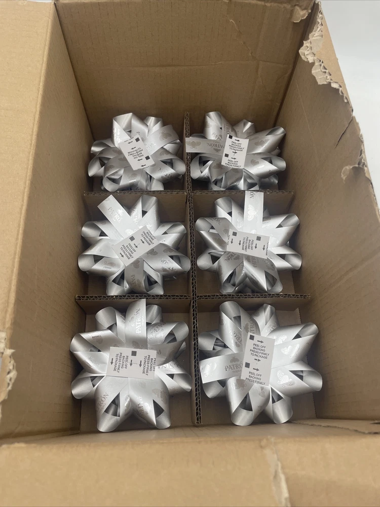 Add a touch of class to your gift wrapping with these beautiful silver bows. This lot of 17 bows is perfect for any occasion, from Christmas to birthdays. Featuring the iconic Patron Tequila brand, these bows are sure to impress. Each bow is made with high-quality materials and is easy to attach to any gift. The silver color adds a touch of elegance to your gift, making it stand out from the rest. These bows are a great addition to any gift wrapping supplies collection and are perfect for anyone who wants to add a little extra flair to their presents. New!