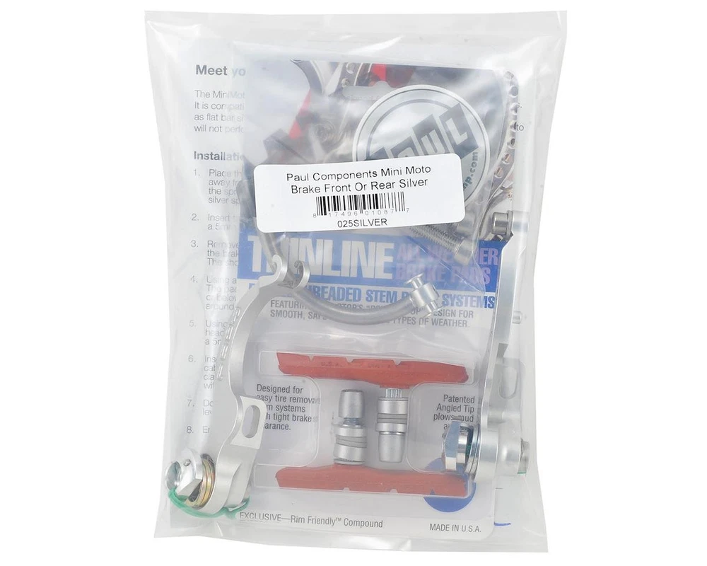 Like Paul's Motolite brake, the Mini Moto is a direct pull cantilever brake. This design is simpler to install than a traditional cantilever brake and gives the Mini Moto a narrow profile. The arms of the Mini Moto have been shortened to match the leverage of standard road brake levers, making the Mini Moto compatible with drop bar brake levers with integrated shifters. The short curved arms give plenty of clearance for cyclocross tires or wide fenders. The spring tension is independently adjustable for each arm which means the brake can be precisely centered on the wheel and adjusted for return strength. With a simple pivoting quick release on one arm, it’s easy to open the brake to remove a wheel. The cable enters the brake through a barrel adjuster at the top of the curved cable noodle. This adjuster makes it quick and painless to fine-tune the cable tension of the brake without tools. Like the rest of Paul's brakes, the Mini Moto has sealed stainless steel bushings in the pivots. These precisely machined bushings are what contact the brake posts of the frame and give the brake arms a smooth surface to pivot on. Features: Weighs 164 grams w/ all hardware and pads Teflon lined noodle with quick-release and barrel adjuster Machined in the USA of 6061 aluminum Sealed stainless steel pivots Clearance for knobby cyclocross tires and full fenders Kool-Stop Thinline Salmon pads included Specifications: Brake Type: Rim Brake Brake Lever Pull: Short Pull Brake Mechanism: Direct Pull (V-Brake/Linear Pull) Mount Type: Brazed-On Fittings (Posts) Front/Rear Specific: No Color: Silver Weight: 164g (Each) About Us | View Store