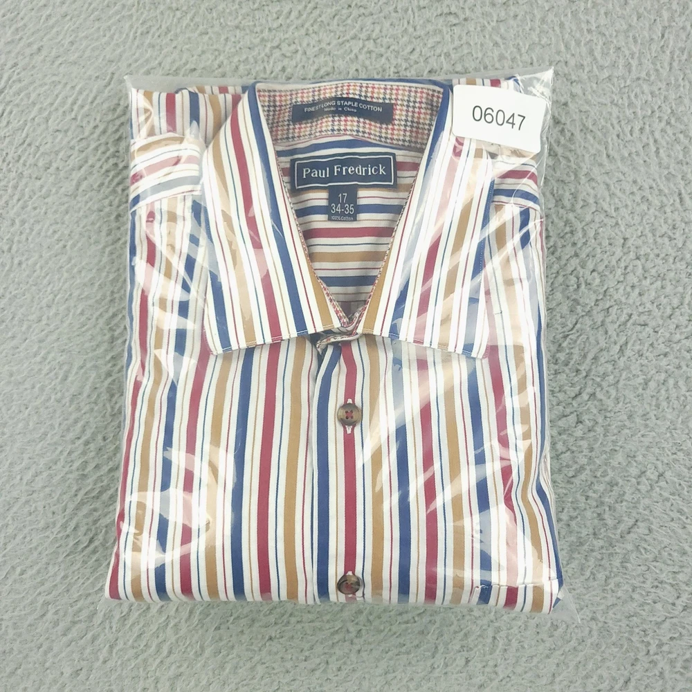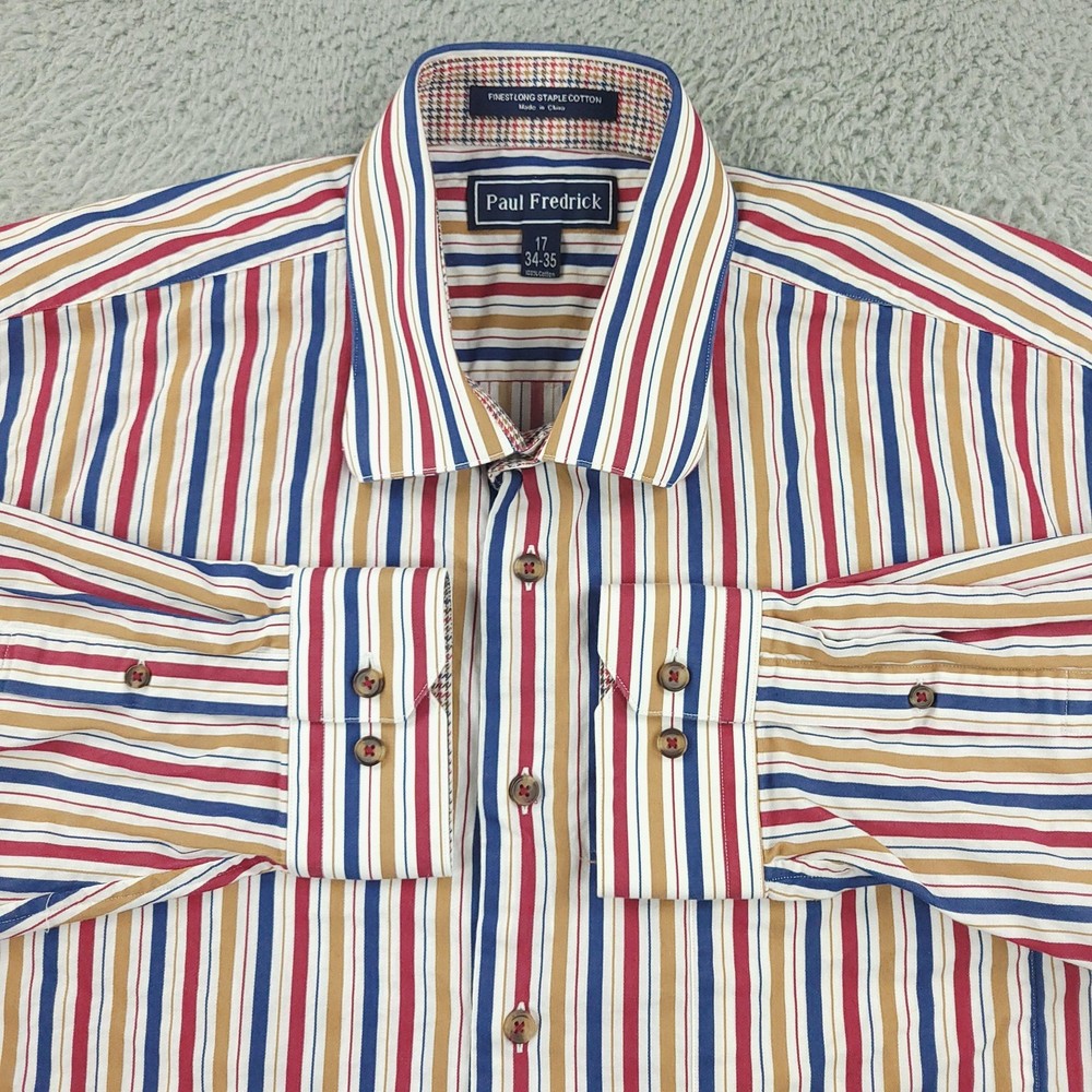 Paul Fredrick Dress Shirt Mens 17 34-35 Multicolor Stripe Cotton Long Sleeve Condition: Gently worn Brand: Paul Fredrick Tag size: 17 neck / 34-35 sleeve (Mens) Material: 100% Cotton Pattern/Color: Multicolor vertical stripes (red, blue, tan/gold, white) Features: Spread collar, button-front placket, single chest pocket Details: Adjustable two-button barrel cuffs, contrast houndstooth inside cuffs and collar stand Back yoke with pleats for ease; classic shirttail hem Made in China Washed and dried with Fragrance Free Detergent & Dryer Sheets. Measurements are included in the photos, compare measurements with your item to ensure proper fit. (Measurements are done with the item lying flat). I ship next business day and all items include tracking. Items are added daily to my store Visit My Store Buy More & Save! Combined shipping for US customers - $1.99 for each additional item (Add items to shopping cart and discounts will automatically calculate during checkout)