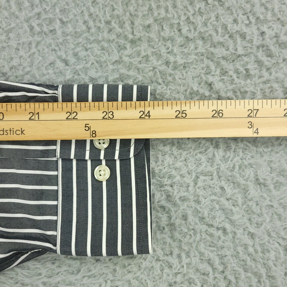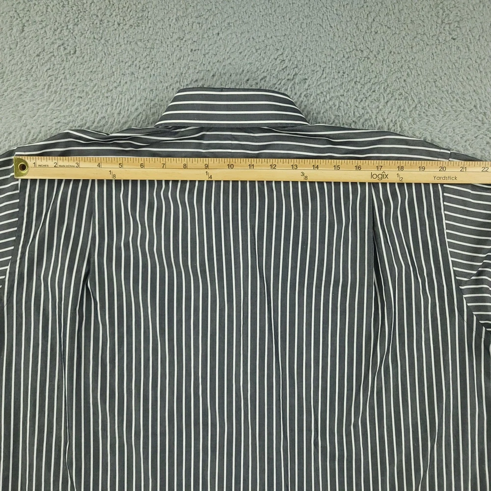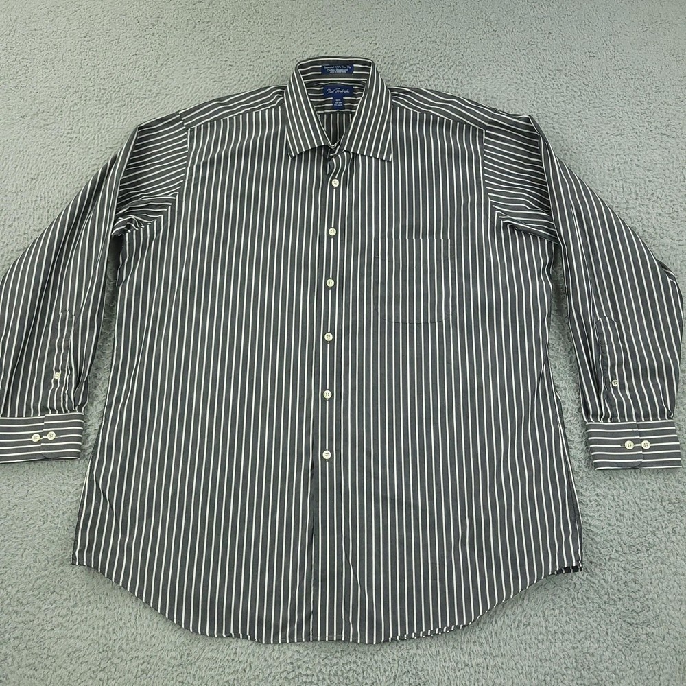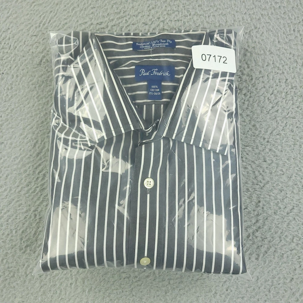 Paul Fredrick Dress Shirt Mens 17.5 34/35 Gray Stripe Cotton Point Collar Pocket Brand: Paul Fredrick Style: Mens long sleeve button-front dress shirt with point collar and single chest pocket. Color: Gray with vertical white stripe pattern. Tag size: 17.5 inch neck, 34/35 sleeve. Material: 100% cotton; labeled "Imperial 100's Two Ply Cotton Broadcloth"; made in Hong Kong. Details: Barrel cuffs with two buttons, curved shirttail hem, back shoulder pleats, collared neckline. Measurements are included in the photos, compare measurements with your item to ensure proper fit. Items are added daily click here to Visit My Store Combined shipping for US customers is 1.99 for each additional item Items are cleaned per eBay standards & policies