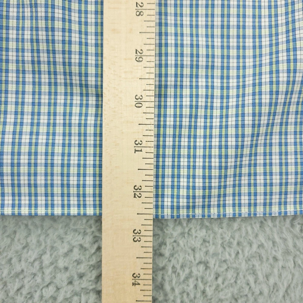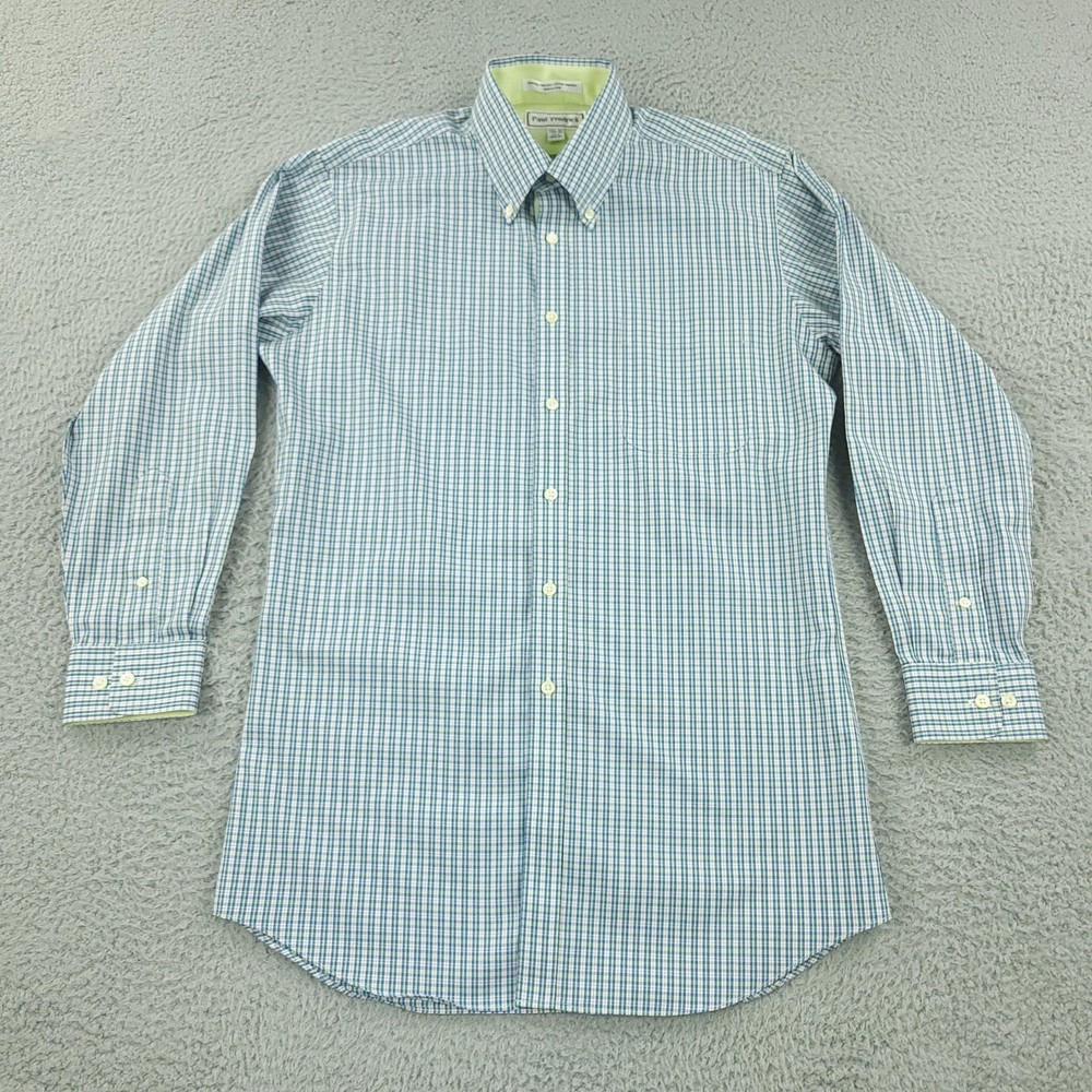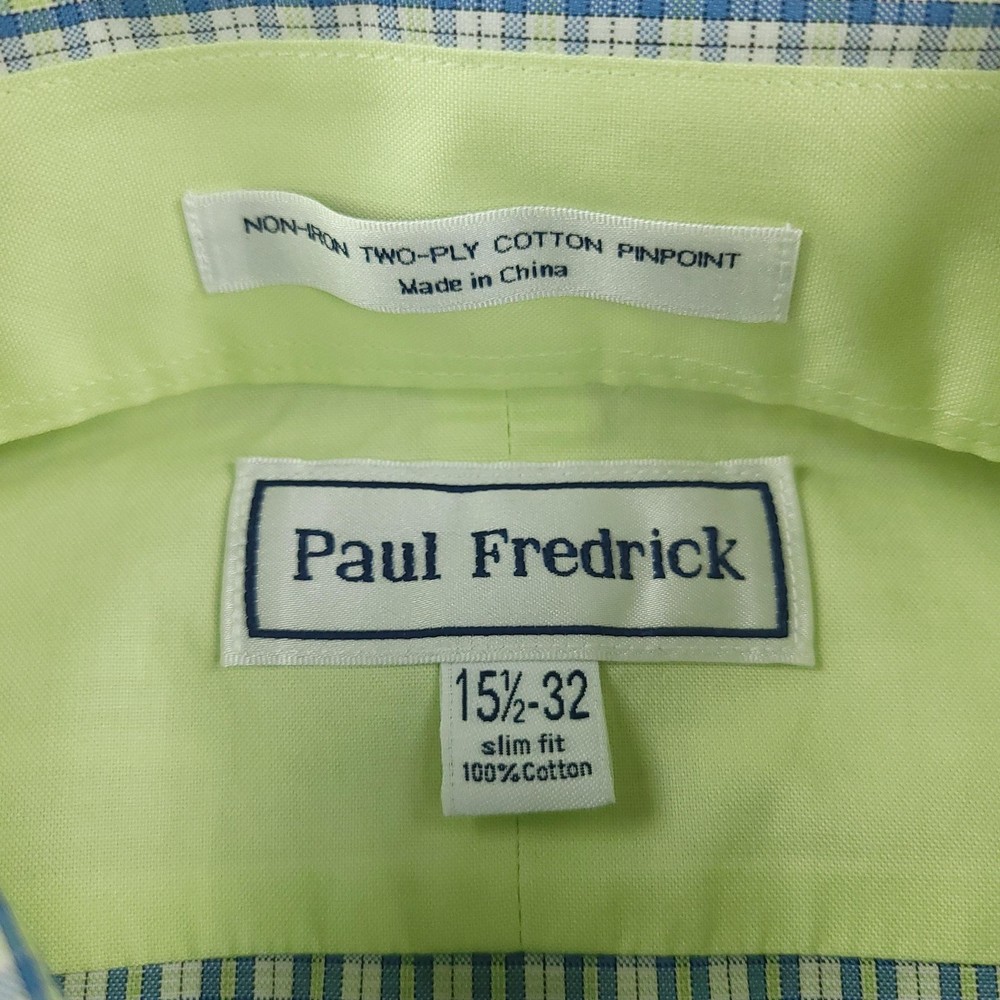 Brand: Paul Fredrick Style: Mens long sleeve button-down dress shirt with button-down collar and single chest pocket. Color: Blue and green small check pattern with light green contrast inner collar and cuffs. Size on tag: 15.5-32 (slim fit). Material: 100% cotton; non-iron two-ply cotton pinpoint; made in China. Details: Front button closure, barrel cuffs, curved hem, lightweight woven fabric, tailored slim fit design suitable for office or business casual wear. Washed and dried with Fragrance Free Detergent & Dryer Sheets. Measurements are included in the photos, compare measurements with your item to ensure proper fit. (Measurements are done with the item lying flat). I ship next business day and all items include tracking. Items are added daily to my store Visit My Store Buy More & Save! Combined shipping for US customers - $1.99 for each additional item (Add items to shopping cart and discounts will automatically calculate during checkout)