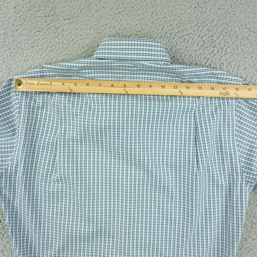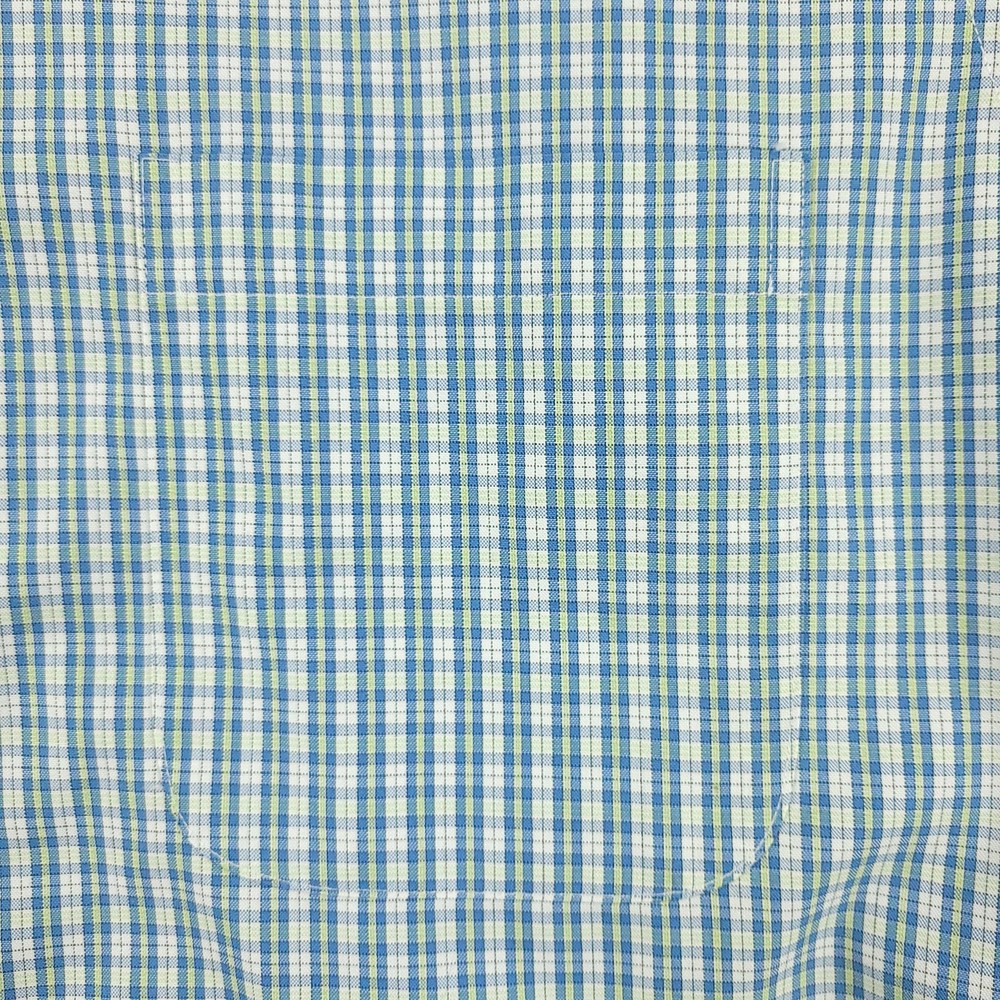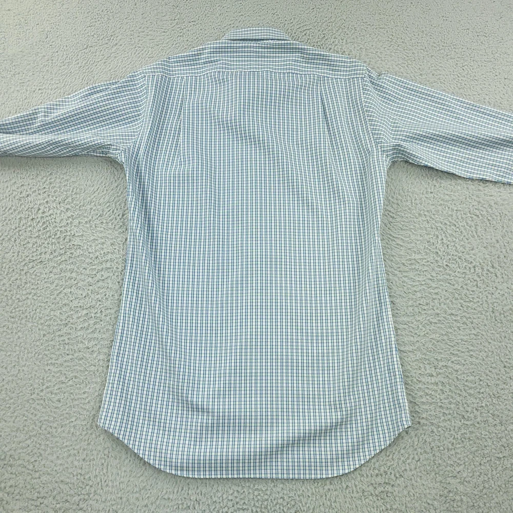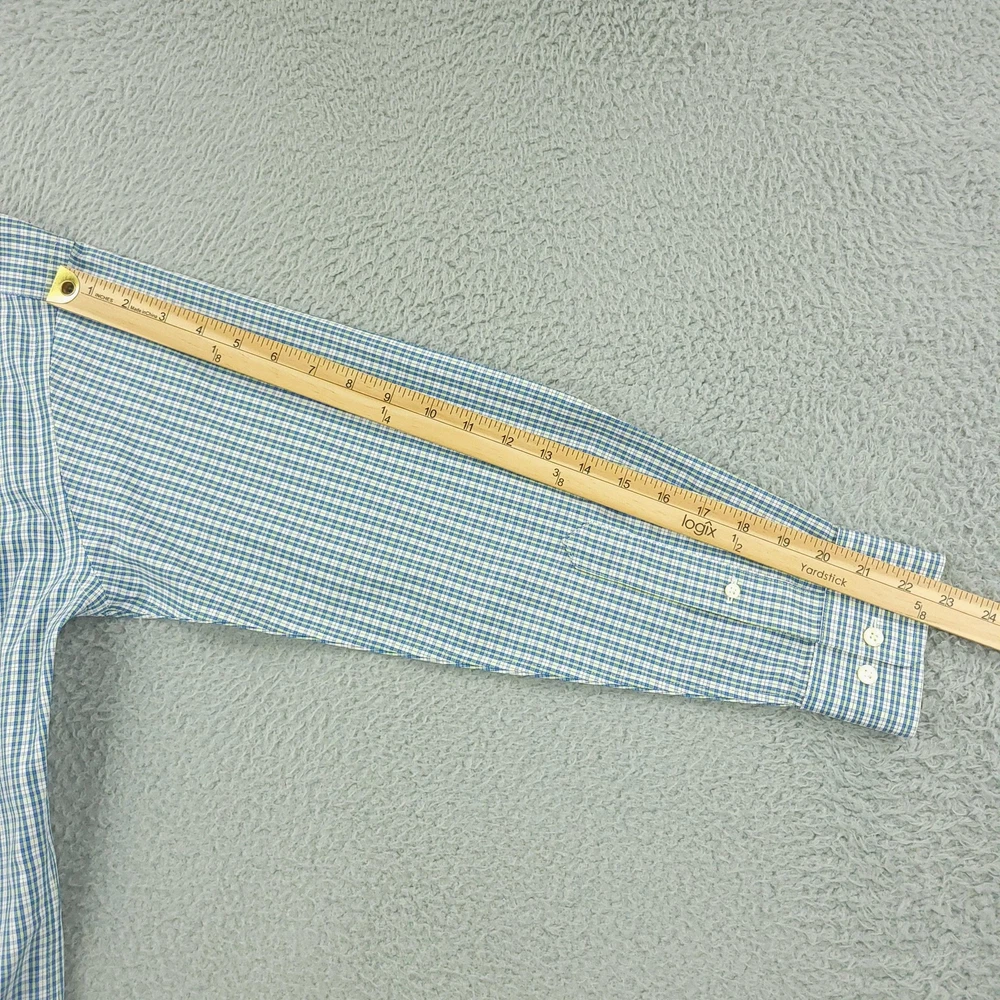 Brand: Paul Fredrick Style: Mens long sleeve button-down dress shirt with button-down collar and single chest pocket. Color: Blue and green small check pattern with light green contrast inner collar and cuffs. Size on tag: 15.5-32 (slim fit). Material: 100% cotton; non-iron two-ply cotton pinpoint; made in China. Details: Front button closure, barrel cuffs, curved hem, lightweight woven fabric, tailored slim fit design suitable for office or business casual wear. Washed and dried with Fragrance Free Detergent & Dryer Sheets. Measurements are included in the photos, compare measurements with your item to ensure proper fit. (Measurements are done with the item lying flat). I ship next business day and all items include tracking. Items are added daily to my store Visit My Store Buy More & Save! Combined shipping for US customers - $1.99 for each additional item (Add items to shopping cart and discounts will automatically calculate during checkout)