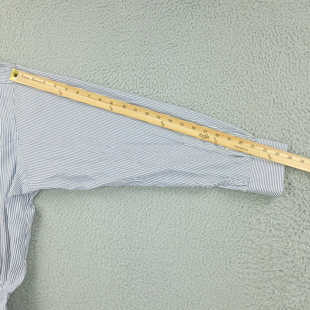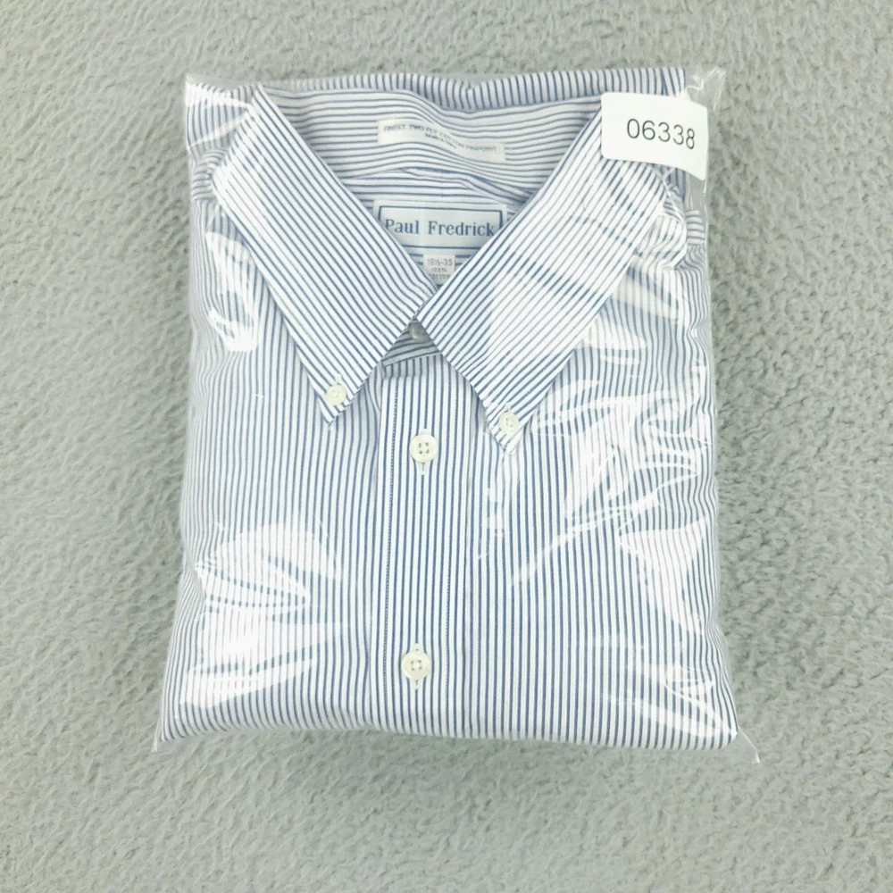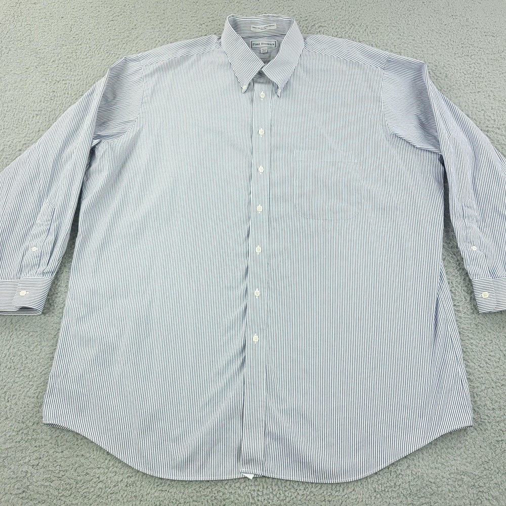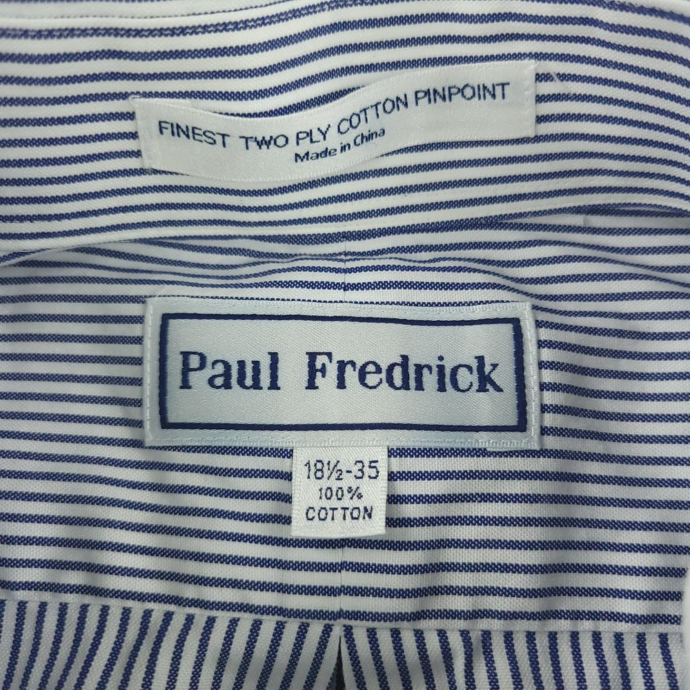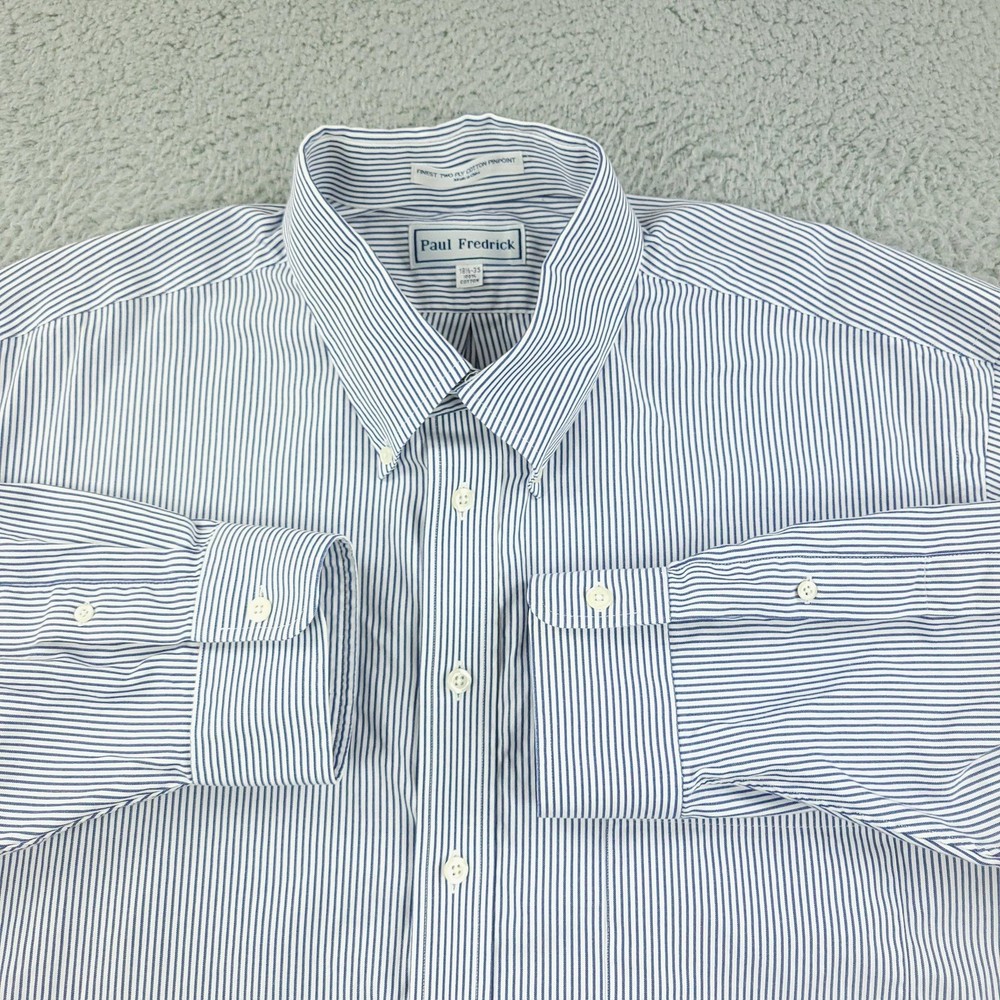 Brand: Paul Fredrick Style: Mens long sleeve button down dress shirt with blue and white vertical stripe pattern. Color: Blue and white stripes Material: 100% cotton; Finest two ply cotton pinpoint per tag. Made in China. Size on tag: 18 1/2 - 35 Details: Button-down collar, full front button closure, single chest pocket, rounded shirttail hem, barrel cuffs with button closure, back yoke with center box pleat, classic business dress styling. Washed and dried with Fragrance Free Detergent & Dryer Sheets. Measurements are included in the photos, compare measurements with your item to ensure proper fit. (Measurements are done with the item lying flat). I ship next business day and all items include tracking. Items are added daily to my store Visit My Store Buy More & Save! Combined shipping for US customers - $1.99 for each additional item (Add items to shopping cart and discounts will automatically calculate during checkout)