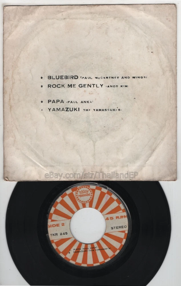 Welcome to The World of ""Thailand Vinyl Records"".Very rare and beutiful picture of cover. Check everyday . This item is for a true 7" single collector. It was printed and sold locally as limited EP back in the early 70's. Only few copies were spread outside Thailand. Most professional record collectors know that it is scarce nowadays and is absolutely a collector's item. If you know a UK magazine called RECORD COLLECTOR then you must have read many articles mentioning THAILAND EP and this is it !!! Here is your chance to own one-of-a-kind piece of Asian's 7" single history. Description Records !!! DETAIL SONG and ARTIST !!! Side A: A1 = Paul Mccartney And Wings - Bluebird / A2 = Andy Kim - Rock Me Gently Side B: B1 = Paul Anka - Papa / B2 = The Yamasuki's - Yamazuki Label&Catalogue number : : TKR245 Country of release : THAILAND Condition (Sleeve/Disc) : VG / VG and pls see picture too. Shipping I am seller in Thailand not USA.So I can not ship 4$ as policy pls understand this real rate from oversea . Price for shipping(Airmail )&Packaging to worldwide only US 14.99 USD .Except Asia and JAPAN only 14.99 USD. You can save cost for combine shipping only 3 USD$ per each. 2xEP=17.99 USD$ , 3xEP=20.99 USD$ . My package very safety by big cardboard don't worry about your's EP/PS/LP. Time delivered 21-45 days . ***All item : have tracking system no need add money*** **For normal shipping (Airmail).Time delivery to ITALY maybe use 1-2 Months, France use 1-2 Months.But Don't worry item will arrived to you sure!!.For fastest and High value you can use Express Mail Service cost for1 EP =39 USD.EP will arrived to you within 5-7 Days. ***All shipment have fully tracking system *** Payment PAYMENT : I accept the follow payment by eBay managed , . My ID eBay provide by eBay .Account will be provide at the end auction.Charges to be covered by winner. If you have question pls email to me anytime i can answer immediatly. I have many EP,PS 7" Thailand Pls Click => View seller's other items Check my feedback , I care and honest all customer.I welcome 0 feedback but contact me first if you will bidding. Good Luck !!!! and Enjoy . 45 RPM / EP/ LP Grading Scale: Mint /NM/ Excellent(VG++) /VG+/ VG /G+ /Good(G) / Fair / Poor / Bad (According Record Collector Magazine (UK))