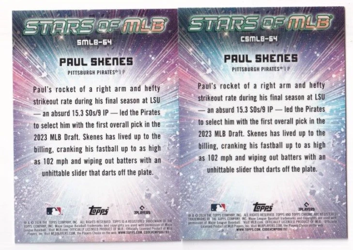 You are bidding on one LOT OF (2) PAUL SKENES 2024 TOPPS UPDATE SERIES RETAIL EXCLUSIVE STARS OF MLB ROOKIE INSERT CARDS: (1) BASE STARS OF MLB #SMLB-64 AND (1) CHROME STARS OF MLB PARALLEL #CSMLB-64. Shipping & Handling in the US is $2.00 MAILED IN AN EBAY STANDARD ENVELOPE WITH TRACKING . Please add .50 cents per extra auction won. Check my other auctions for new released cards from your favorite teams or players. Thank you.