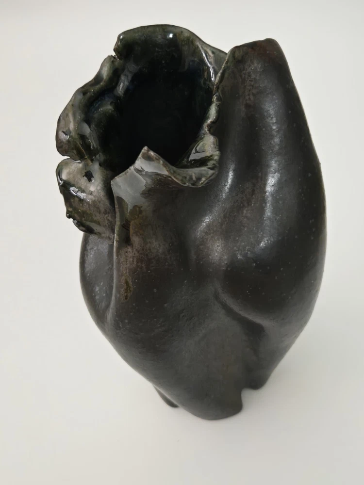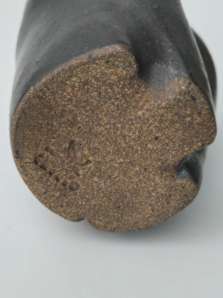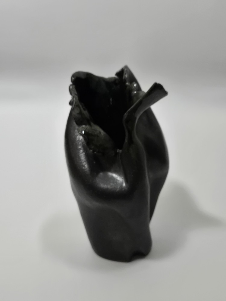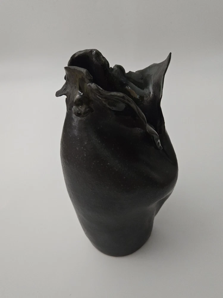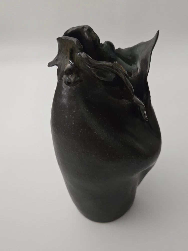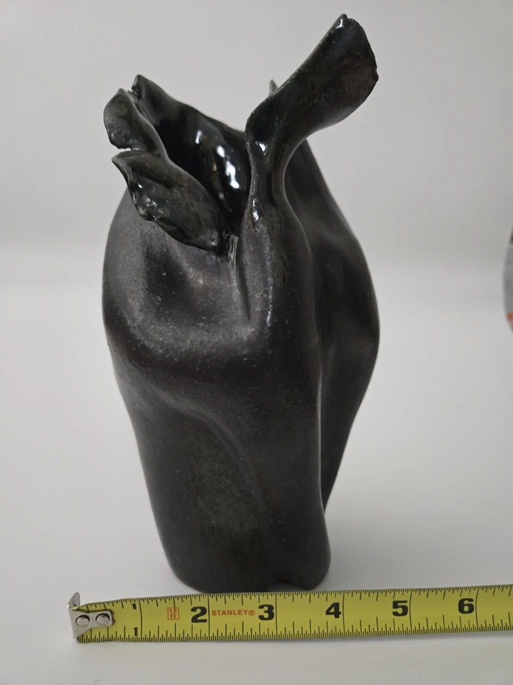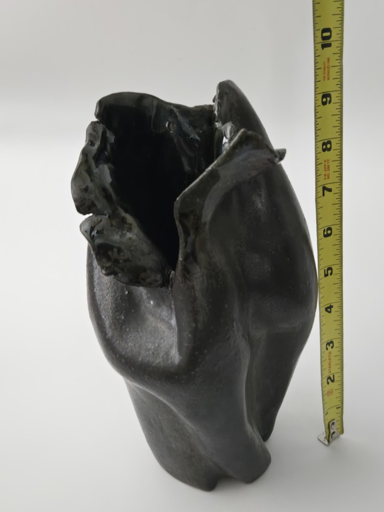 Offered here is a powerful and expressive sculptural vessel by Paula Brown-Steedly, founder of Virginia Clay Studio and a widely exhibited ceramic artist celebrated for her raw, organic forms and emotive approach to clay. This particular piece features a deeply folded design, almost floral in motion, with a dark, moody glaze that flows into shadowy black and slate. Entirely hand-built, this piece bridges art and function, suitable as a small vase, standalone sculpture, or focal point in a modern ceramic collection. The piece is signed on the base and measures approximately 10 inches tall. --- 🔍 Details: Artist: Paula Brown-Steedly Studio: Virginia Clay Medium: High-fired stoneware Color: Charcoal to black glaze with subtle iridescent luster Height: 10 inches Signature: Artist-stamped on the base Condition: Excellent with no chips, cracks, or repairs. Studio-made with intentional asymmetry and natural kiln texture. --- 🌟 Why It Stands Out: Brown-Steedly’s work is held in private and public collections and known for its sculptural language and Appalachian storytelling Each piece is one-of-a-kind and fully handmade—no two are alike Virginia Clay vessels rarely surface on the resale market; this is an opportunity to acquire a signed work from a sought-after American ceramicist