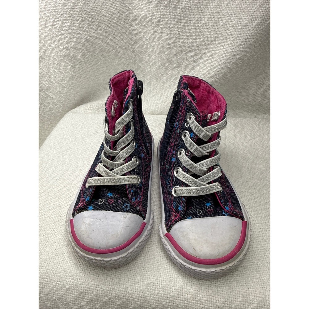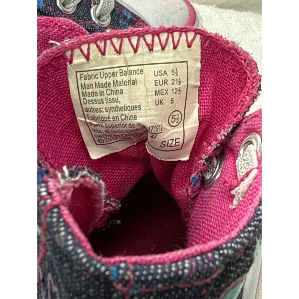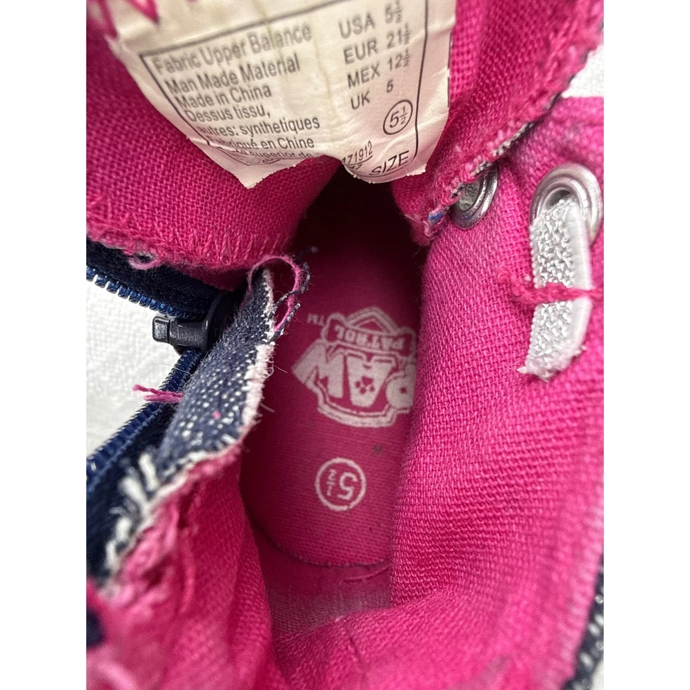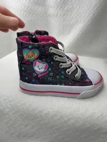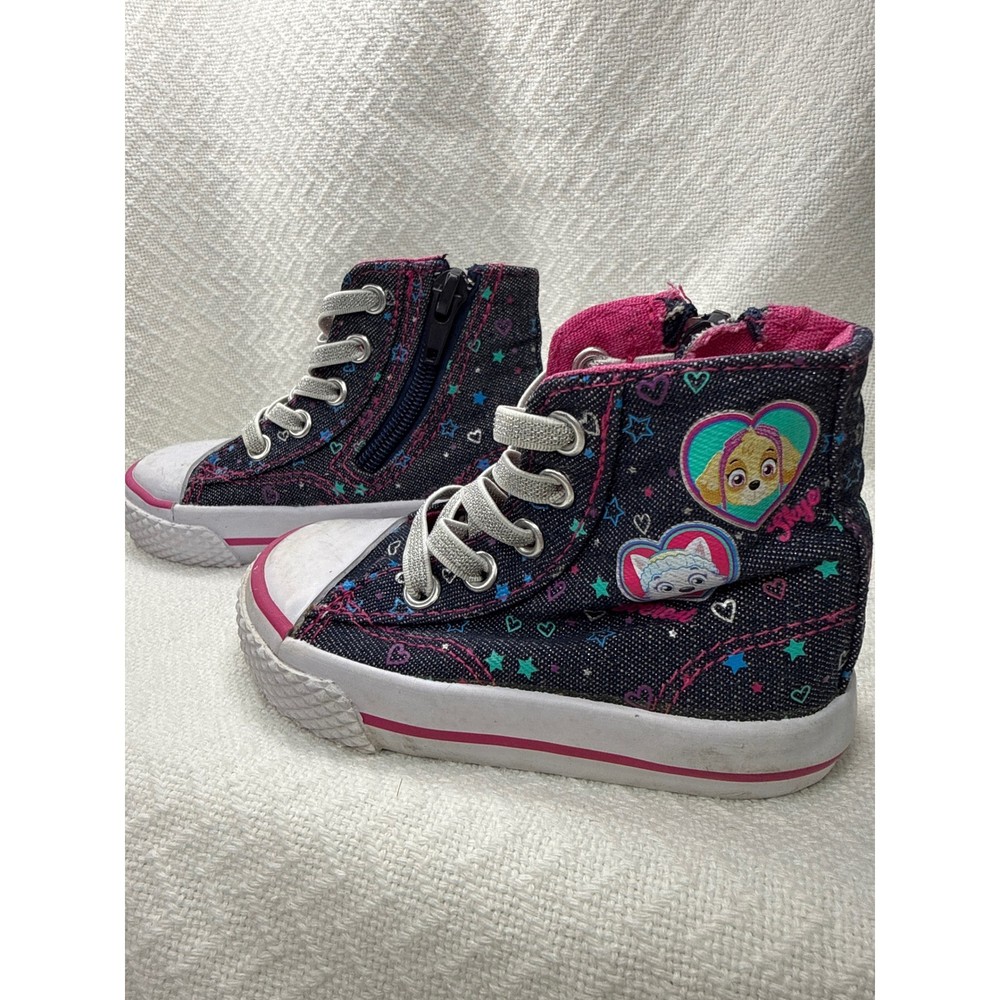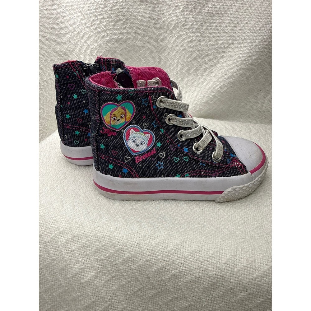 Adorable Paw Patrol high-top sneakers featuring Skye and Everest. These cute toddler shoes boast a stylish denim-like exterior adorned with hearts and stars. The shoes have a pink lining and accent stripes, along with a classic white toe cap and sole. Designed for convenience, they include a functional zipper on the side for easy on and off, complemented by decorative laces. Perfect for everyday wear, casual outings, or themed playdates, these Paw Patrol sneakers are sure to delight any young fan. Keywords: Paw Patrol shoes, Skye Everest, toddler sneakers, high top shoes, kids shoes, size 5.5, girls sneakers, zip up shoes, casual shoes, character shoes, denim look, pink accents, toddler fashion