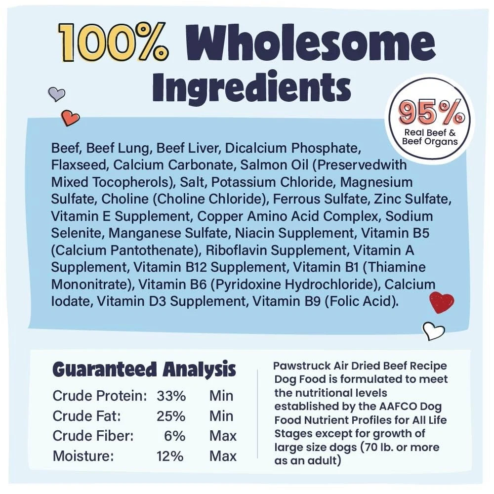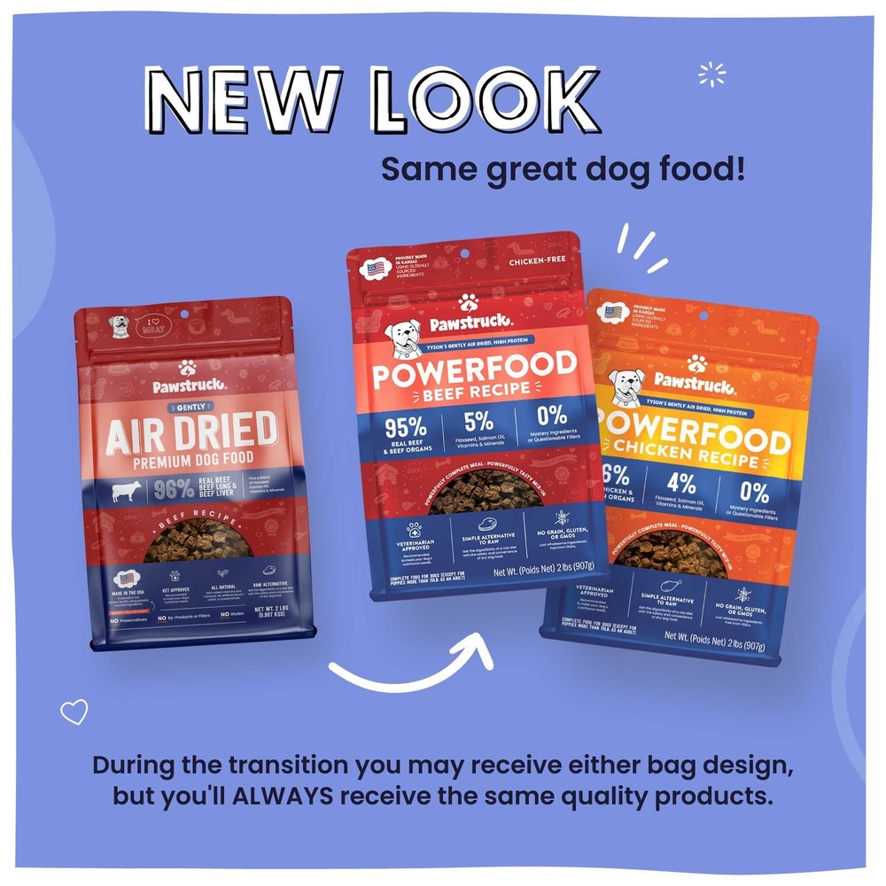 Pawstruck Air Dried Dog Food with Real Beef, Grain-Free, 2 Pound (Pack of 1) Description Features: Upgrade to Air Dried for More Nutrients: We slowly oven roast our food at a low temperature so each bite retains maximum nutrition and a crunchy texture bursting with flavor—a great alternative to highly-processed kibble. Real Beef is the #1 Ingredient: Single-protein, grain-free, gluten-free, and paleo-inspired recipe made with 96% beef to satisfy your pup’s carnivore cravings and a 4% blend of flaxseed, salmon oil, vitamins, & minerals to help support healthy joints and hips. Safely Made in the USA with only wholesome ingredients from around the globe, with added vitamins and minerals - entirely free from fillers. Get the digestibility of raw or freeze dried dog foods with the safety and convenience of dry dog food. Vet Recommended Complete Nutrition for All Life Stages: Our healthy dog food is vet recommended, AAFCO Compliant, and made in an SQF (Safe Quality Food) certified facility so you can rest assured that your pup is getting a safe, nutritious meal. For Pet Parents, By Pet Parents: All dogs deserve the very best - that’s why as a small business Pawstruck only makes natural & healthy recipes that we proudly feed our own dogs, using the strictest of quality standards. Our grain-free, small, medium and large breed dry dog food is custom-made to satisfy picky eaters. From small and large dry dog food to dry puppy food, we've blended the finest ingredients to create a food that's not only delicious but also meets the nutritional needs of small, medium and large breeds. Elevate your pup's dining experience with Pawstruck – because every tail deserves the best in grain free dog food! Product Details: Handling We will ship all orders within 1 business day of payment. Delivery We Do Not Ship Outside of the Continental US. Return Policy All items qualify for returns within 30 days of receipt. Buyer is responsible for return shipping on any item that is not damaged. Feedback We take our reputation seriously, we buy and sell online, so we understand the value of trust. If you are unsatisfied with your order, please contact us and we will work with you to resolve it to your satisfaction.