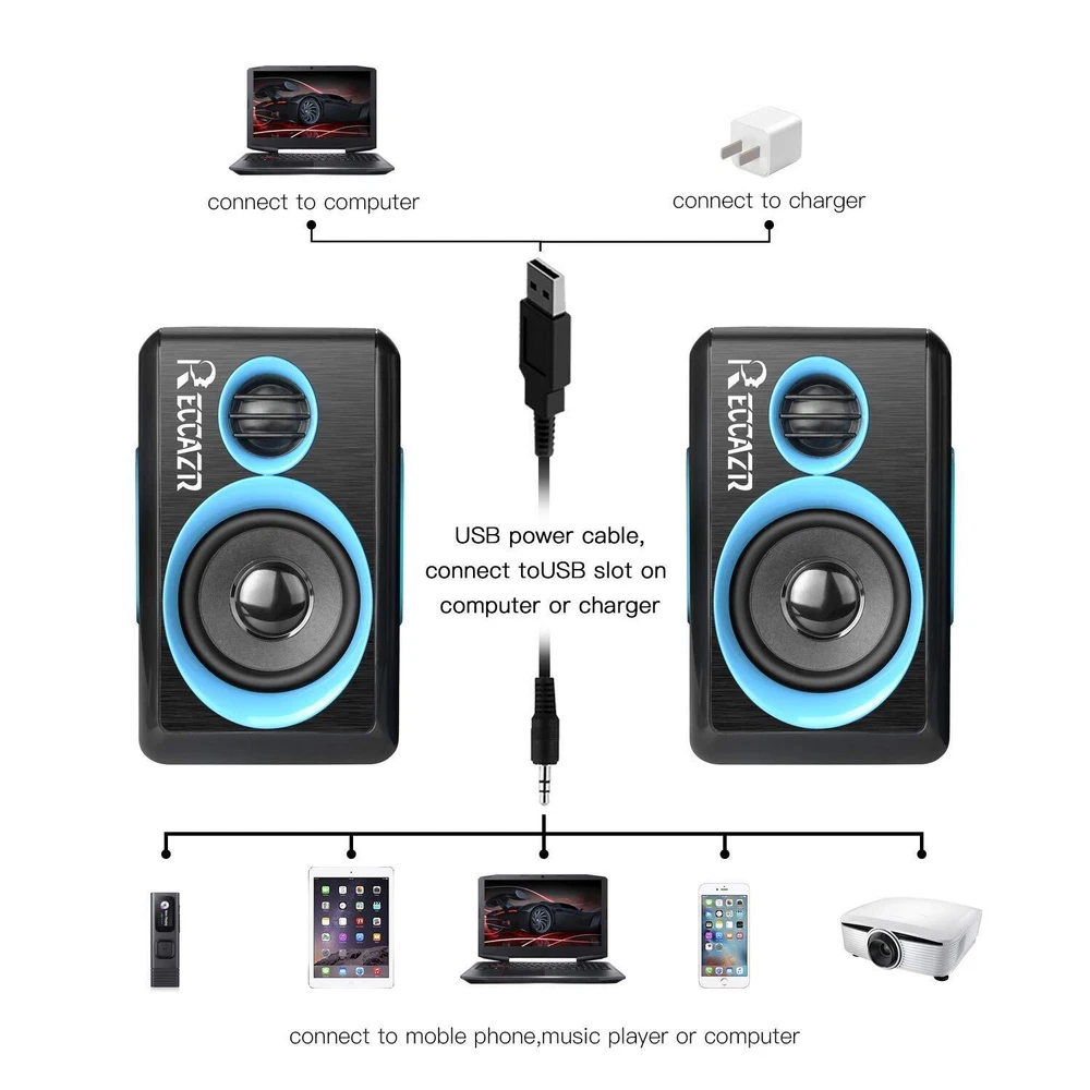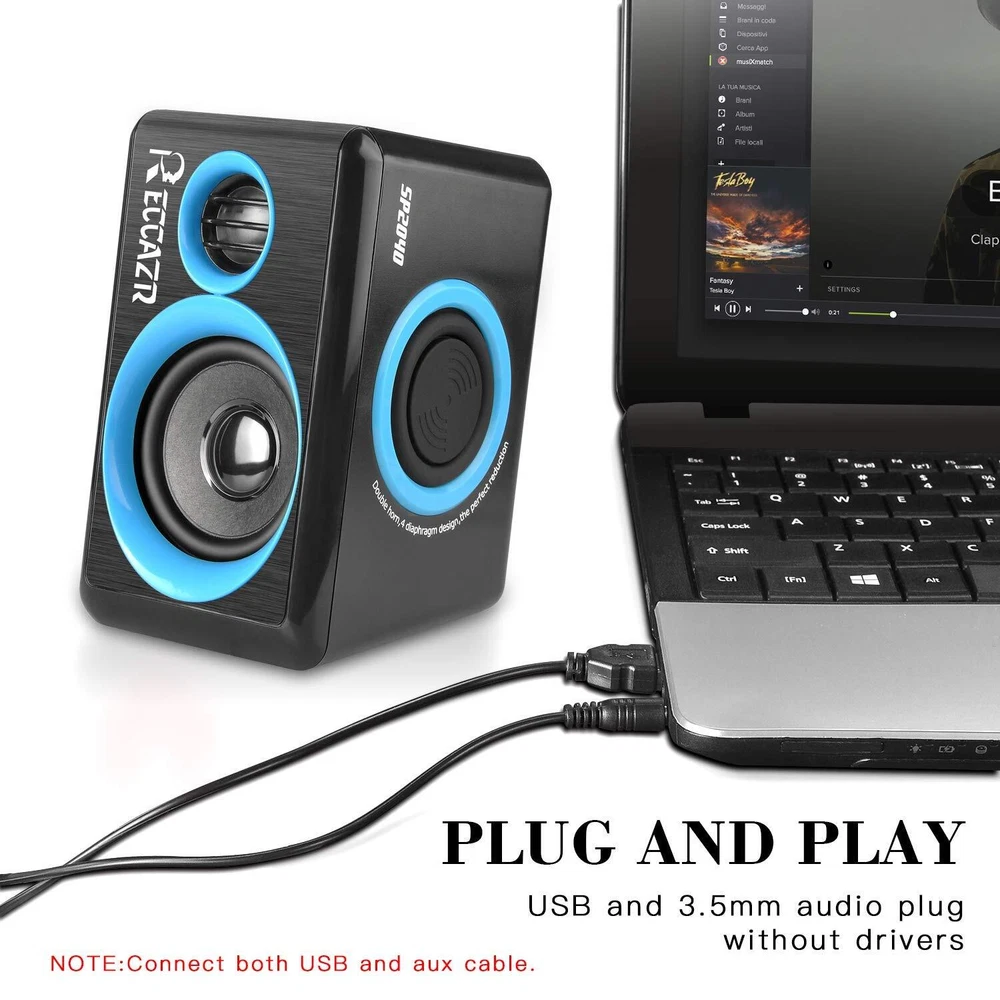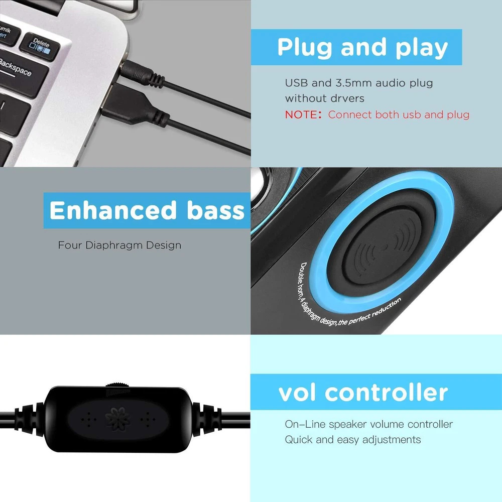 Pc Computer Speakers Surround Sound Usb Wired Laptop Deep Bass Desktop Blue 【Rich and strong stereo sound】Built-in Four Loudspeaker Diaphragm and Subwoofer Multimedia Speakers,The laptop USB speakers deliver Clear Rich and strong stereo sound for your computer,Turn your desktop computer or laptop into the ultimate sound system. These USB Powered Computer Speakers will fill the room with your music, movies, or computer games. 【The Compact Design】The small size allows the speakers to easily sit on your desk. And the USB power means you can take them with you and plug directly into your computer for music on the go. 【One Finger Control】Turn the speakers on and the volume up with one simple control on the line of the speakers for quick access. 【Compatible with Multiple Devices】It Compatible with PC, laptops,desktop,notebooks, Kindle Fire,smart phones, tablets, MP3, MP4 and more devices. 【Plug And Play】USB Powered and 3.5mm Audio Input,Just plug the USB cable into your device or the wall and plug the 3.5mm jack into your audio device and not need drives. Shipping We offer FREE shipping on all orders! We ship within Three business days of payment, usually sooner. We use a selection of shipping services such as UPS, FedEx, USPS etc. We only ship to the lower 48 states, no APO/FPO addresses or PO Boxes allowed. Local pickups and combined shipping options are not provided at this time. Return You can return a product for up to 30 days from the date you purchased it. Any product you return must be in the same condition you received it and in the original packaging. Please keep the receipt. Payment We accept payment by any of the following methods: PayPal Please pay as soon as possible after winning an auction, as that will allow us to post your item to you sooner! Feedback Customer satisfaction is very important to us. If you have any problem with your order, please contact us and we will do our best to make you satisfied. Contact Us If you have any queries, please contact us via ebay. We usually respond within 24 hours on weekdays. Please visit our eBay store to check out other items for sale! Thank you for shopping at our store.