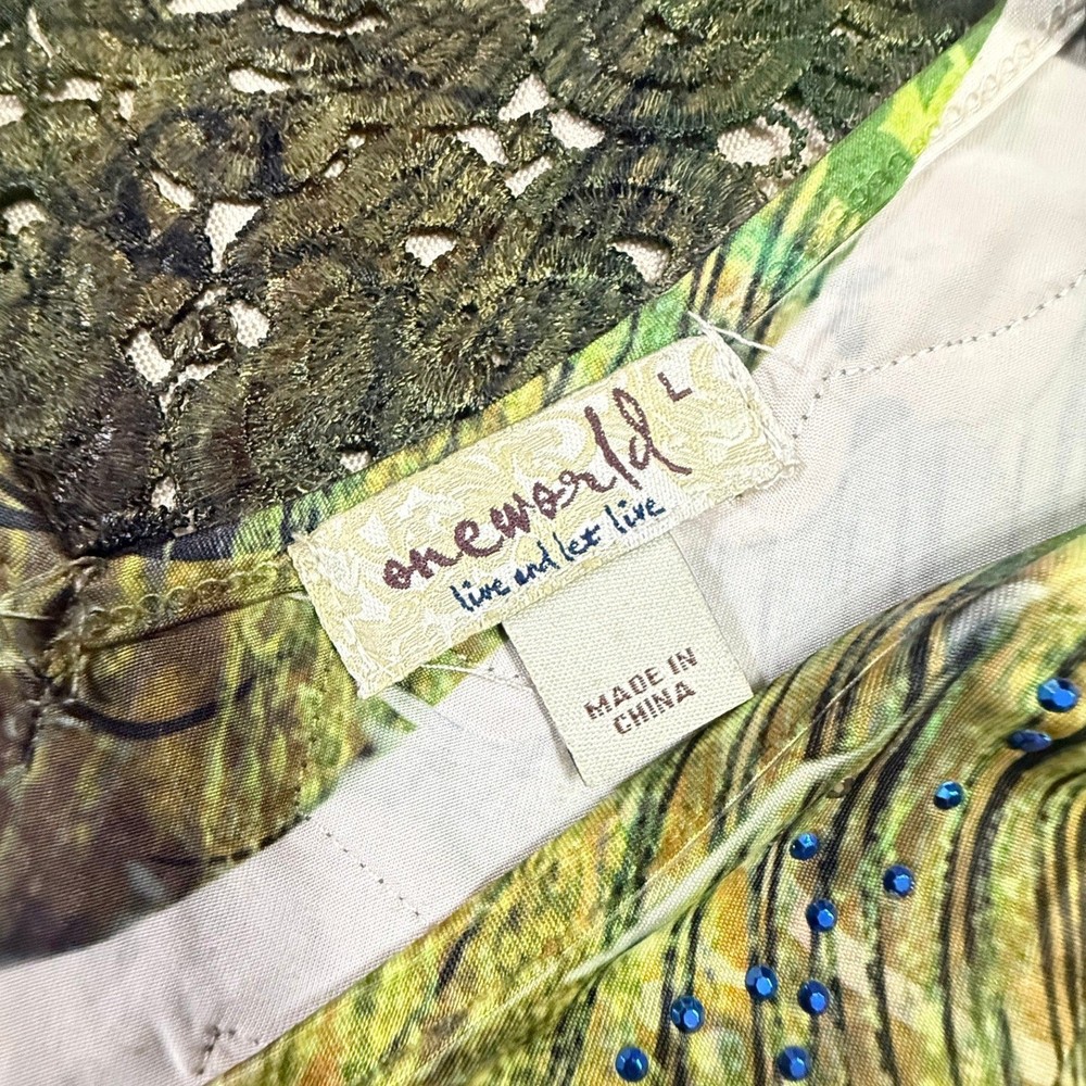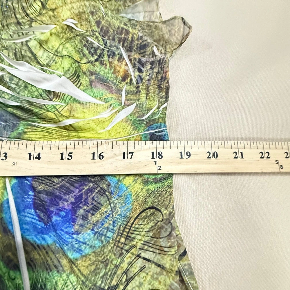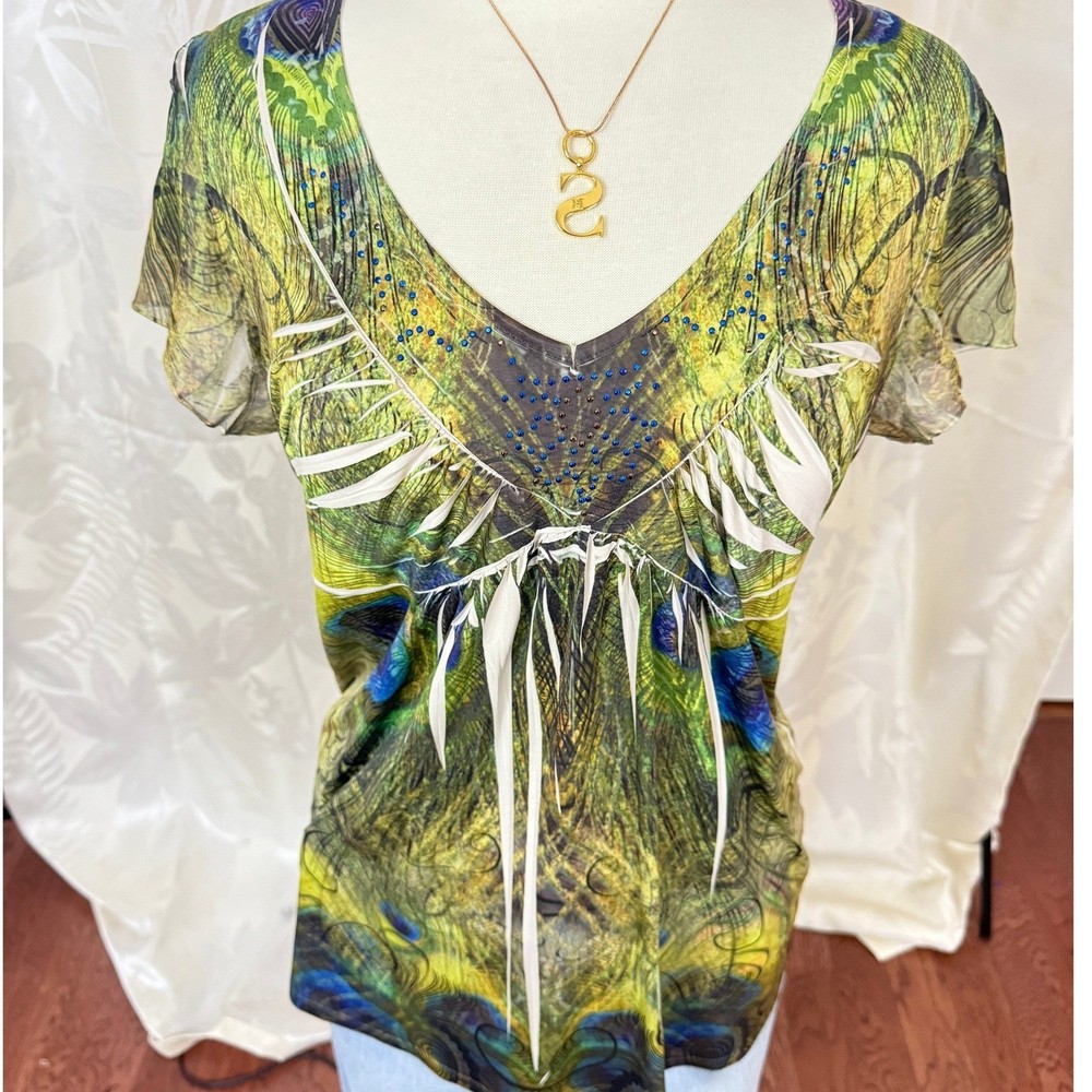 Women's top with a vibrant peacock feather print and rhinestones. Measurements: • Bust: 18 in • Length: 25 in Type: Blouse Department: Women Style: Tunic Material: Polyester, Spandex Neckline: V-Neck Sleeve Length: Short Sleeve Sleeve Type: Flutter Sleeve Pattern: Animal Print Accents: Rhinestone, Beaded Theme: Bird Features: Lightweight, Contrasting Trim Fit: Regular Fabric Type: Mesh Occasion: Casual, Party/Cocktail Keywords: peacock print, feather print, v neck top, short sleeve, rhinestone accent, lace trim, women's top, casual top, statement top, printed blouse, unique print, fashion top, summer top, spring top