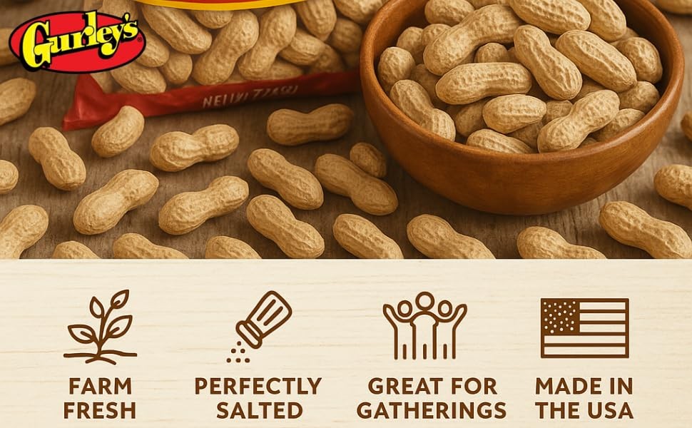 Introducing Gurley's Premium Salted Peanuts in the Shell, an exceptional choice for snack enthusiasts seeking the finest quality peanuts. Our 10-pound bulk box of jumbo-sized, roasted peanuts is perfect for parties, family gatherings, or simply enjoying a satisfying snack. Carefully selected for their superior quality, these peanuts are roasted to perfection and lightly salted to enhance their natural flavor, making them an irresistible treat for any occasion. Gurley's salted peanuts in the shell offer a delightful crunch that is sure to please any palate. Our peanuts are meticulously roasted, ensuring each one is packed with flavor and retains its wholesome goodness. These peanuts are not only a delicious snack but also a great source of protein and healthy fats, supporting a balanced diet. Our commitment to quality guarantees that every peanut you enjoy is of the highest standard. Whether you're hosting a party or looking for a convenient snack, Gurley's roasted peanuts are the perfect choice. Our 10-pound jumbo party pack ensures you have plenty to share with friends and family. These peanuts are ideal for savoring during your favorite sporting events, movie nights, or casual get-togethers. Additionally, their deliciously salty taste and crunchy texture make them an excellent option for satisfying your cravings. Embrace the quality and flavor of Gurley's salted peanuts and enjoy the convenience of our bulk packaging. Our peanuts in shell are an excellent choice for those seeking a natural and nutritious snack. Let Gurley's enhance your snack experience with our premium salted peanuts in the shell, perfect for any occasion. Fancy Peanuts in Shell: Indulge in our premium fancy and jumbo peanuts in shell, perfect for any occasion. Gurley's peanuts salted are fire roasted to perfection, offer a delightful crunch and rich flavor, making them ideal for parties or snacking. In-Shell for Fun, Engaging Snacking – These in shell peanuts come in their shells, adding a fun element to snacking that’s perfect for game days, movie nights, or just relaxing. Crack open each shell to enjoy fresh-tasting peanuts, a traditional favorite that brings extra enjoyment to snacking. Healthy High-Protein Snack Option – Packed with plant-based protein, fiber, and essential nutrients, these in-shell peanuts make a nutritious choice for those seeking healthier, energy-boosting snacks. Ideal for fueling up between meals, post-workout, or as a satisfying low calorie keto snack that helps curb hunger. Ideal for Sharing: With 10 pounds of peanuts salted and roasted to perfection, this bulk box is perfect for parties or large gatherings. These salted peanuts in the shell provide a delightful eating experience that's sure to please guests and family alike. Natural Nutty Flavor: Our peanuts in shell offer a delectable balance between salt and roasted flavor. Unlike raw peanuts in the shell or deep fried peanuts in shell, these salted peanuts provide a wholesome taste, making them a versatile snack or ingredient.