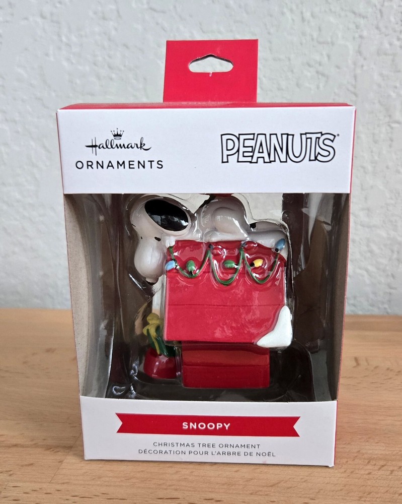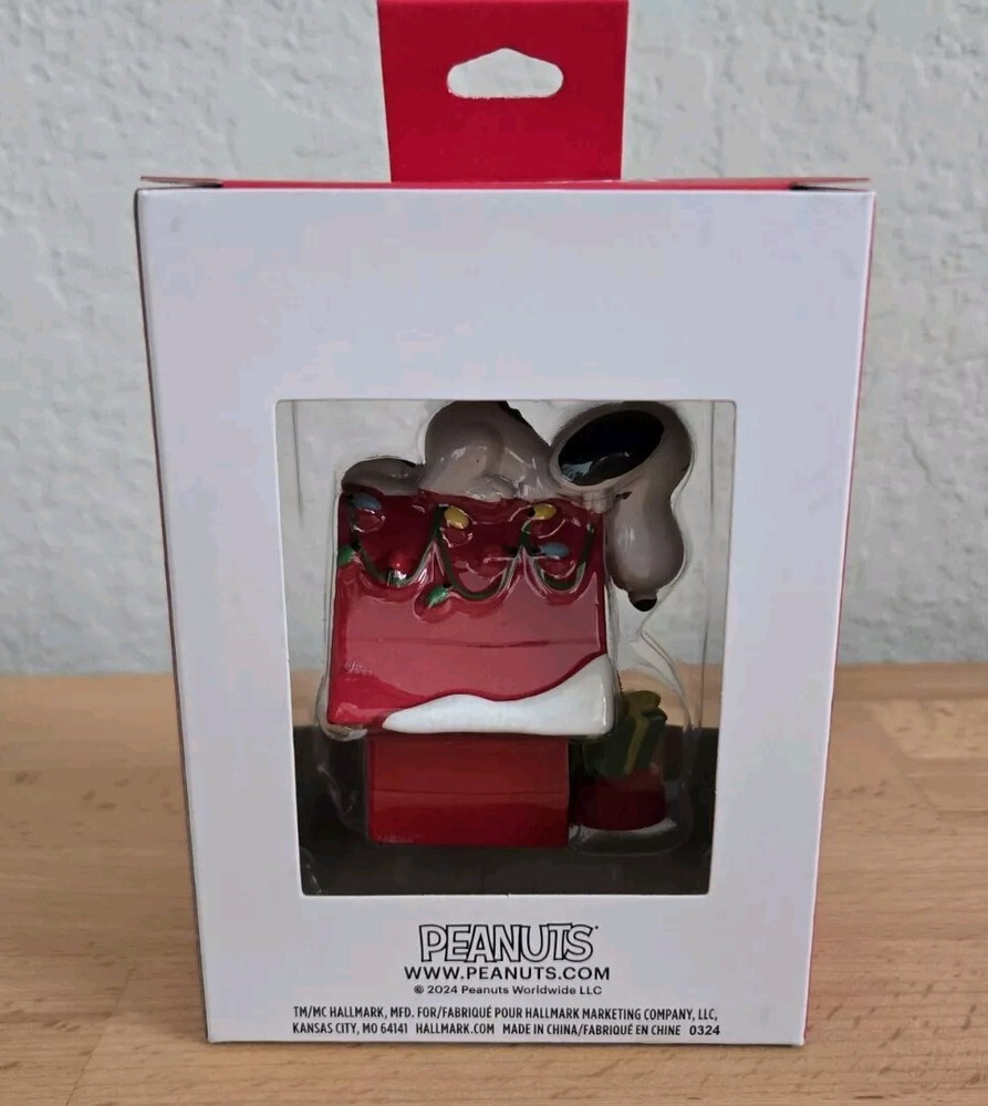 *Free shipping with USPS Ground Advantage. Ships ASAP. Packaged with care. Smoke-free home.* This Hallmark ornament features Snoopy from the Peanuts comic strip laying on top of a red doghouse, making it a perfect addition to a Christmas tree. The small ornament is multicolored and depicts the beloved cartoon character with a festive Christmas theme. It is part of the Peanuts franchise and comes boxed for easy storage. The item is 2.75 inches tall and was manufactured in 2024.