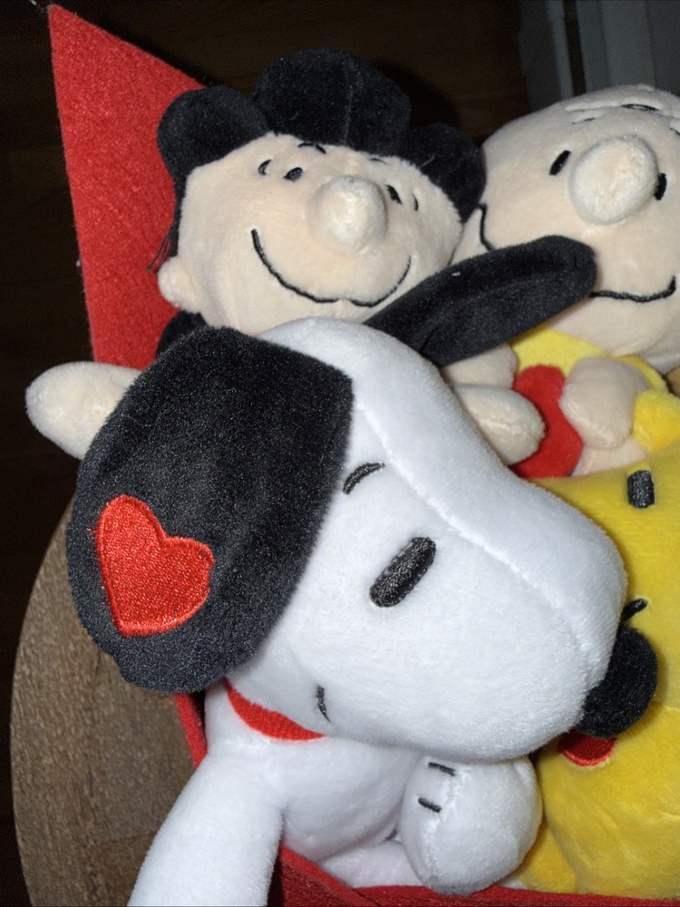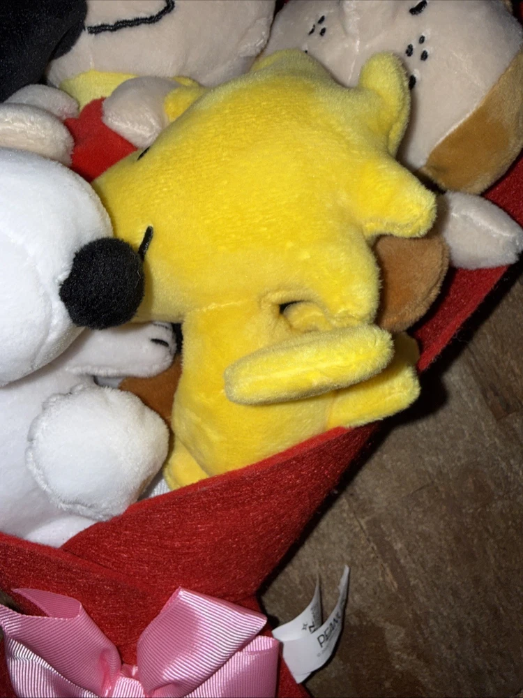 The product is a 16" Peanuts Valentine's plush bouquet featuring characters from the franchise including Snoopy, Woodstock, Charlie, and Lucy. Made of plush material and in multicolor, this collectible item is perfect for fans of the Peanuts series. The bouquet captures the essence of the beloved characters in a cute and cuddly form, making it a delightful addition to any animation merchandise collection.