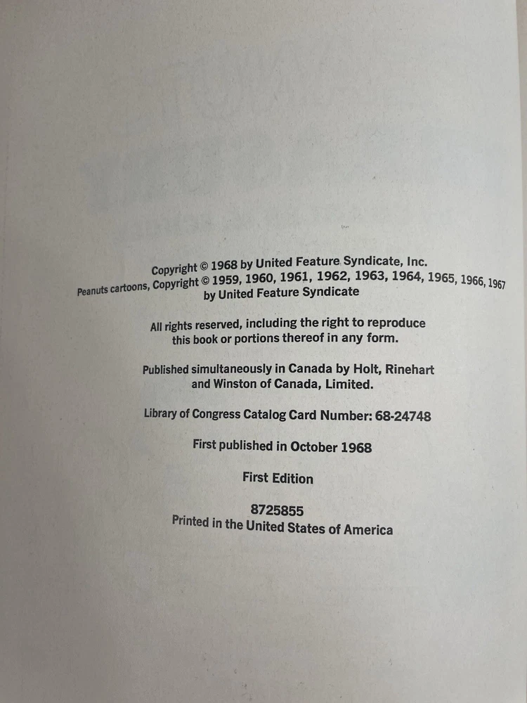 Original/Facsimile:OriginalCharacter Family:PeanutsTopic:ComicsPlace of Publication:United Statesgtin13:Does not applyPublisher:Holt, Rinehart and WinstonISBN:Does not applyRegion:North AmericaAuthor:Charles M. SchulzBinding:HardcoverIllustrator:Charles SchulzPersonalized:YesSeller Notes:“Good overall, Some wear to cover, sticker remnant inside cover, See photos”Country of Origin:United StatesSubject:ComicsLanguage:EnglishYear Printed:1968Special Attributes:1st Edition
