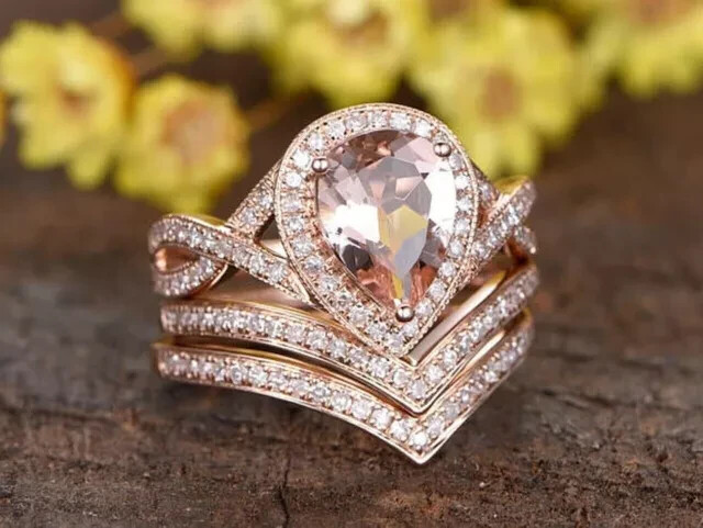 Pear Cut Simulated Peach Morganite Engagement Trio Ring Set in 14K Rose Gold Plated