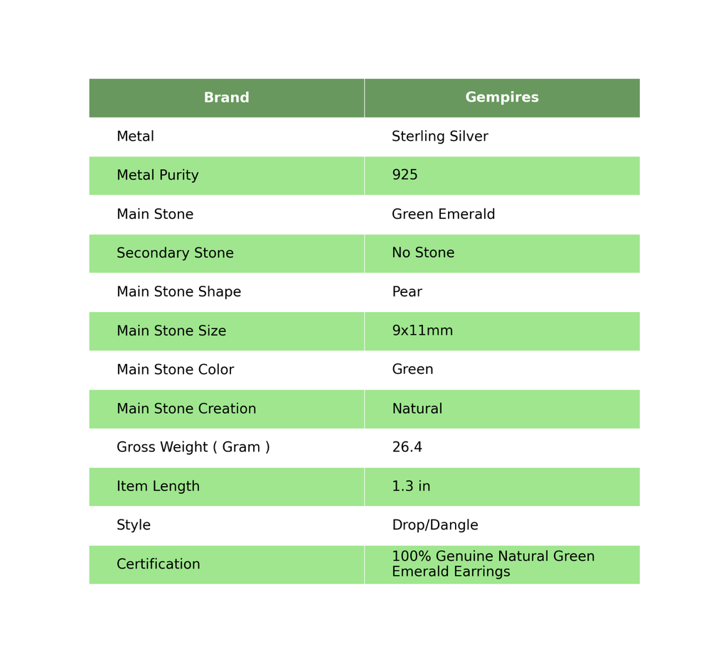 Welcome To Our Shop Gempires ------------------------------------------- Get this exotic and trendy 925 Sterling Silver Earrings studded with Green Emerald that will provide you a classy look. Flaunt your style and fashion with this stunning ornament. Pear Green Emerald Stone Dangle Drop Daughter Valentine Gift Earrings 925 Silver Check My Other Earrings Listings : Click Here SKU:- EE-155-5 Metal:- Sterling Silver Metal Purity:- 925 Gemstone:- Green Emerald Gemstone Color:- Green Gemstone Shape :- Pear Gemstone Creation :- Natural Stone Setting :- Bezel Earring Length:- 1.3 Inches Earring Width:- Inches ___________________________________________________________________ Shipping Handling - Free Standard Shipping all over the world Handling Time - 2 to 5 BUSINESS Days Delivery Time - 7 to 20 Days ( Various on destination ) _________________________________________________________________ Returns - 1.We provide a 100% Money Back Guarantee, excluding shipping costs, within 30 days from the date of item receipt. 2.The item must not be altered or damaged in any way shape or form. 3.Upon receipt of the aforementioned items, your payment will be promptly refunded. 4.Please be so kind as to contact us via email in order to acquire comprehensive return instructions before proceeding with the return of the merchandise. 5.Kindly be advised to allocate a maximum period of 1 business day for the processing of all returns, in order for the appropriate credit to be applied. 6.Sizing does not affect the return policy. _________________________________________________________________ FAQ's - Q.1 ARE THE ITEMS YOU ARE SELLING BRAND NEW? We exclusively offer brand-new products, refraining from the sale of pre-owned jewelry. Our entire jewelry collection is composed of 100% natural, conflict-free pieces. We do not engage in the trade of imitation or lab-grown gemstones and diamonds. Q.2 WHAT ARE YOUR BUSINESS HOURS? we operate 24x7 as we have a dedicated team who works in different shifts to deliver the services to our valuable customers. ________________________________________________________________ Gempires is committed to delivering customers an unparalleled experience through the provision of exquisite handmade jewelry, meticulously crafted to uphold the most exacting standards of quality. Our operations encompass dual roles as both discerning connoisseurs and skilled artisans within the realm of jewelry making. We proudly hold an extensive proficiency in the fine art of enhancing gemstones, allowing us to harmonize them seamlessly with diverse aesthetic inclinations. We are delighted to extend to you the privilege of curating your very own jewelry collection. This collection will be graced by the presence of genuine and splendid natural gemstones, each possessing an innate authenticity and beauty that is truly unparalleled. **** STAY BLESSED ALWAYS*****